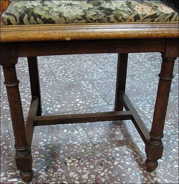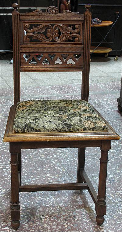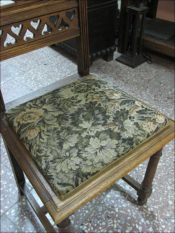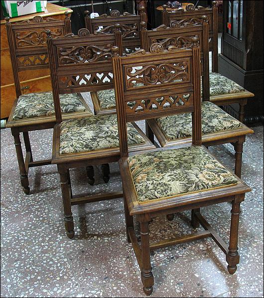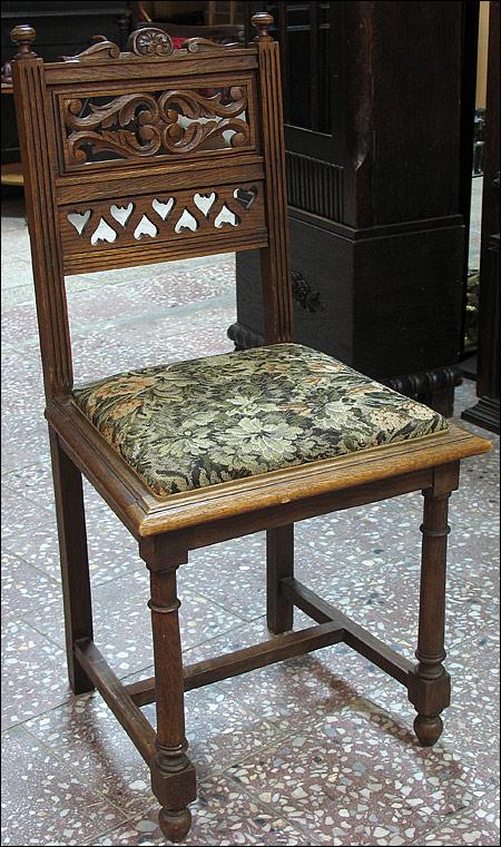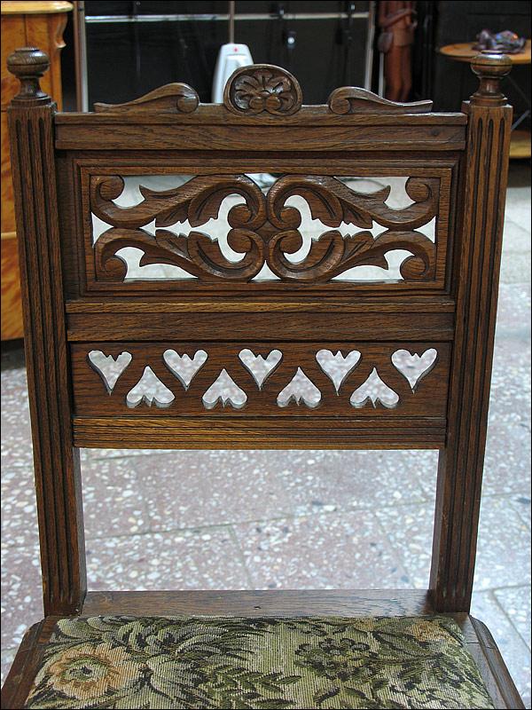 Piękne, eklektyczne krzesła. Oparcia zdobione bogatą snycerką, stelaż dębowy, gobelinowa tapicerka, przednie nogi toczone.13100478