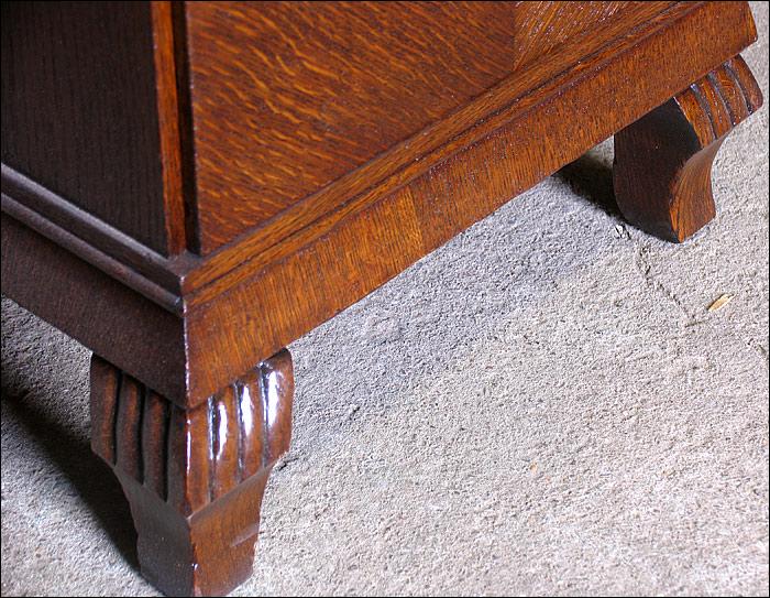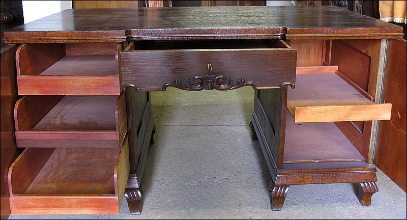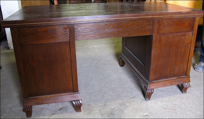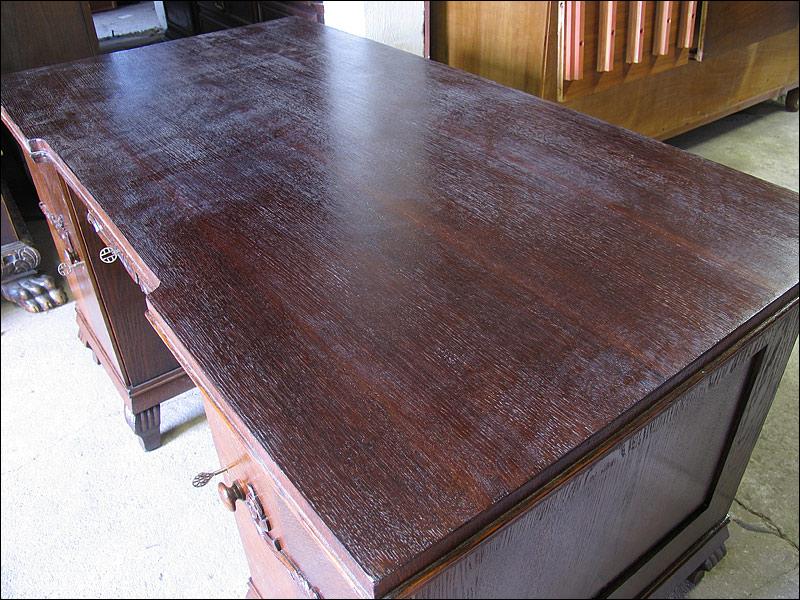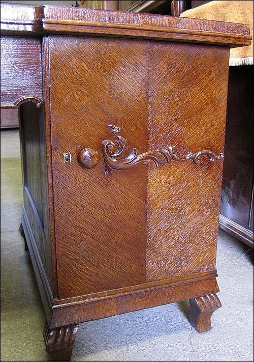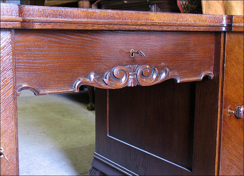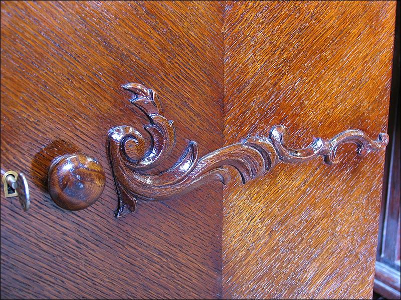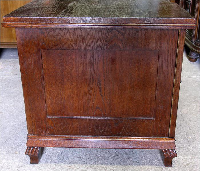 Dębowe biurko, zdobione snycerką. Fornir na drzwiczkach układany pod kątem, półka z prawej strony wysuwana. Dwustronne.181032