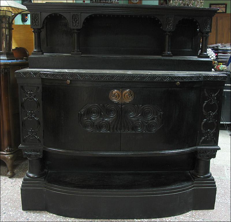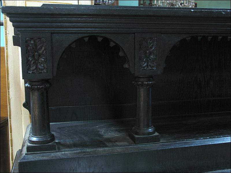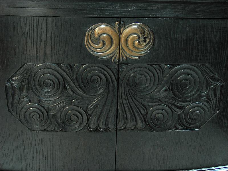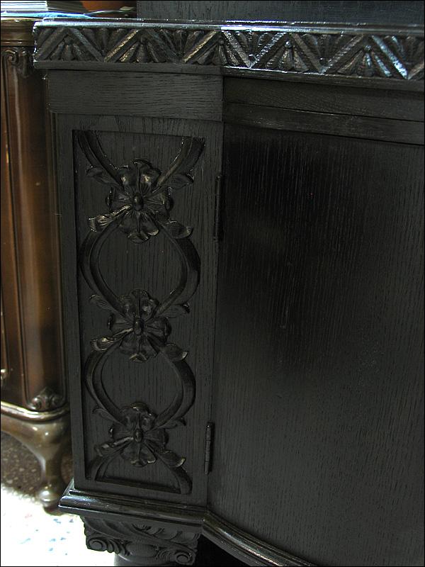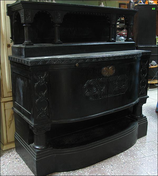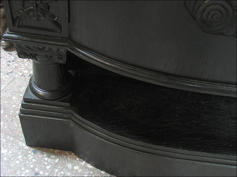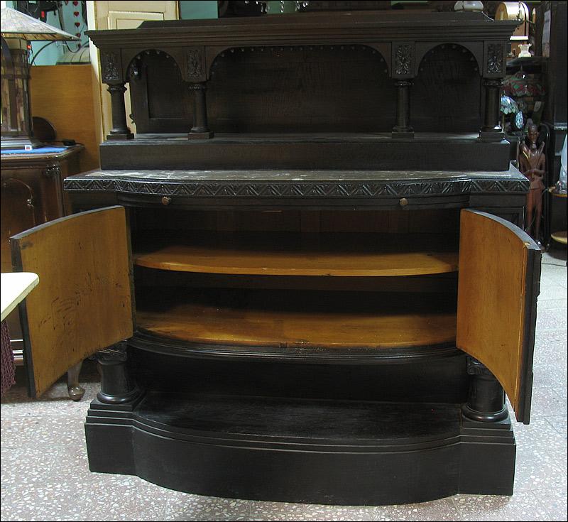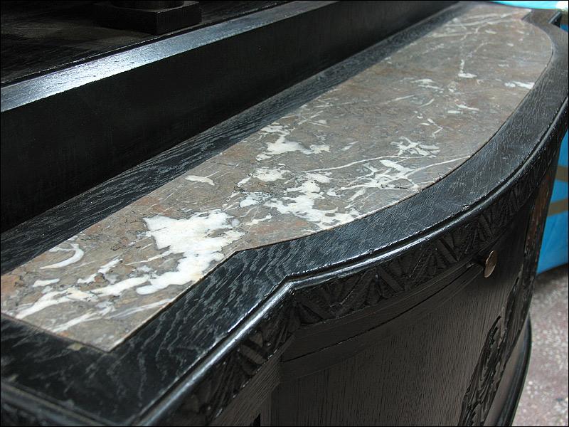 Piękny dębowy(a) bufet/komoda z giętymi drzwiami. Nadstawka dwupoziomowa połączona filarami, blat komody z marmuru , w dolnej części wnęka. Górny wieniec komody ze snycerką również z boków, wysuwany blat z drewna. Dolna półka przykrywa wnękę, z której można zrobić skrytkę.021101713