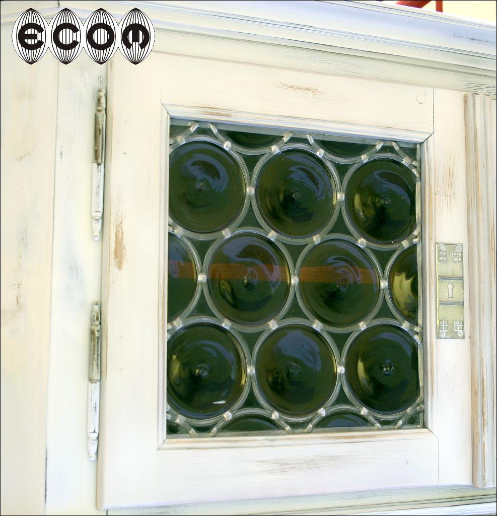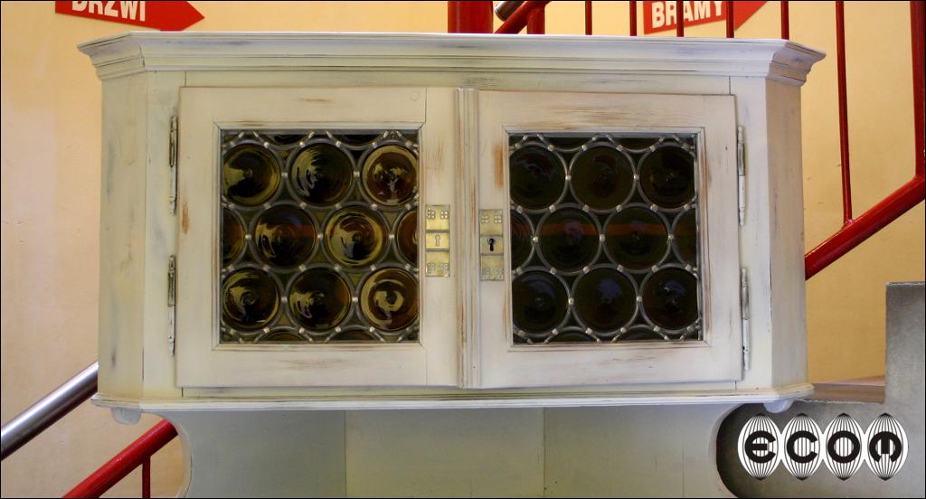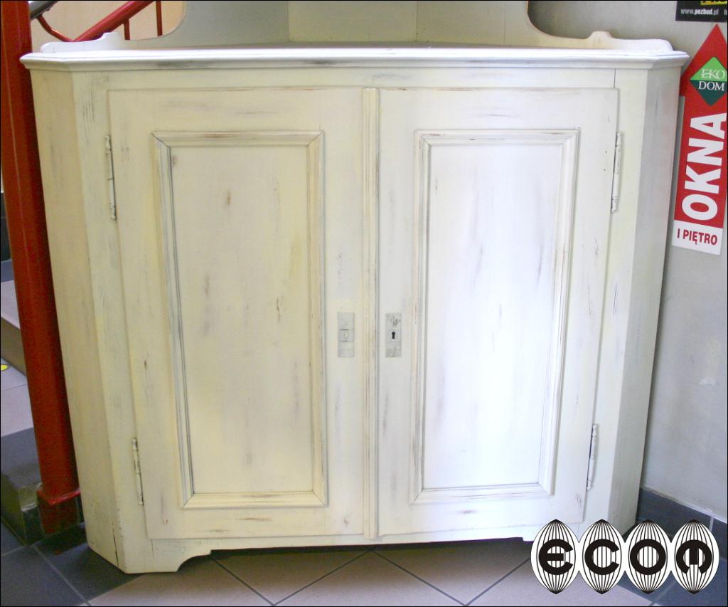 Narożnikowy kredens z przełomu XIX i XX wieku. W górnej części szafka zamykana przeszklonymi drzwiczkami. Poniżej blatu szafka z dwoma półkami oraz szufladą. Mebel pomalowany na biało, dodatkowo został przetarty.