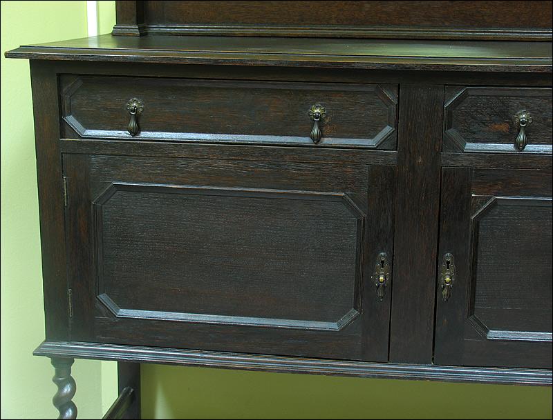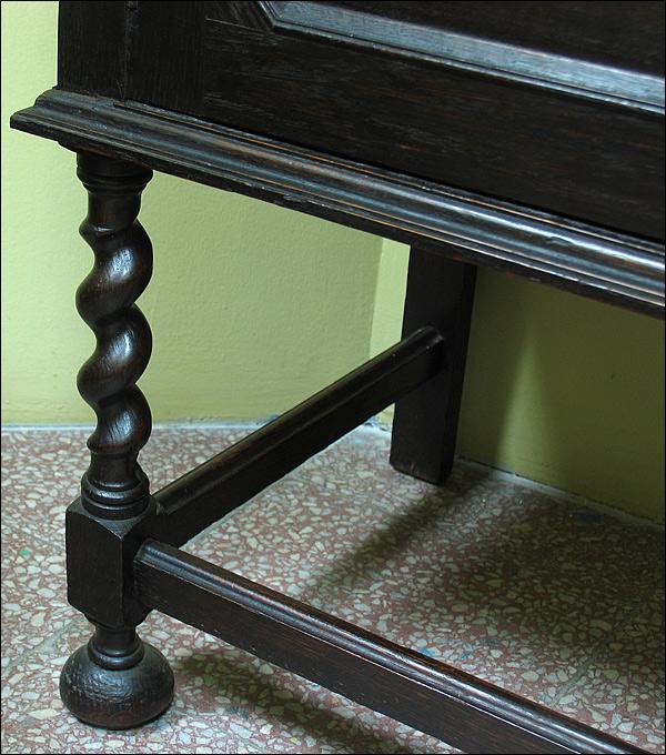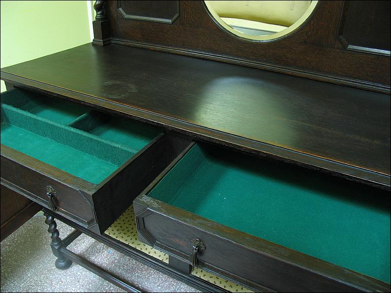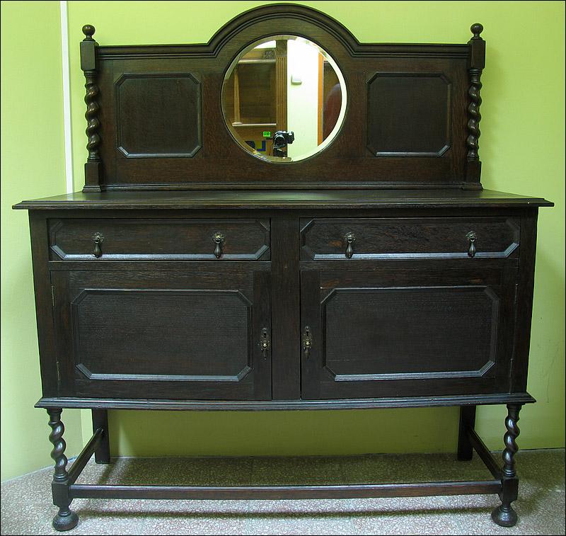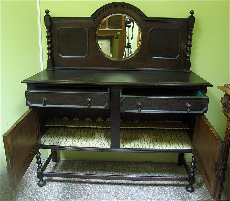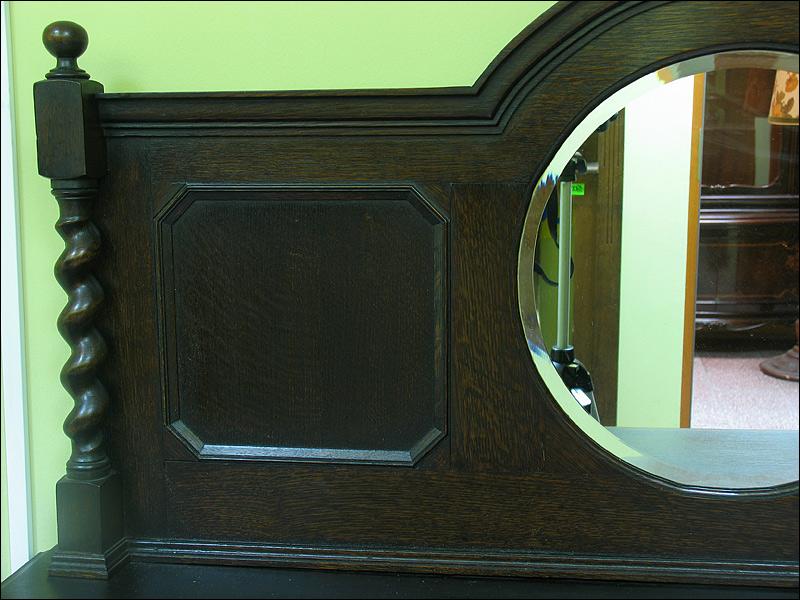 Dębowa komoda z okrągłym, szlifowanym lustrem w nadstawce. Piękne spiralnie toczone przednie nogi i filary w nadstawce.21110726
