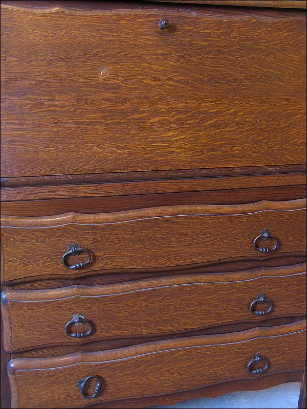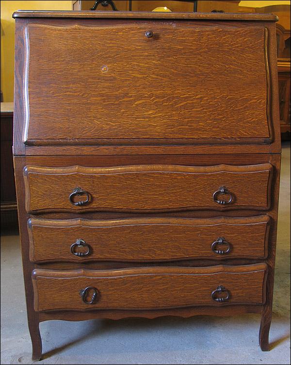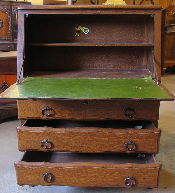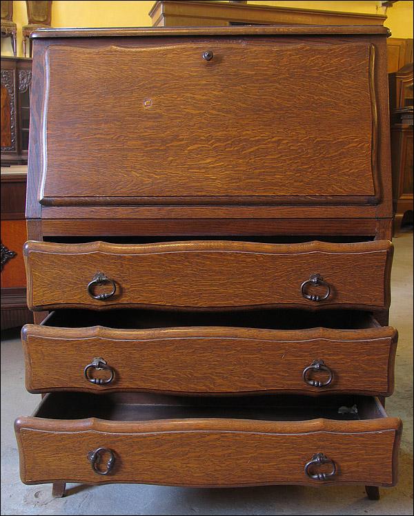 Dębowy, stylizowany sekretarzyk. Przednie nogi podginane, pod blatem trzy szuflady. Mamy w ofercie dwa takie meble, komplet idealny dla bliźniaków.310115