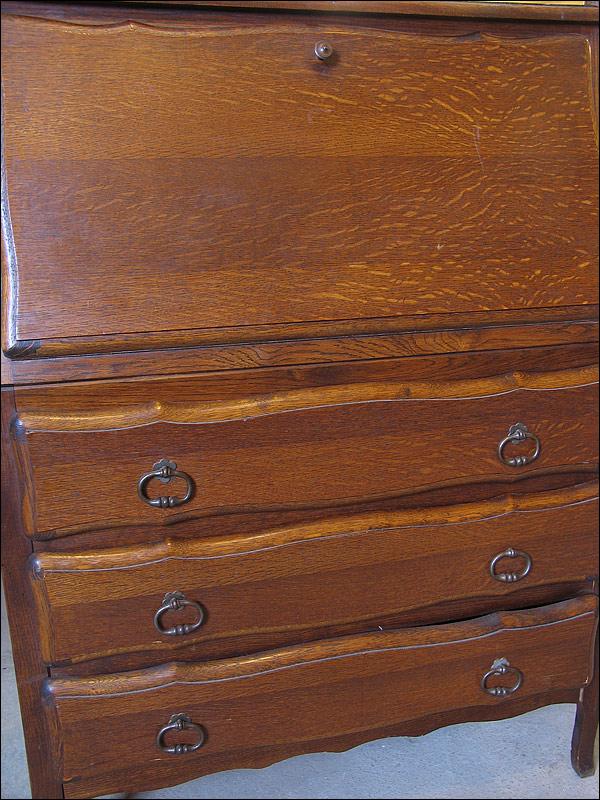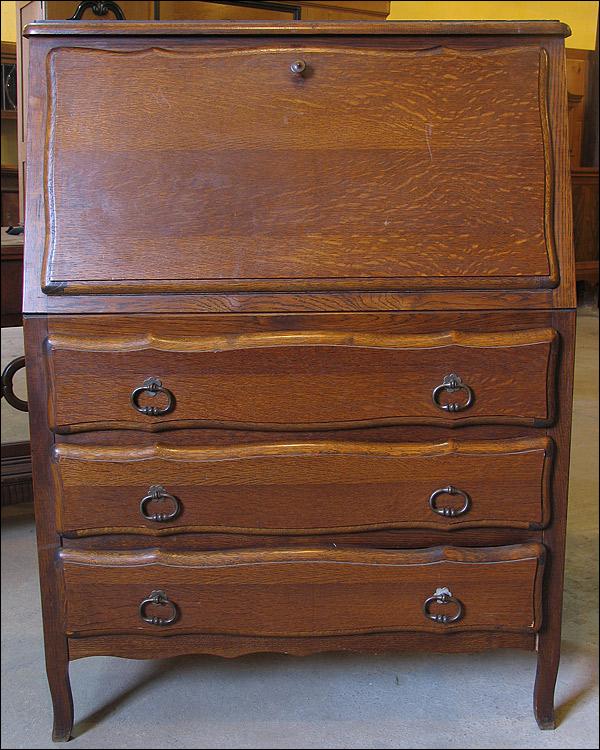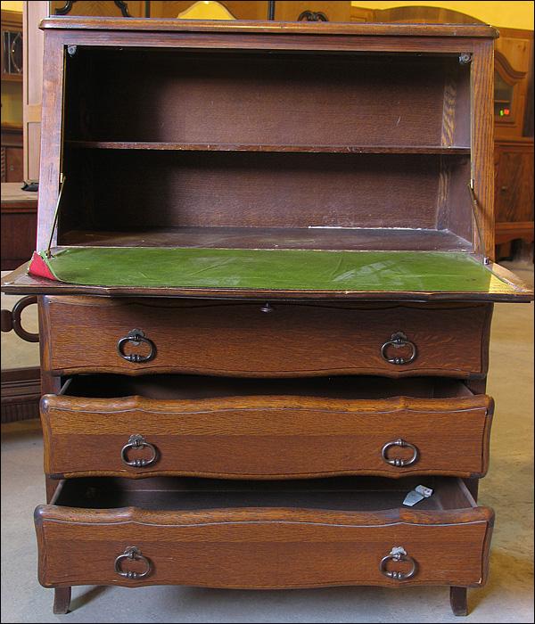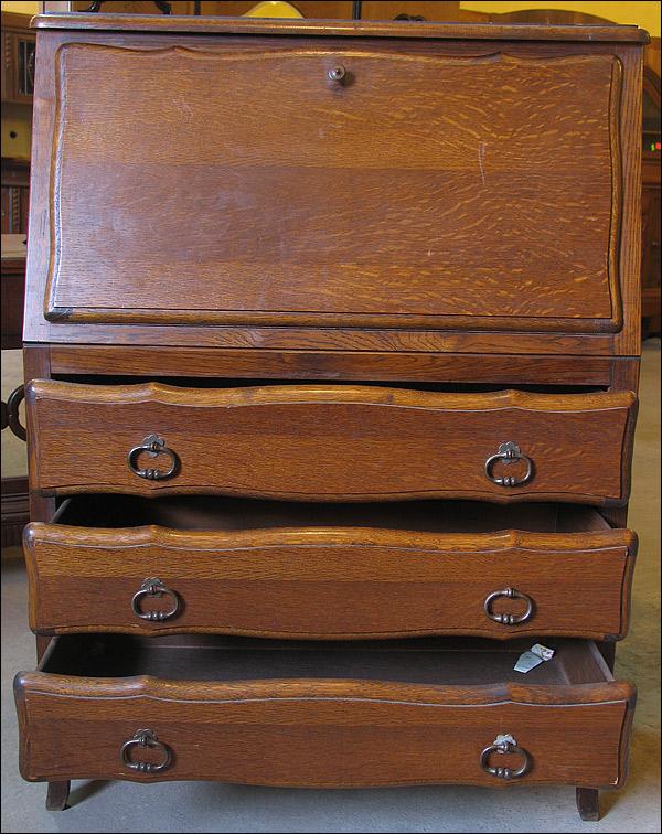 Dębowy, stylizowany sekretarzyk. Przednie nogi podginane, pod blatem trzy szuflady. Mamy w ofercie dwa takie meble, komplet idealny dla bliźniaków.310115