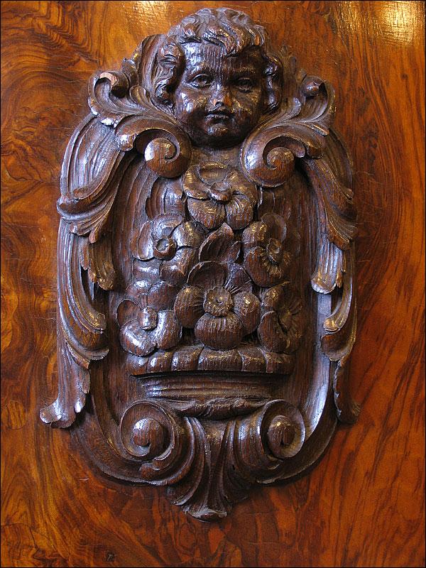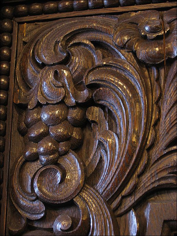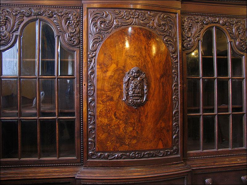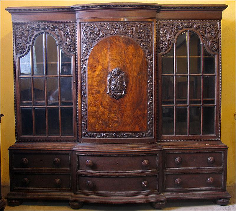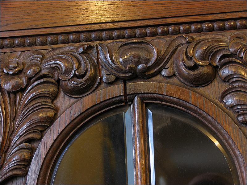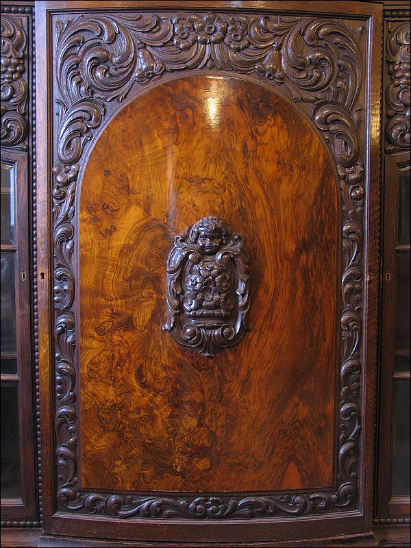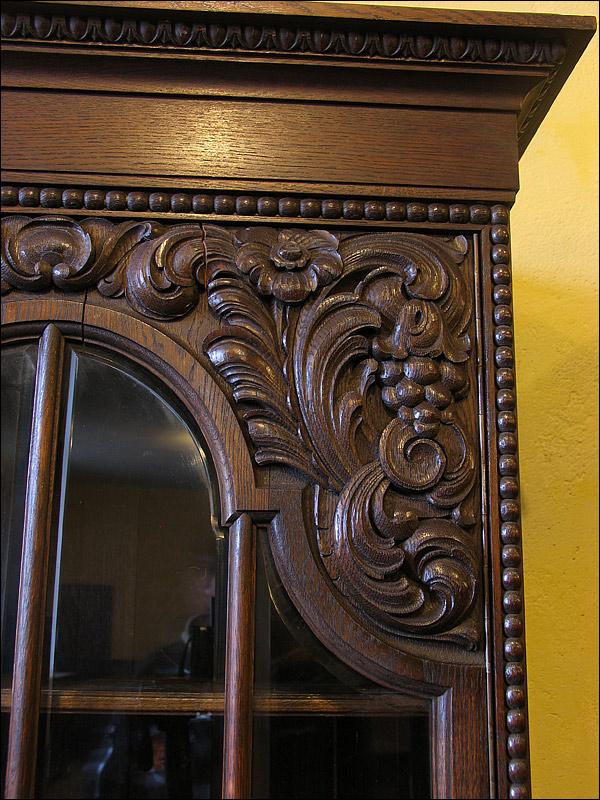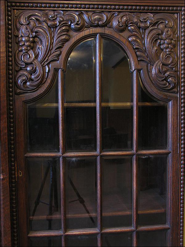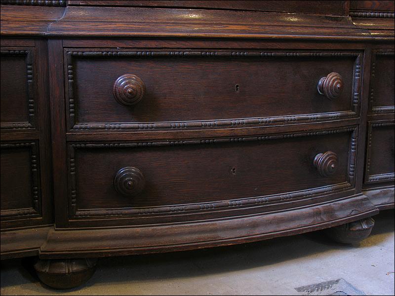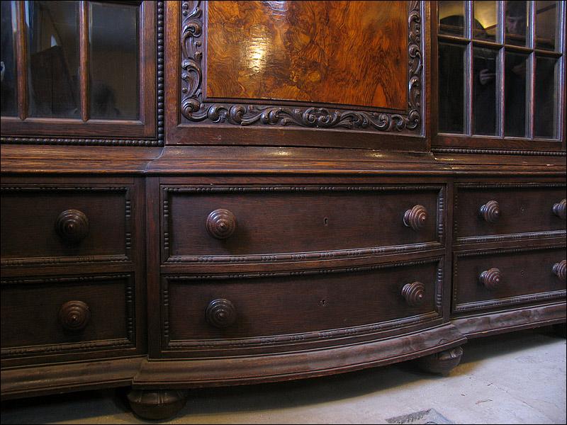 Dębowa biblioteka z okresu międzywojennego. Gięty środek mebla, drzwi środkowe z wstawką z orzecha, bogata snycerka, szybki szlifowane. Sześć szuflad w dolnej części podnosi funkcjonalność mebla.000008245