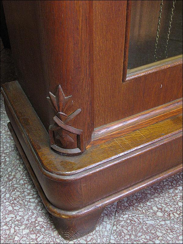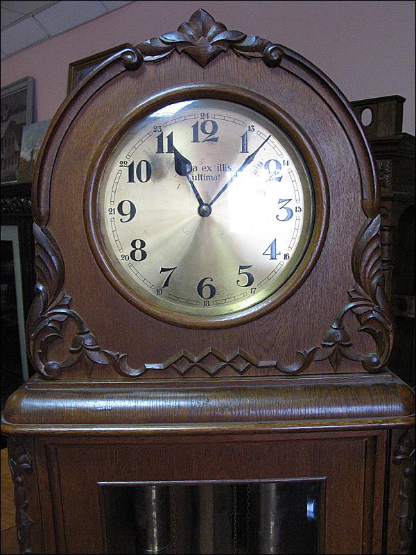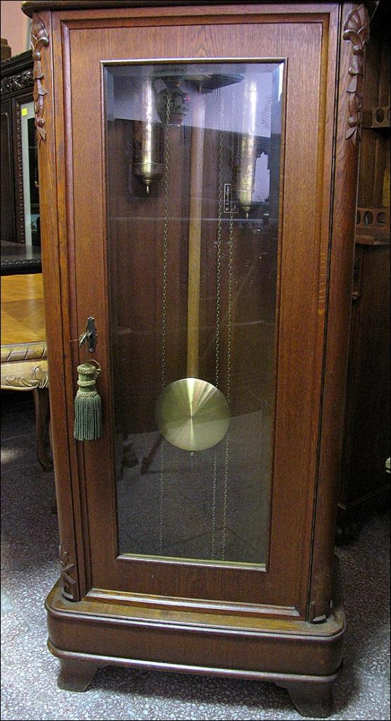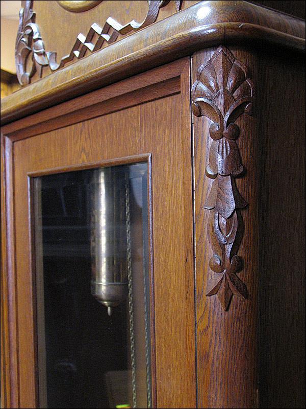 Kwadransowy (3-wagowy) zegar baba z elementami art deco. Skrzynia dębowa, na cyferblacie szkło soczewkowe. Na drzwiach szyba szlifowana. 100302069