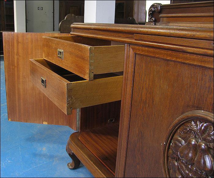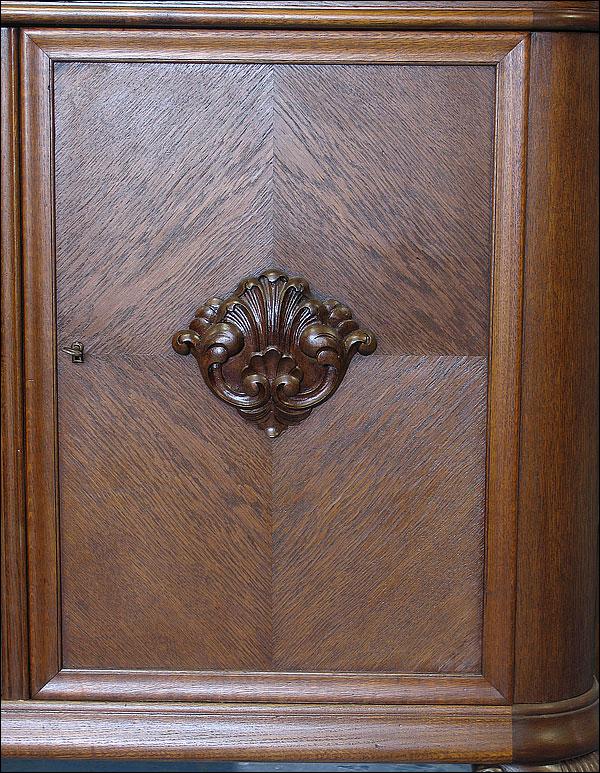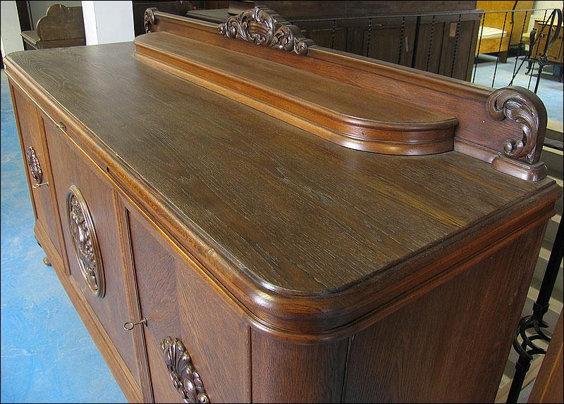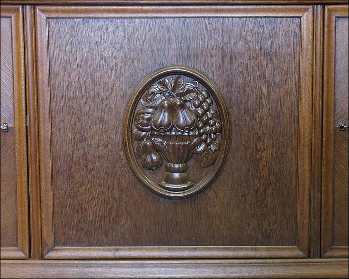 Dębowy bufet z okresu międzywojennego. Aplikacje na drzwiach oraz nadstawka ze zdobieniami.10030681