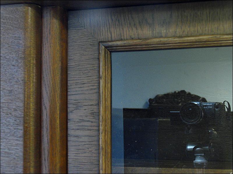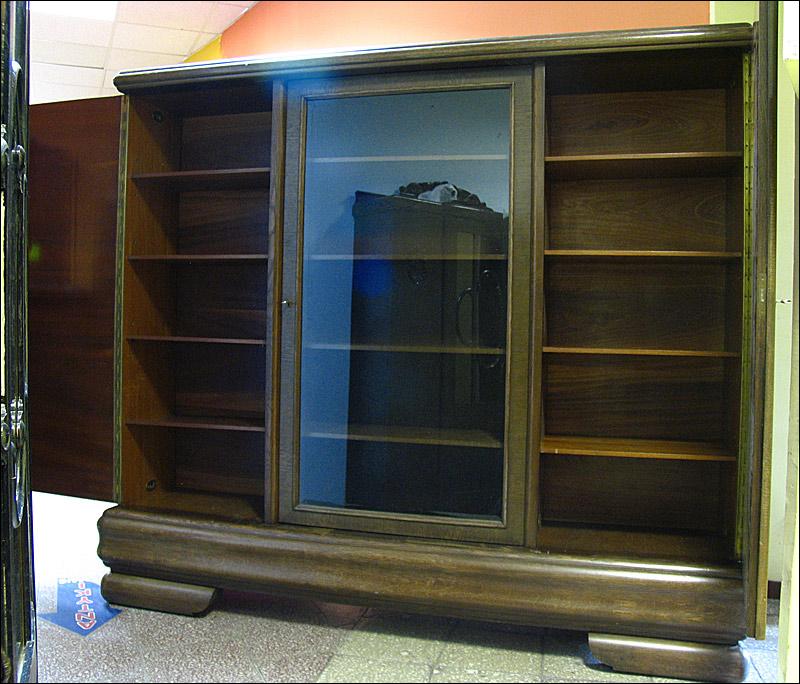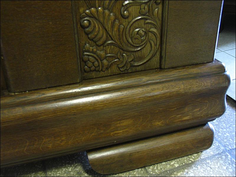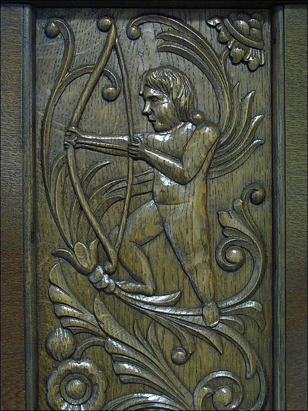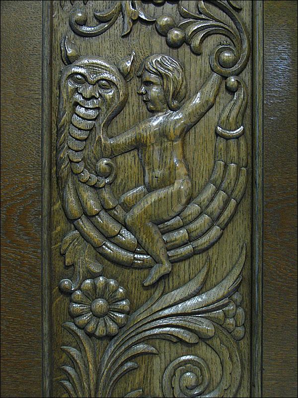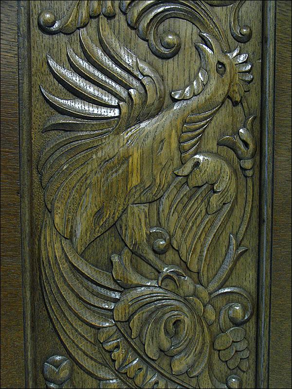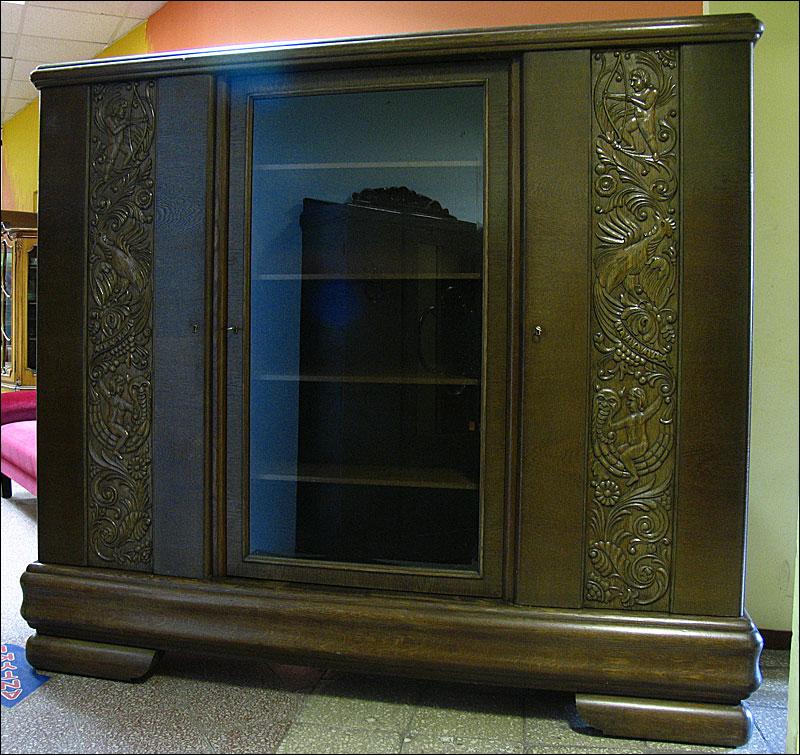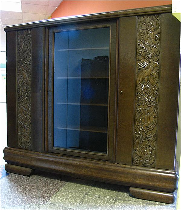 Dębowa biblioteka Art Deco z bogatą snycerką na drzwiach, przedstawiającą scenki rodzajowe, ptaki amorki. Szyba szlifowana. 190508156