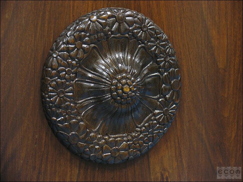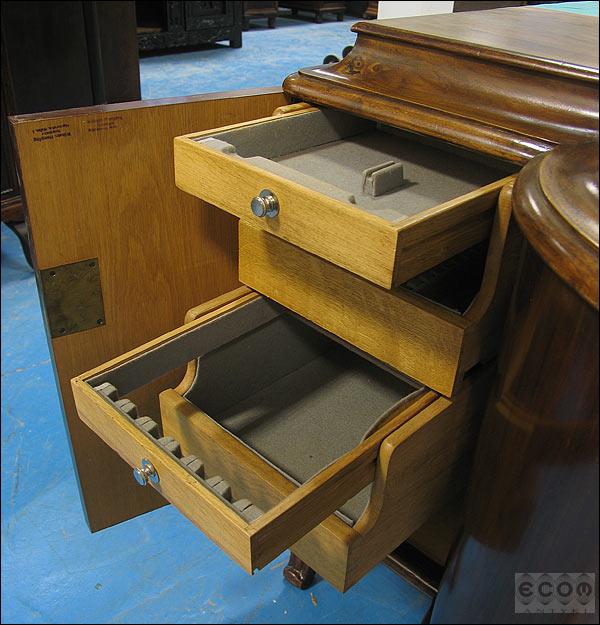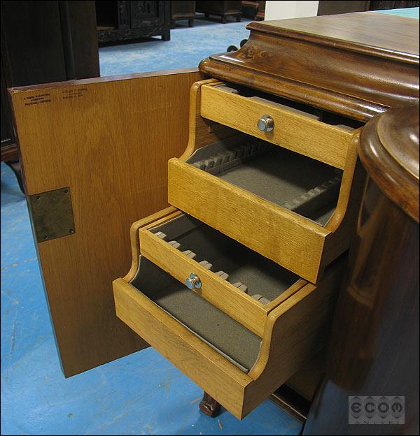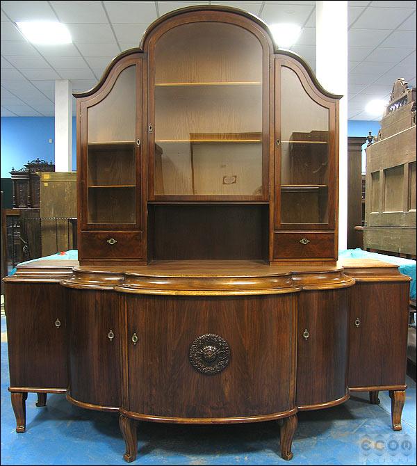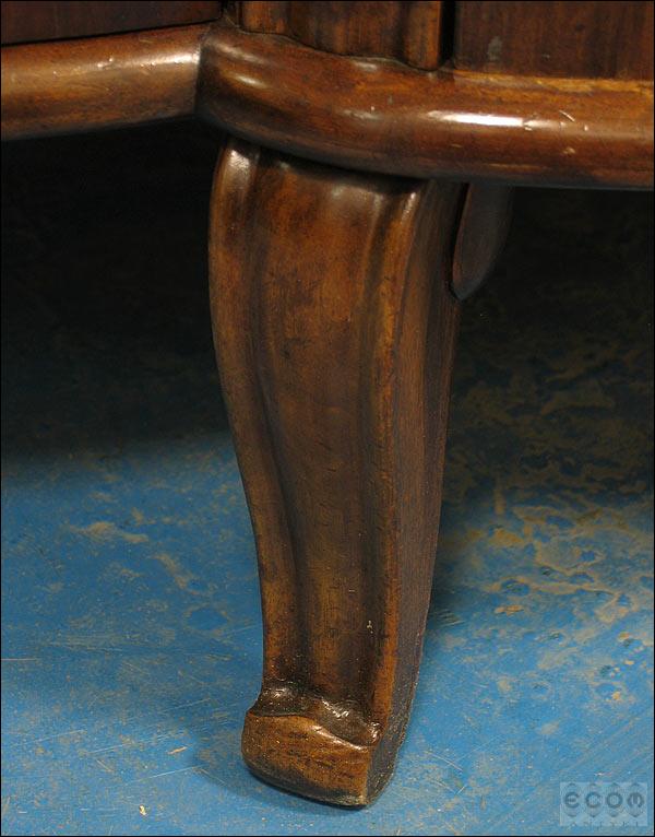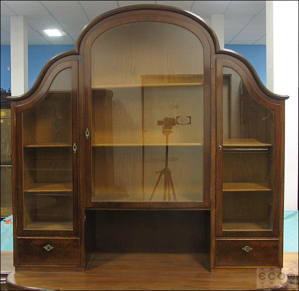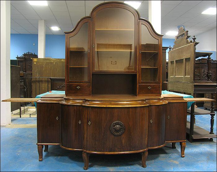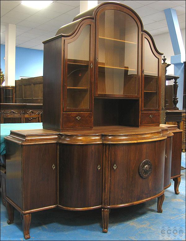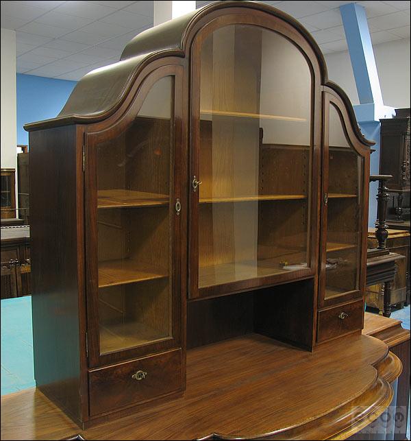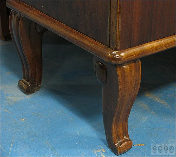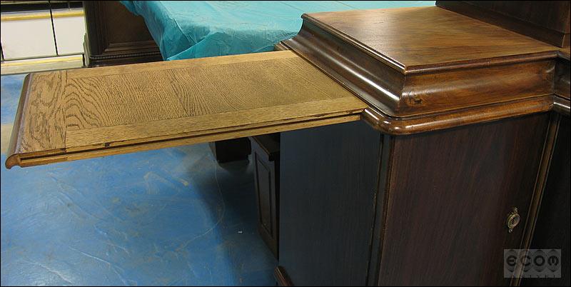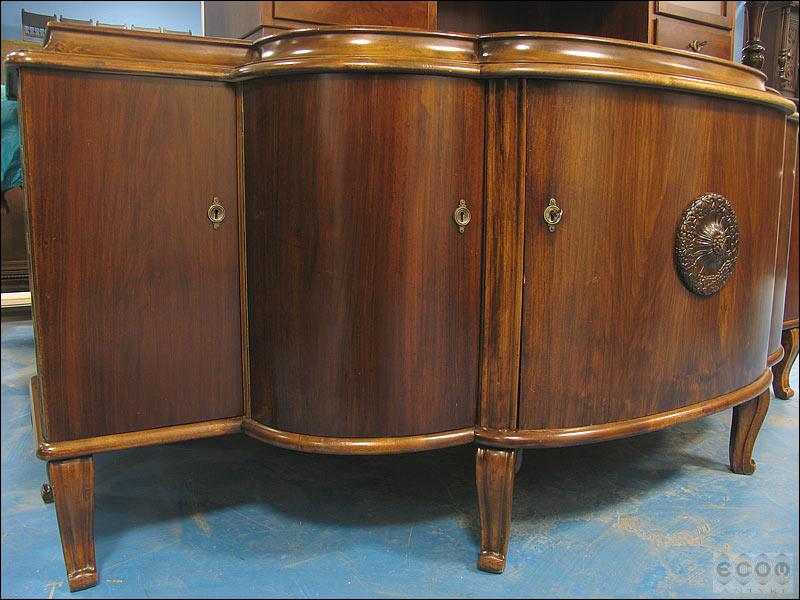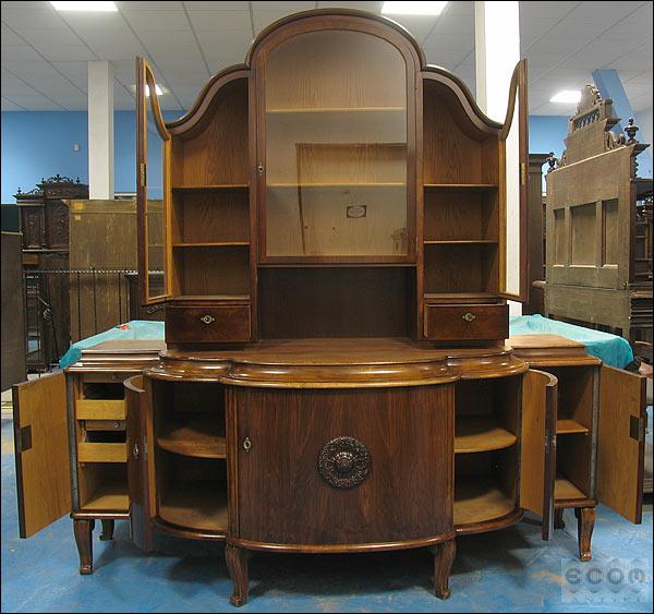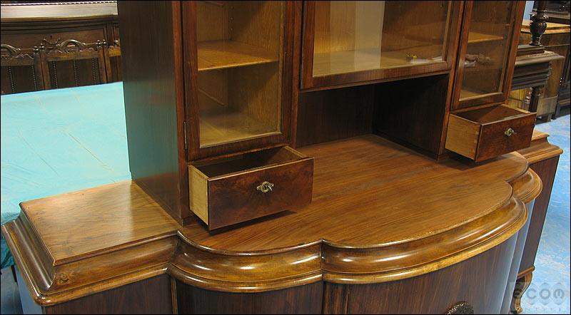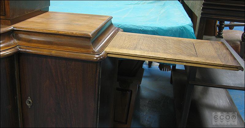 Orzechowy kredens Art Deco na giętych nogach. W dolnej części gięte drzwiczki, lata 30-te, funkcjonalne wysuwane blaty boczne.000008189