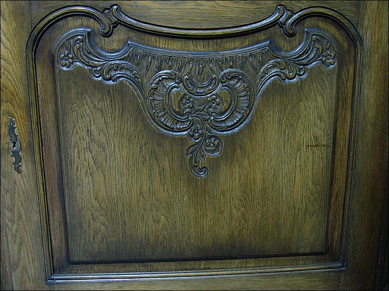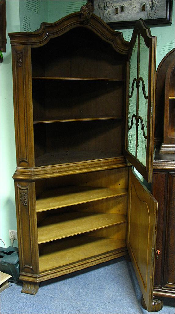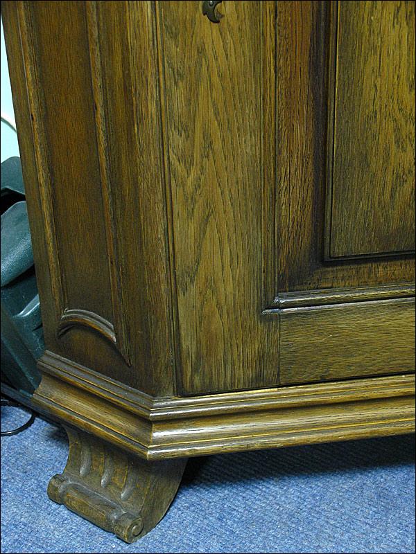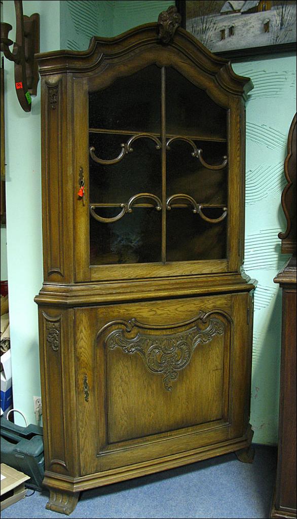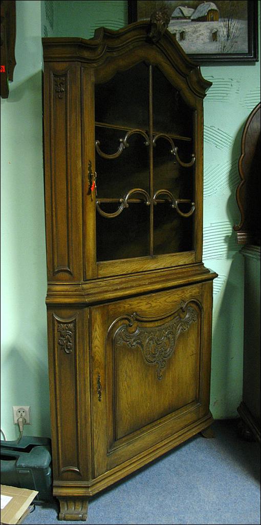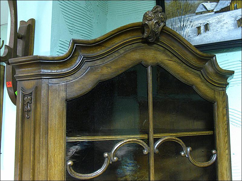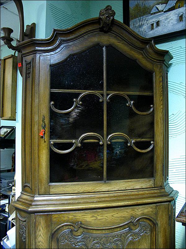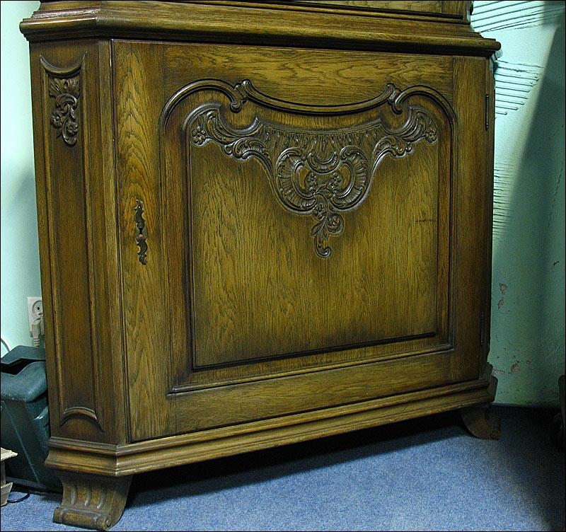 Piękna dębowa witryna narożnikowa w stylu barokowym . Szprosy na szybach, bogata snycerska w dolnej części mebla, drobne, gustowne aplikacje snycerskie na bokach mebla.0000080675