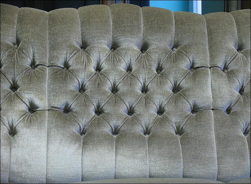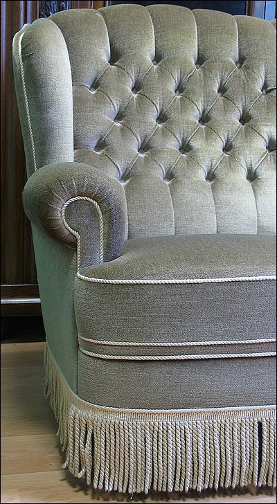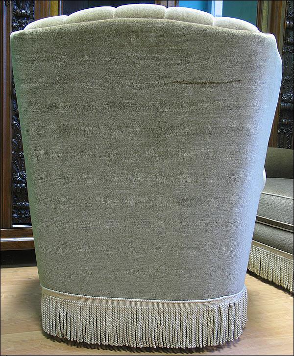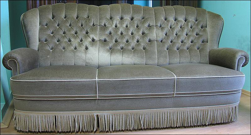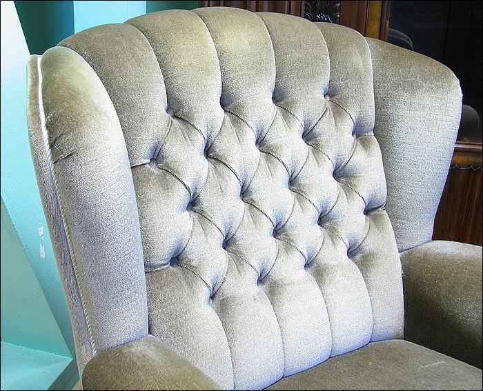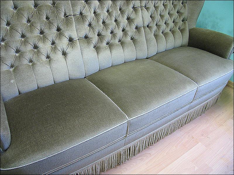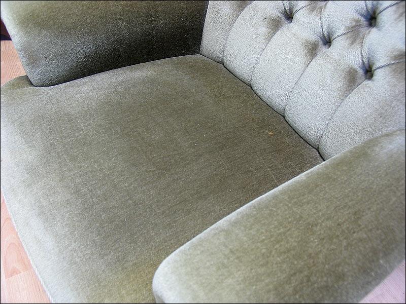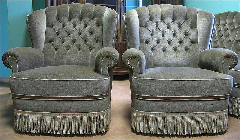Komplet wypoczynkowy, w skład którego wchodzi sofa i 2 fotele. Wygodne siedziska, fotele na kółkach. Kolor tapicerki w odcieniu oliwkowym, na zdjęciach widoczny kolor zbliżony do szarego ze względy na materiał w specyficzny sposób odbijający światło.2510080512