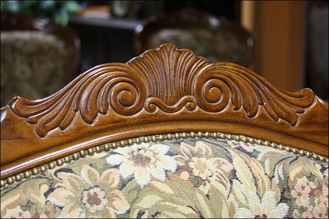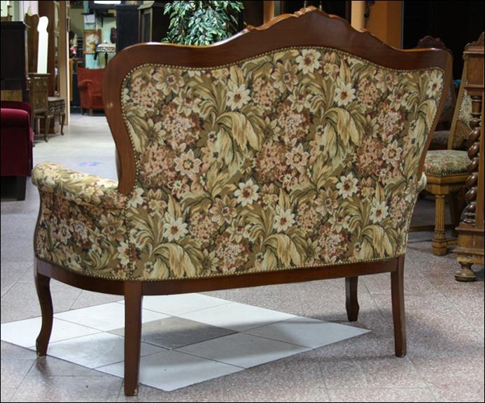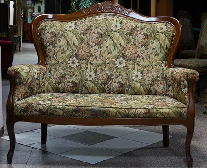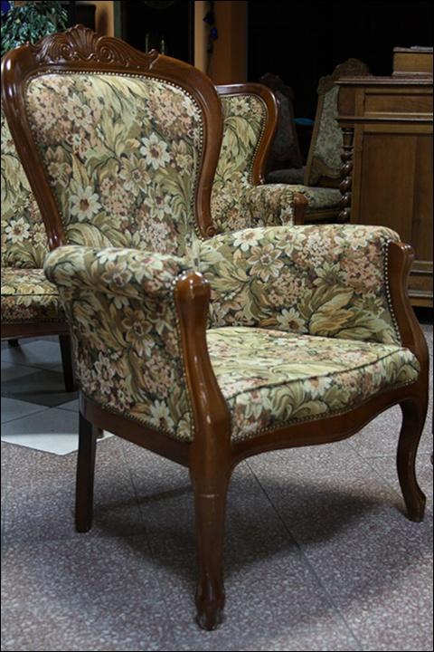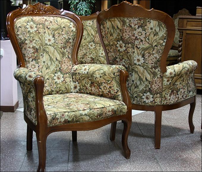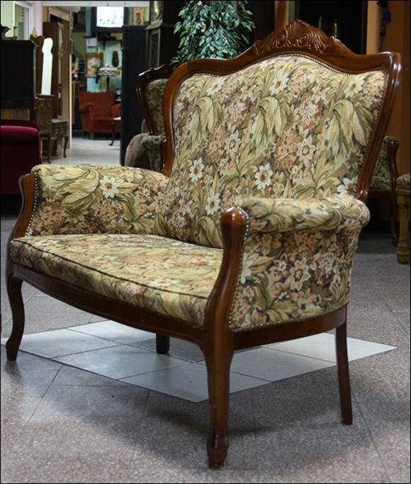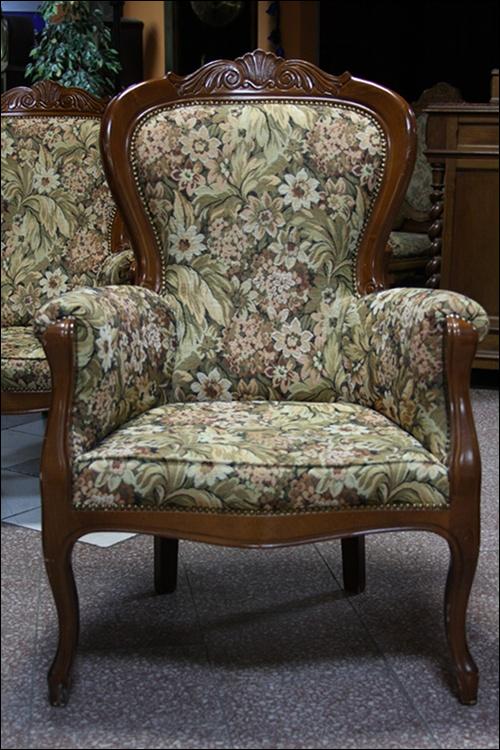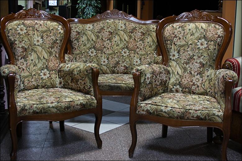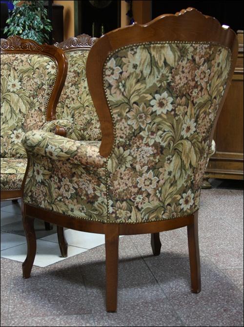 Zestaw sofa 2-ka i dwa fotele w Biedermeier'owskim stylu. Delikatne zdobienia na zwieńczeniu mebli. Tapicerka z wzorami kwiatowymi w odcieniach oliwkowo brązowych. Stelaż barwiony na orzech.1301091118