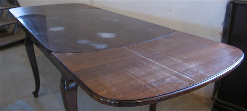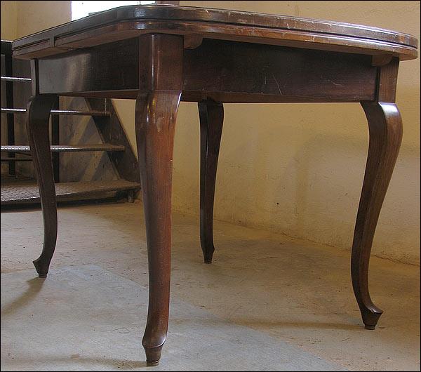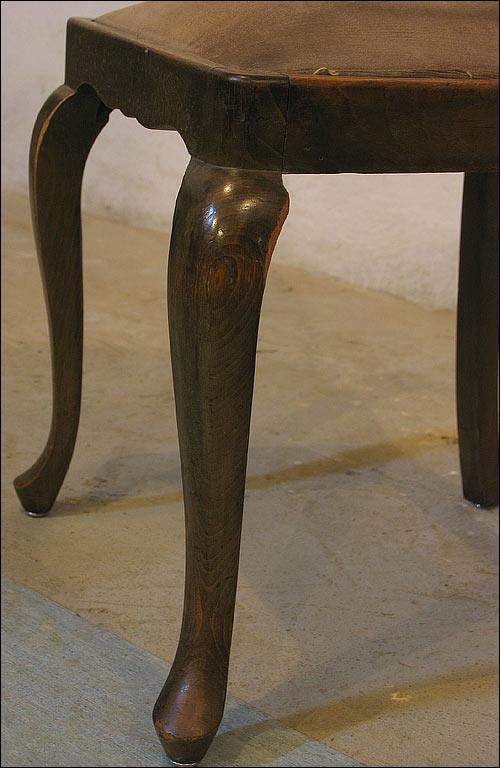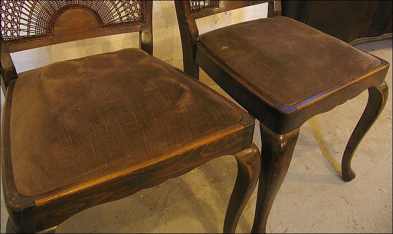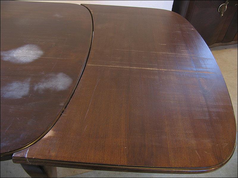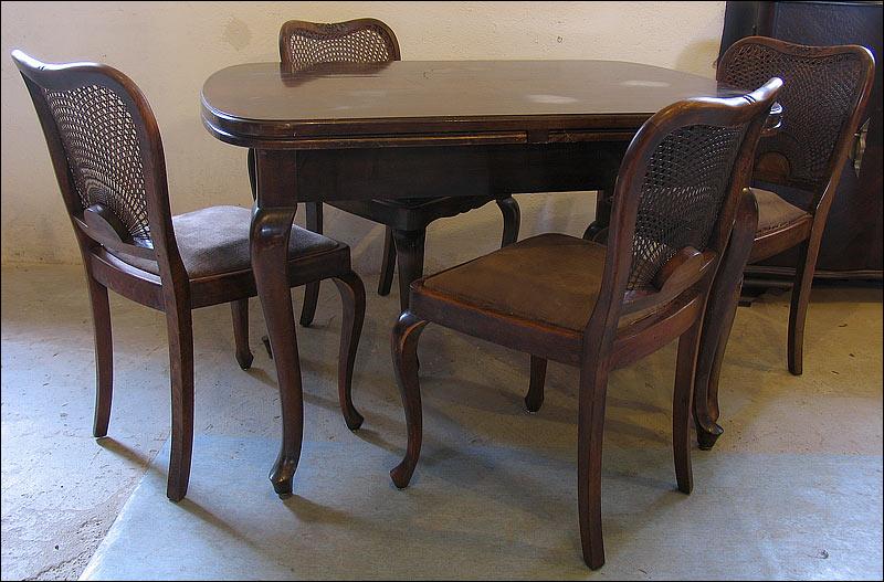 Orzechowy stół + 4 krzesła w stylu Chippendale. Stół rozkładany, na pięknych, giętych nogach. Zwieńczenie oparć krzeseł z delikatną snycerką, siedziska na sprężynach.1301090918