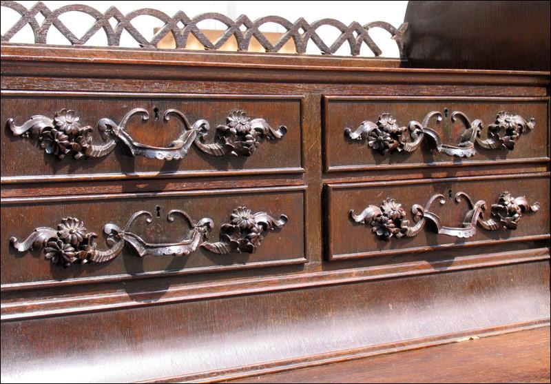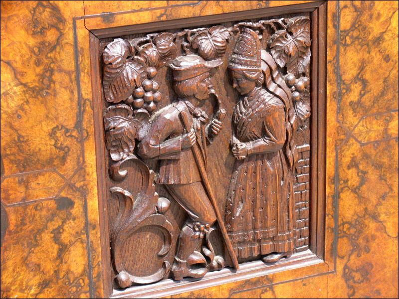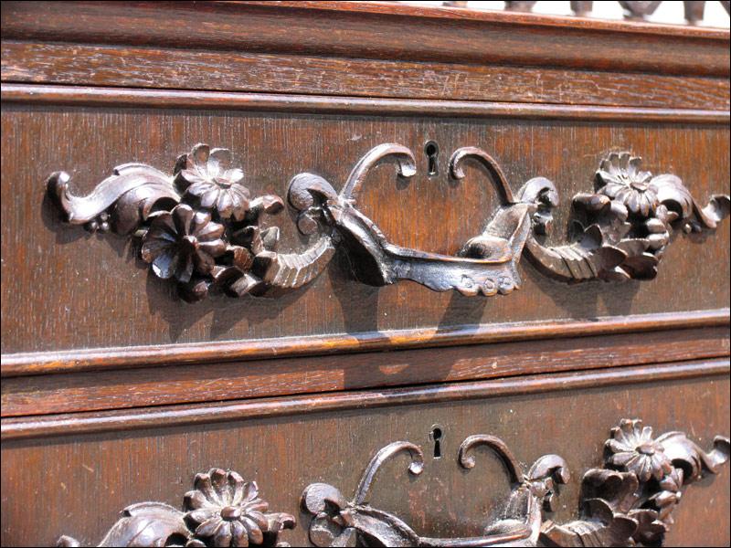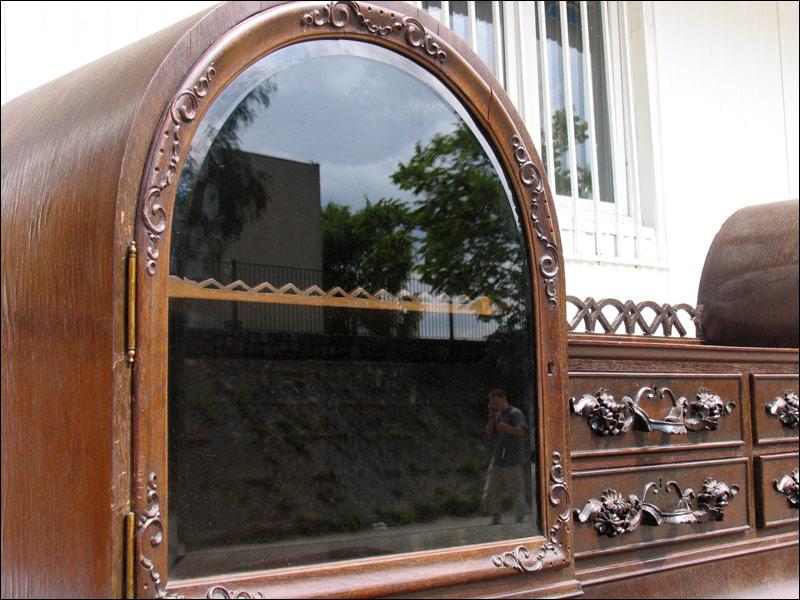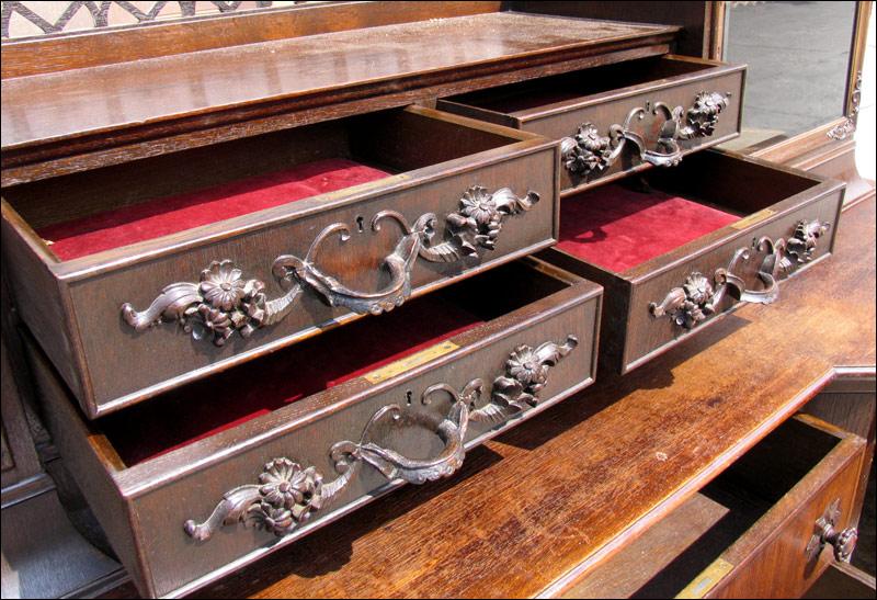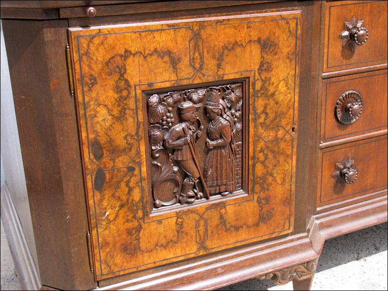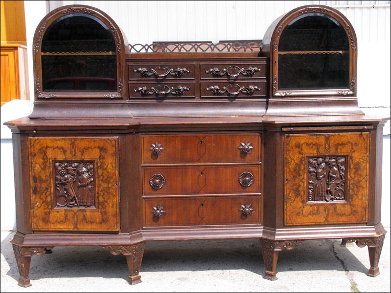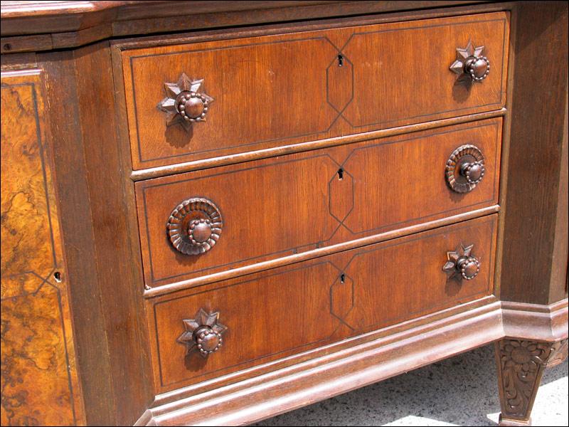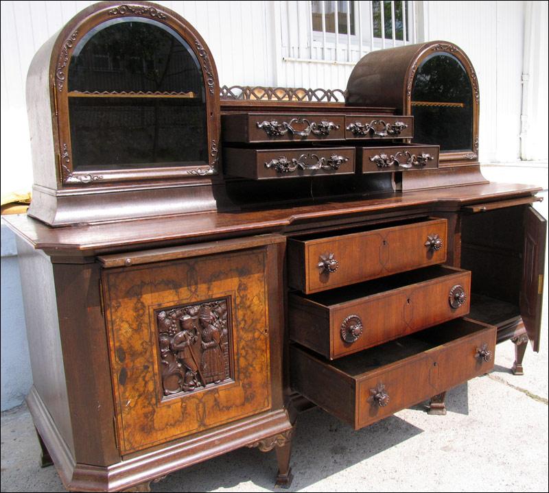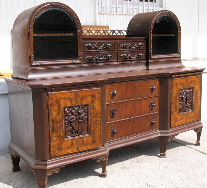 Przepiękny, niesamowity kredens z przełomu XIX i XX wieku. Każda część tego mebla przyciąga uwagę oglądającego. W dolnej części na drzwiach czeczoty orzechowe z intarsjami, w środku piękne rzeźbione zdobienia, szuflady w dolnej części intarsjowane z pięknymi uchwytami. Nogi o ciekawym kształcie. W części górnej na uwagę zasługują rzeźbione uchwyty szuflad, świadczące o bardzo wysokiej klasie mebla, same szuflady wyłożone są wewnątrz welurem, szyby w witrynkach szlifowane, pomiędzy nimi ciekawe ażurowe zwieńczenie.