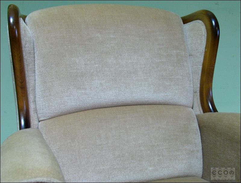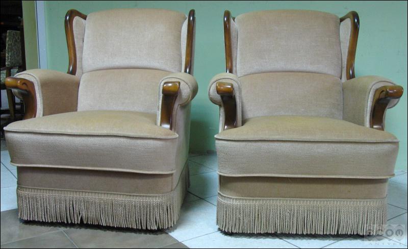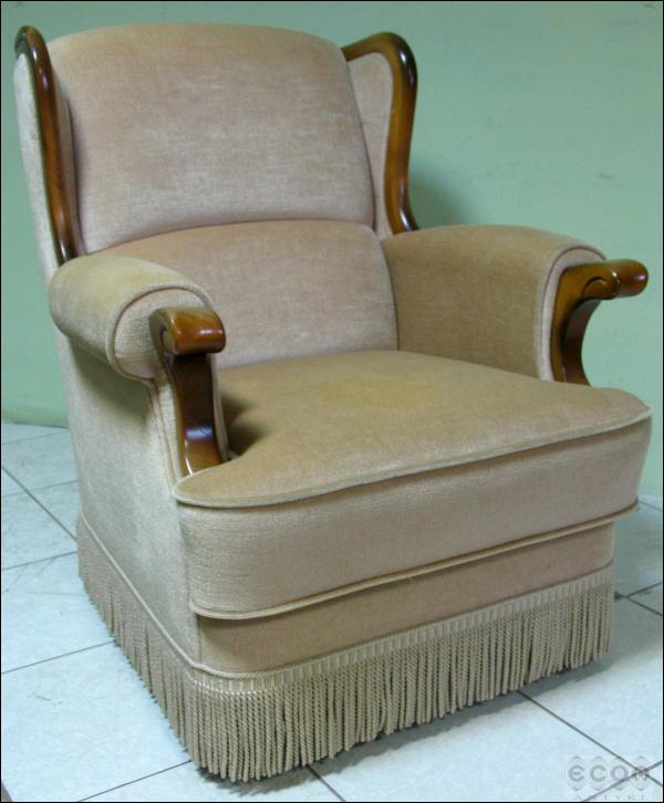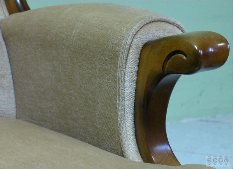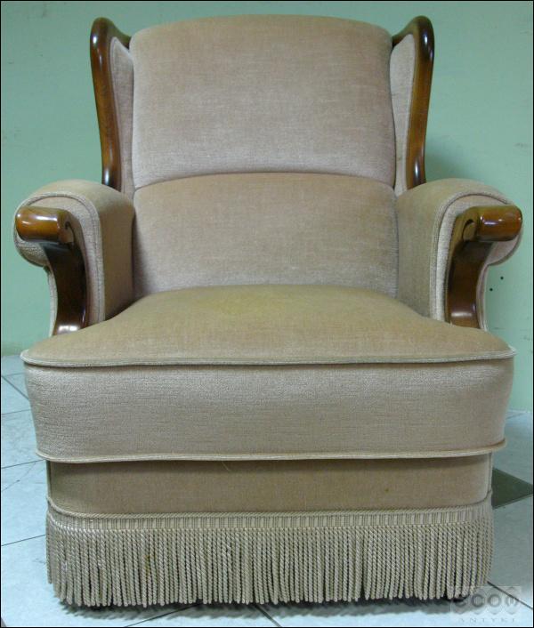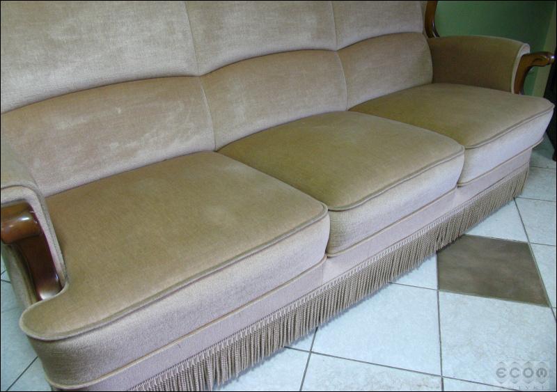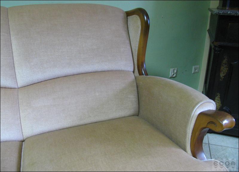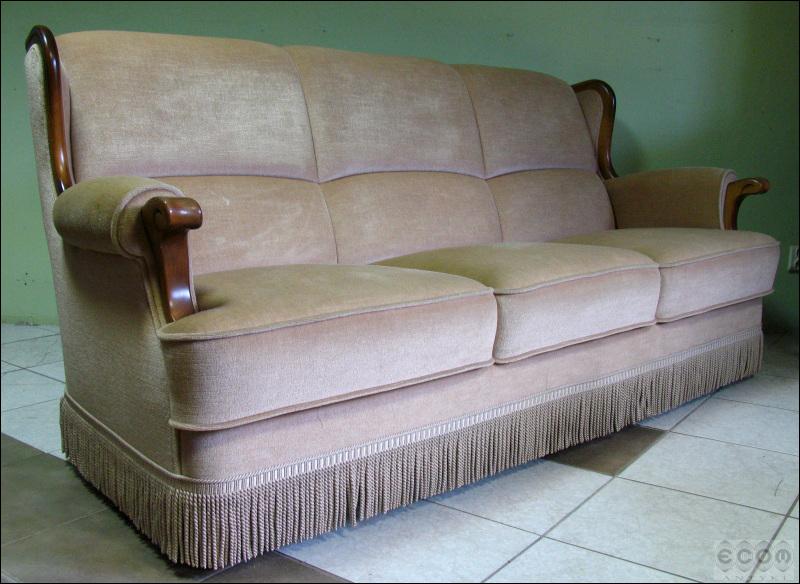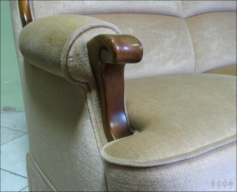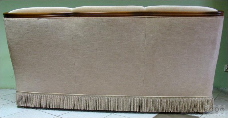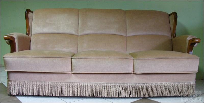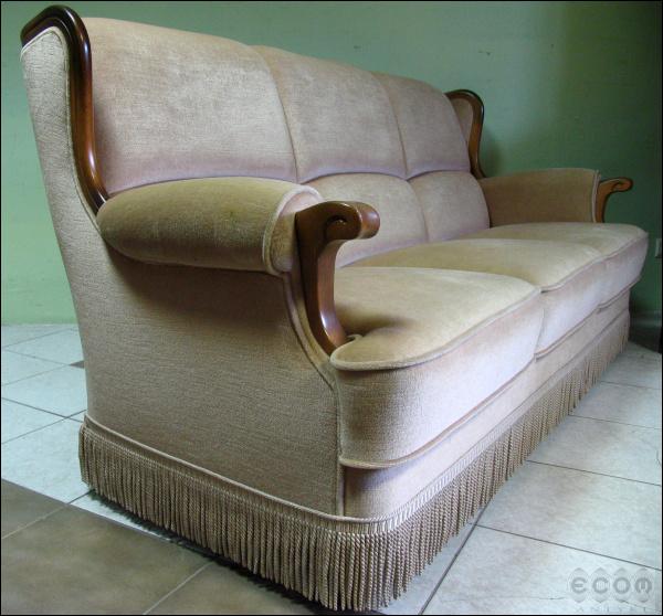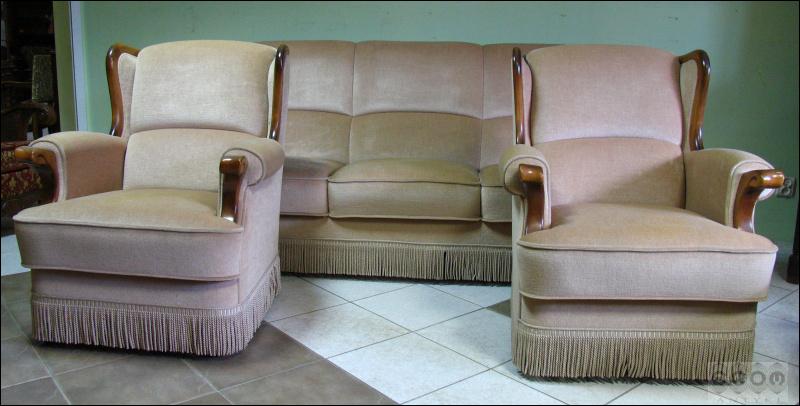 Stylizowany komplet wypoczynkowy, w skład którego wchodzi sofa i dwa fotele. Stelaż z drzewa liściastego, zarówno fotele jak i sofa z wygodnymi siedziskami.