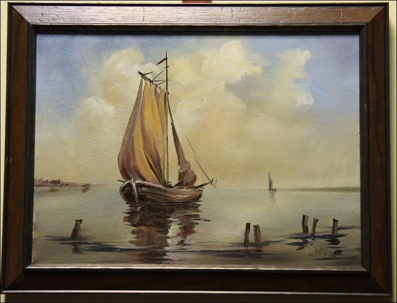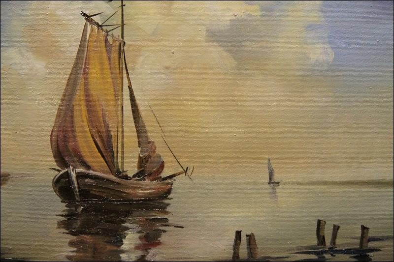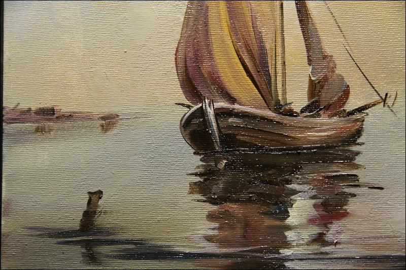 Sielski pejzaż rzeczny. Obraz olejny na płótnie przedstawiający rybaków podczas połowów. Spokojny klimat obrazu wprowadza w dobry nastrój. Olej na płótnie. Miniatura pędzla Jerzego Gella. Więcej o artyście poniżej. Obraz można nabyć z ramą w cenie 360 zł. Stan: bardzo dobry 231110115