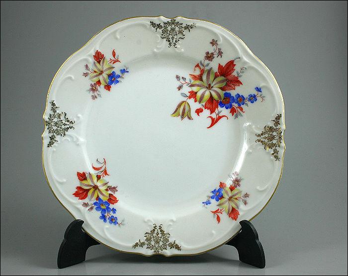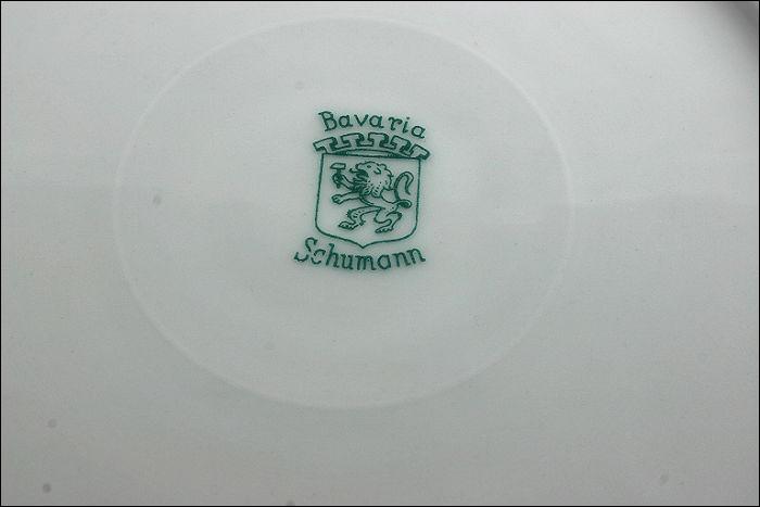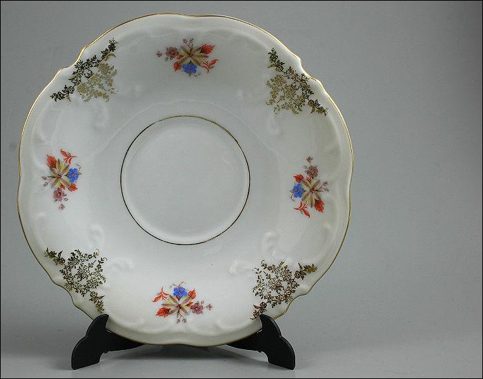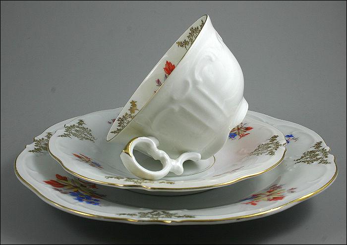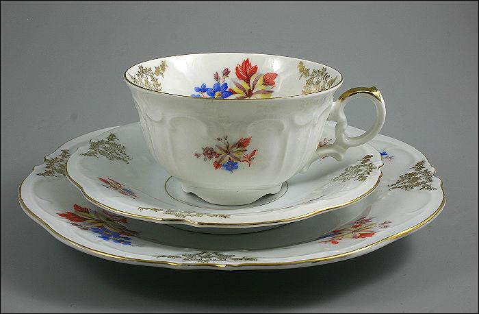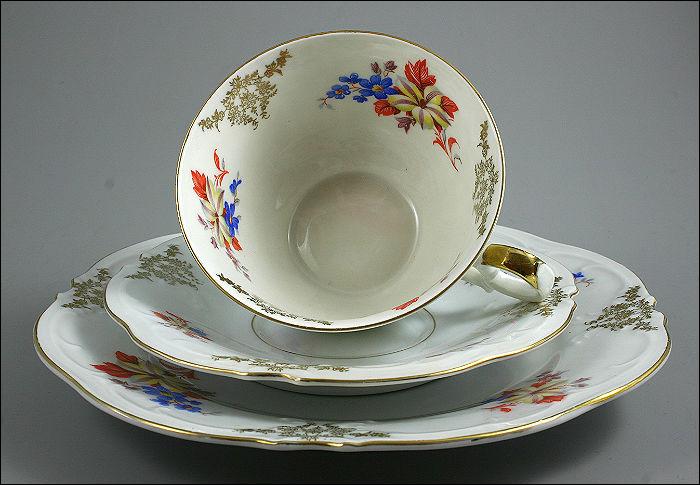 Zestaw śniadaniowy Schumann ze złotymi zdobieniami. Filiżanka, spodek oraz talerz posiadają sygnatury widoczne na zdjęciach.