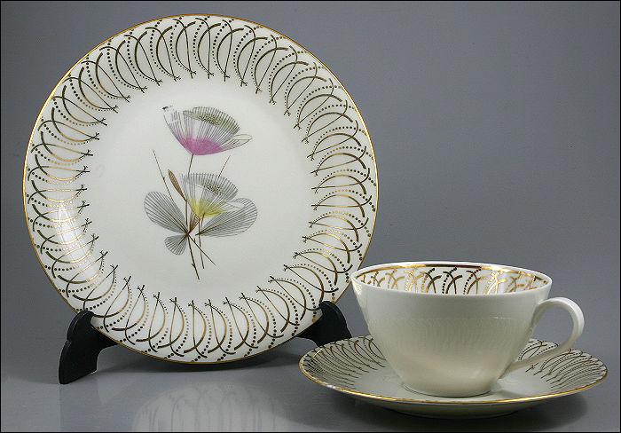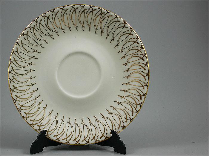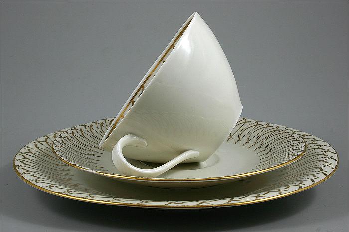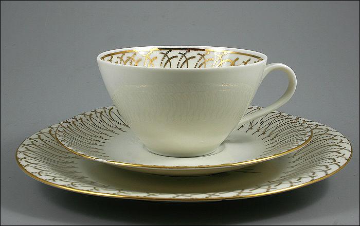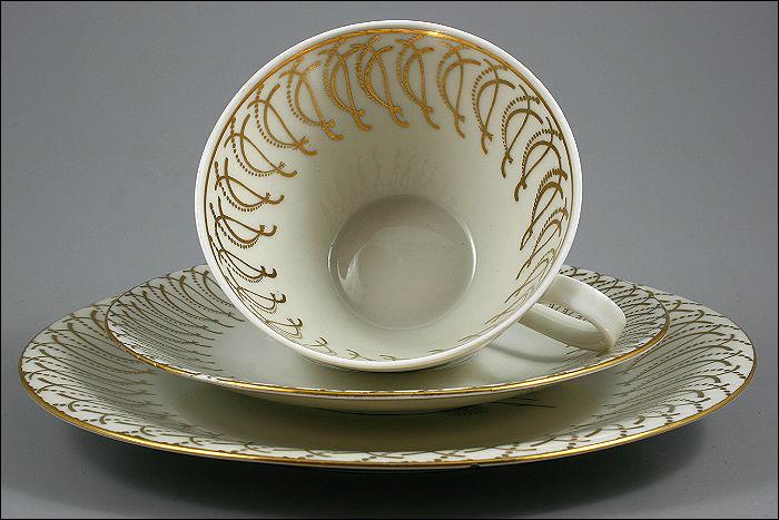 Zestaw śniadaniowy ze złotymi zdobieniami i motywem kwiatu na talerzu.