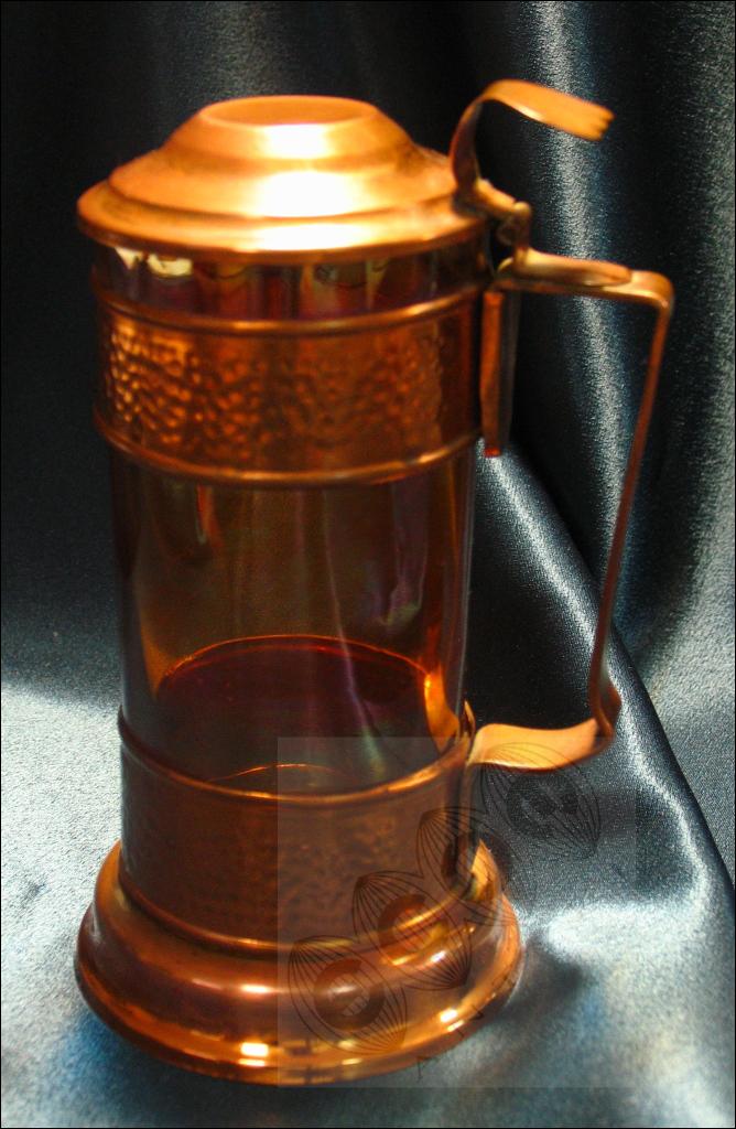 Miedziany kufel, powierzchnia obejm młotkowana. W ofercie posiadamy jeszcze kilka innych naczyń wykonanych z miedzi, wszystkie poprzedni właściciel sprowadził z Albanii.