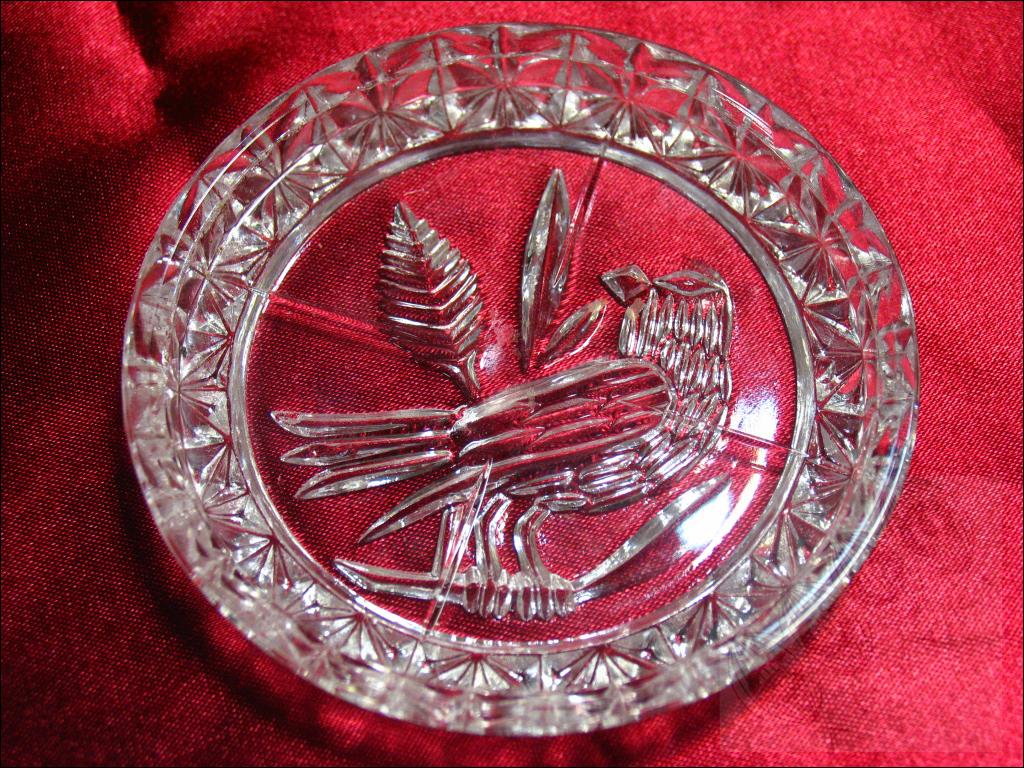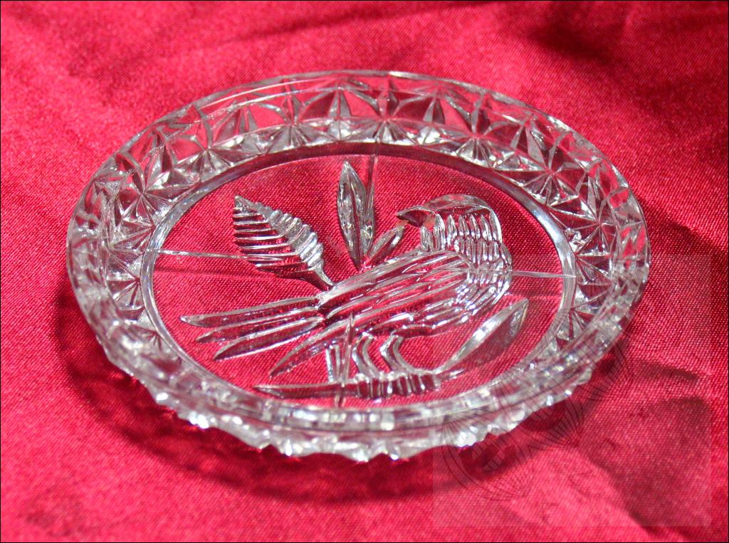 Szklany podstawek z ptasim motywem. W ofercie posiadamy jeszcze dwa takie podstawki, wystawione na innych aukcjach.