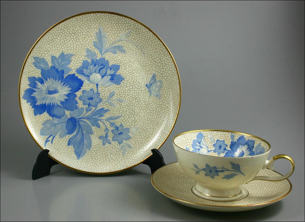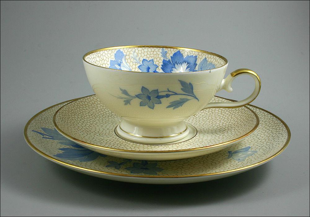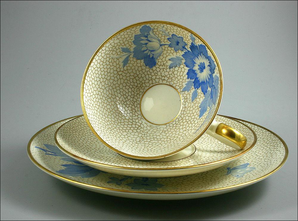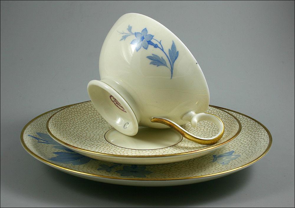 Bawarski zestaw śniadaniowy Seltmann Weiden z niebieskim kwiatowym motywem. Lata 30-te, zestaw w kolorze ecru.