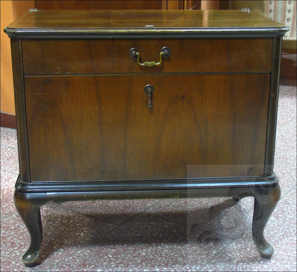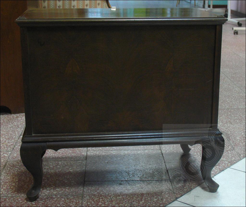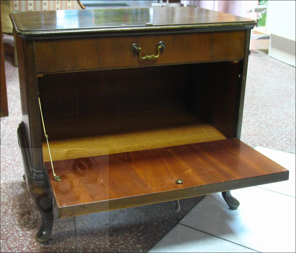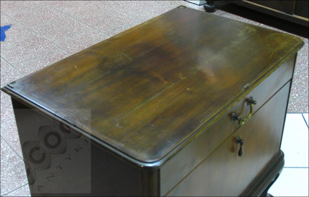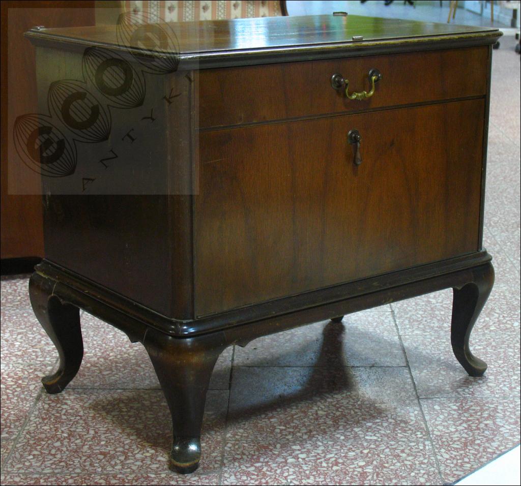 Orzechowa szafka nocna na giętych nogach.