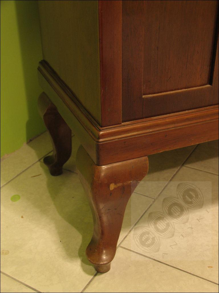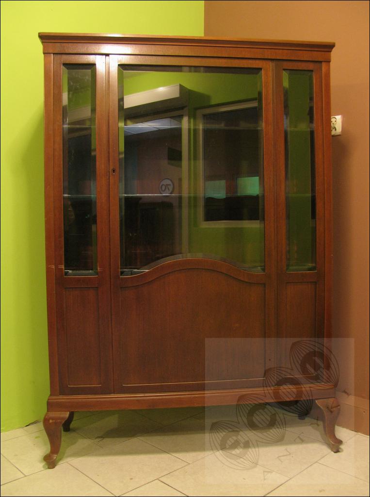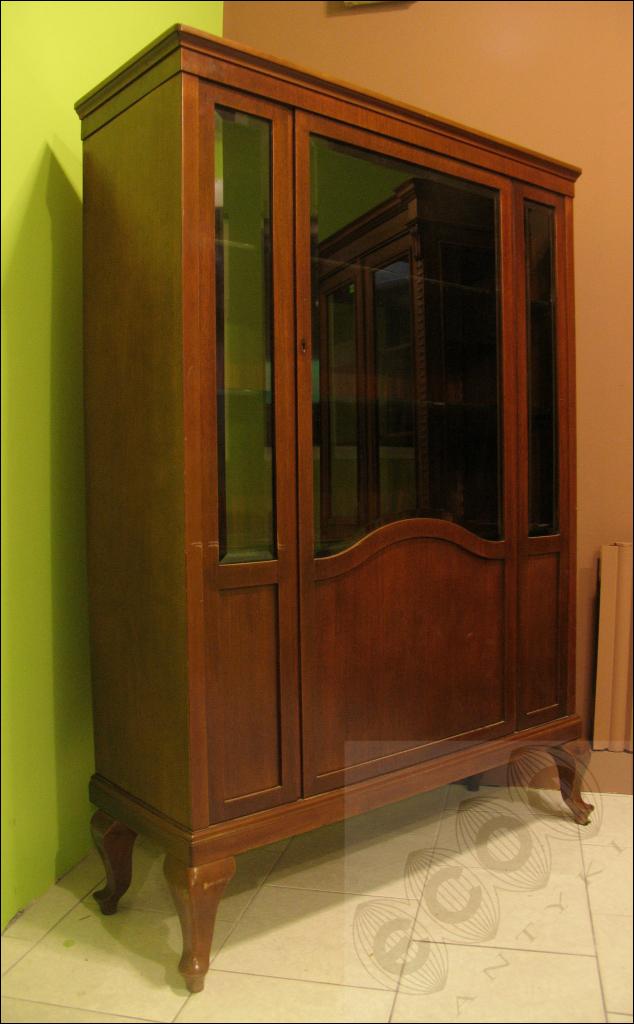 Mahoniowa witryna / biblioteczka z okresu powojennego na giętych nogach. Mebel wykonany z pełnego drzewa fornirowany mahoniem. Półki z profilowanym felcem, barwionym na czarny kolor. Szyby fazowane.