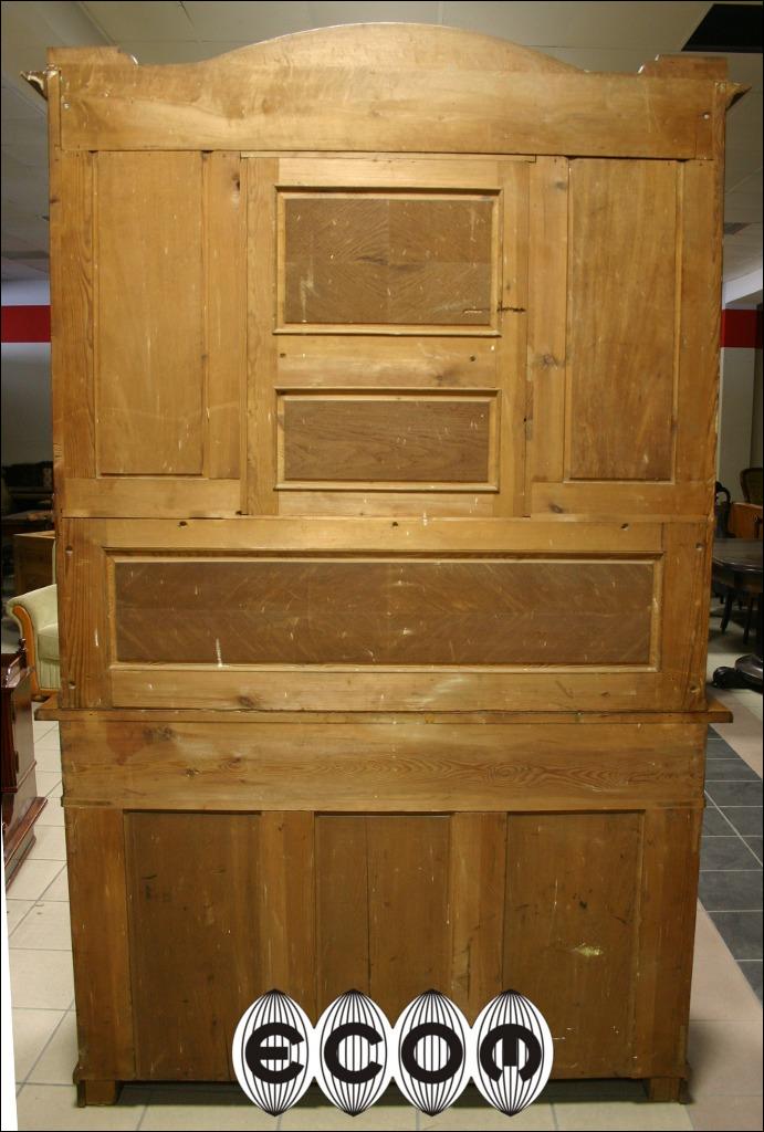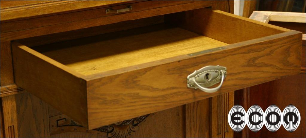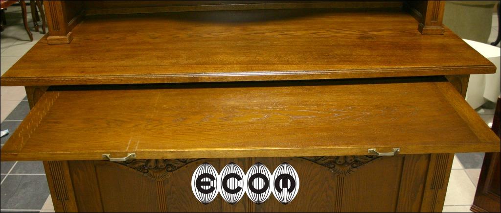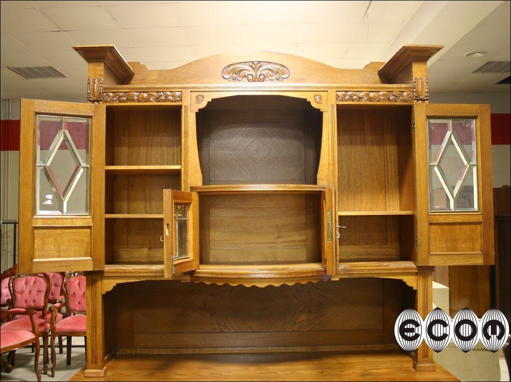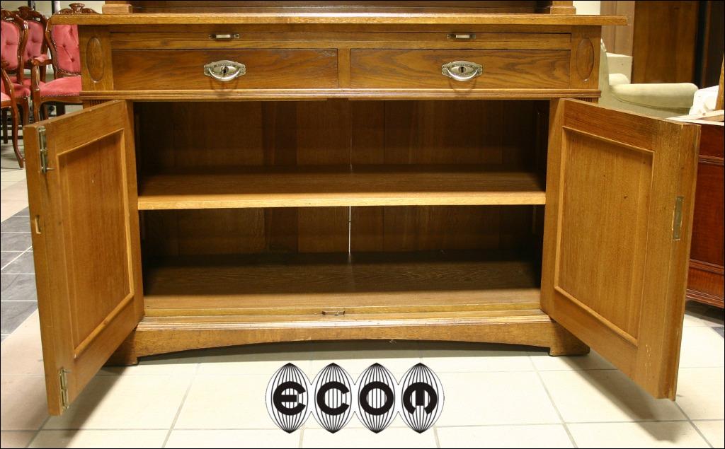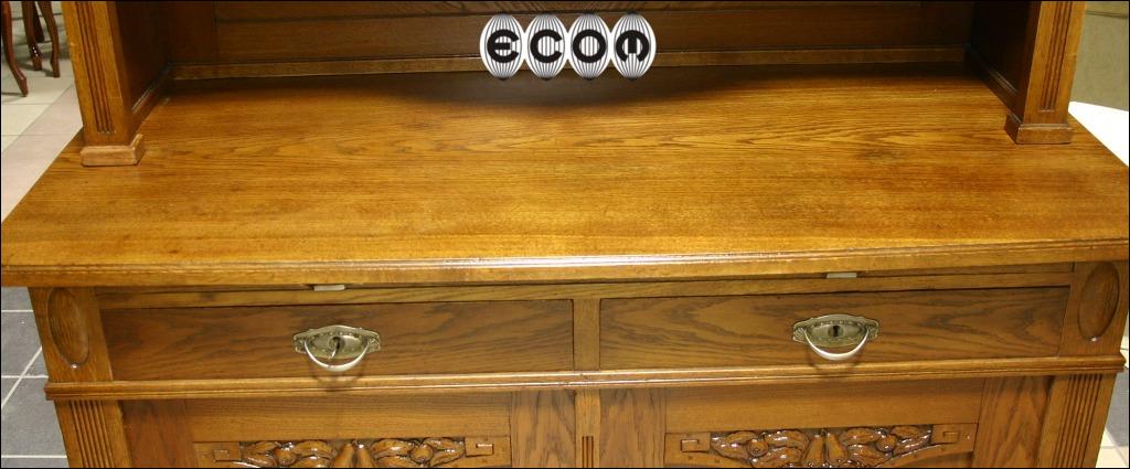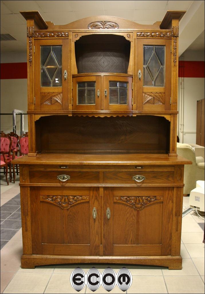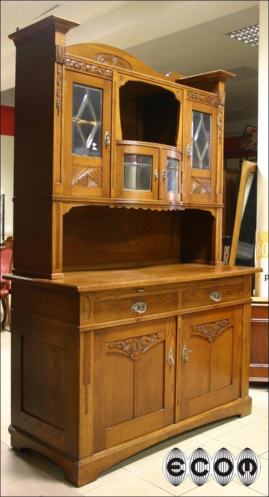 Dębowy secesyjny kredens. Nadstawka z trzema przeszklonymi szafkami, szyby fazowane. Pod głównym blatem dodatkowy wysuwany. W komodzie dwie szafki oraz szuflady. Drzwi szafek w komodzie oraz nadstawce ozodbione snycerką.