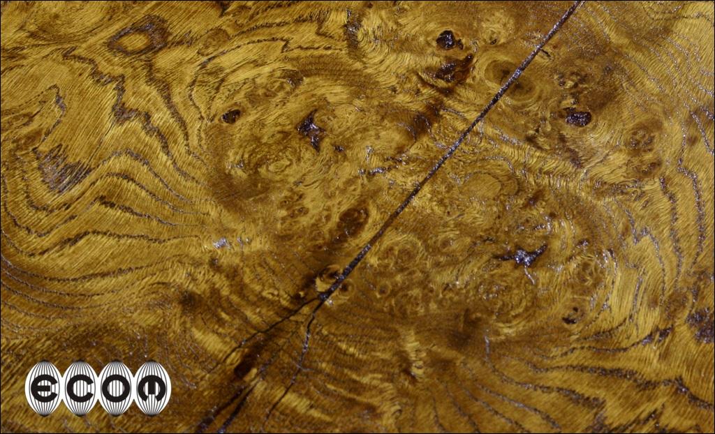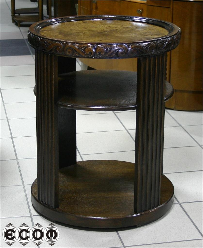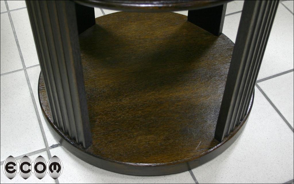 Okrągły stolik dębowy, o nietypowej formie; Zamiast nogi, bądź nóg mamy cztery 'kolumny'. Pomiędzy nimi znajdziemy dodatkowe dwa blaty. Rant głównego ozdobiony wyrzeźbionym wzorem, górna powierzchnia blatu ozdobiona fornirem orzechowym