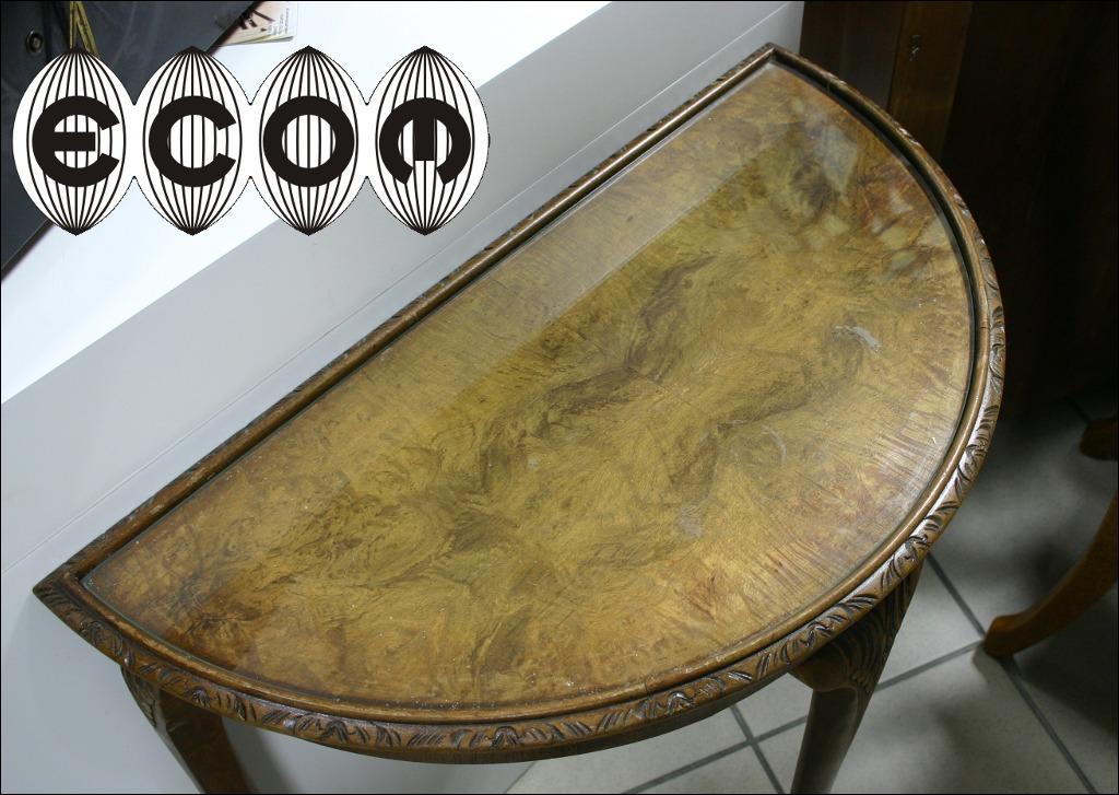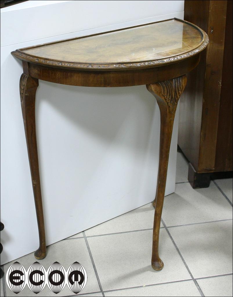 Konsola na trzech smukłych nogach o półokrągłym blacie. Rant blatu ozdobiony lekką snycerką, sam blat wykonany z czeczoty orzecha, na nim tafla szkła.
