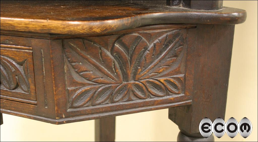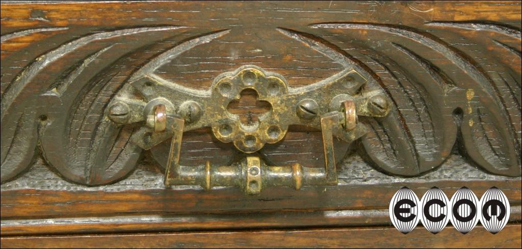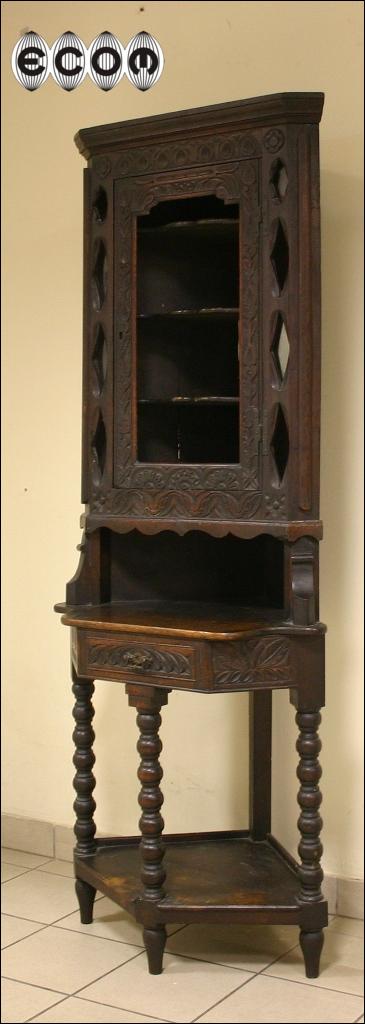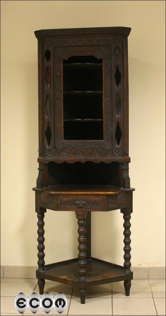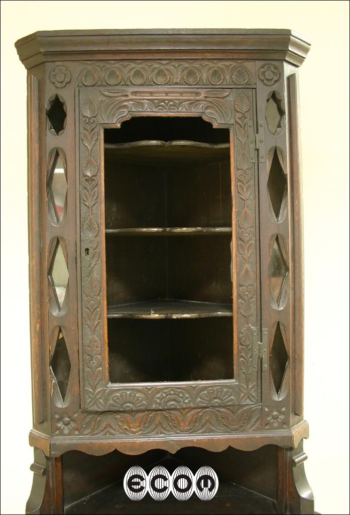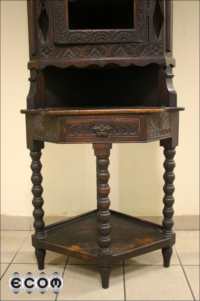 Piękny dębowy narożnik z XIX wieku. Mebel z charakterystyczną dla epoki i regionu snycerką. Kątnik powstał na wyspach brytyjskich. Wokół głównej części witryny umieszczono osiem małych świetlików, w których powinny być przeszklenia podobnie jak w witrynie głównej.