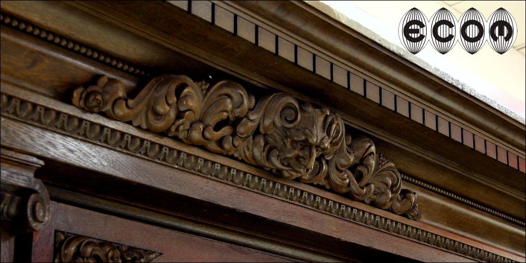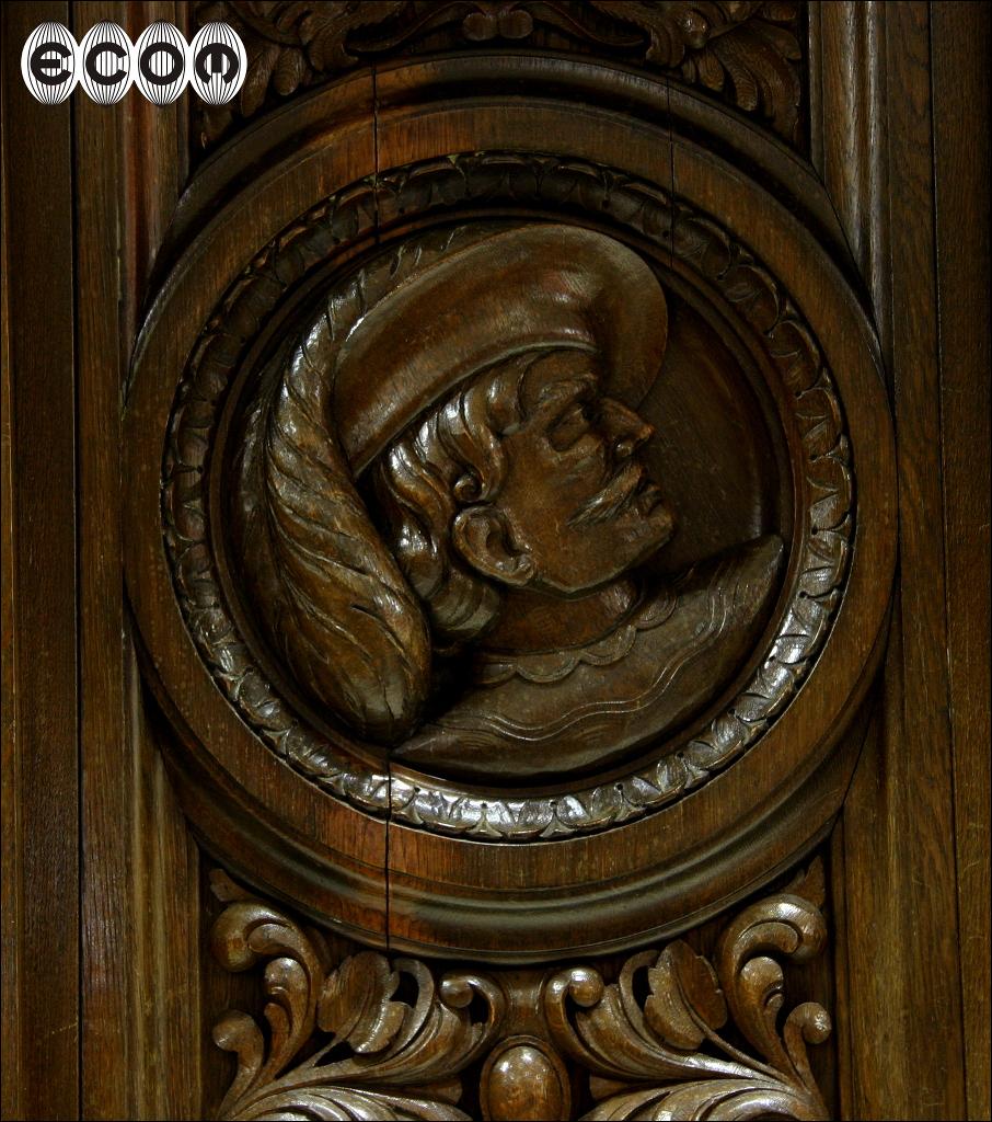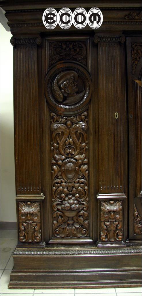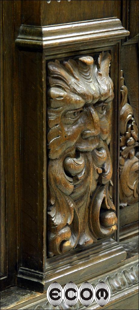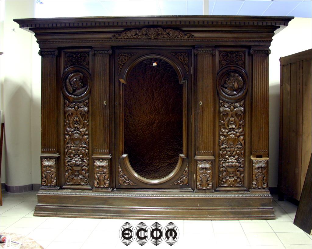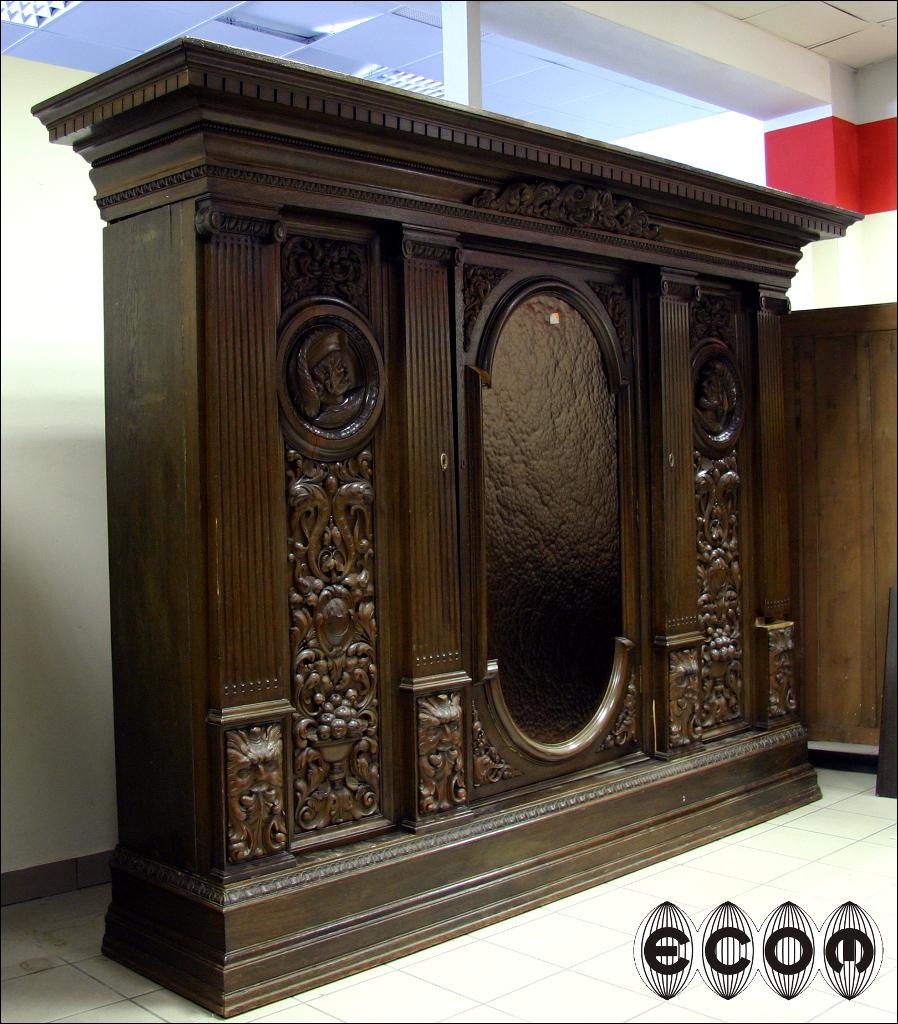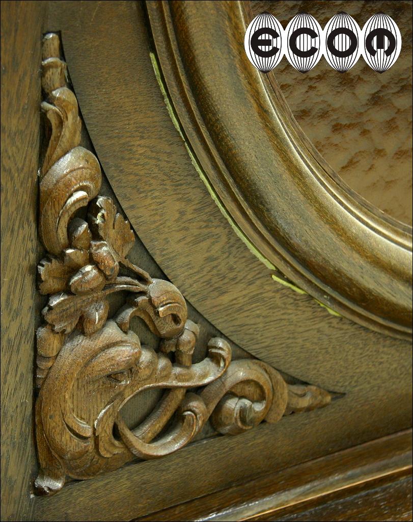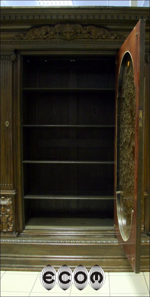 Wyjątkowa dębowa biblioteka z początku XX wieku, z widocznymi nawiązaniami do klasycyzmu. Proste zwieńczenie, w którego środkowej części jest wyrzeźbiony maszkaron w otoczeniu pnącz i liści. Boczne drzwi z pilastrami na bocznych krawędziach, wewnątrz przestrzenna snycerka przedstawiająca profil mężczyzny. Poniżej wijące się pnącza, liście i owoce. Przy podstawie pilastrów rzeźbione maszkarony. Środkowe drzwi przeszklone. Obecnie wstawione jest szkło ornamentowe, wstawione aby ukryć za nim swoje zbiory, możemy je wymienić na szkło fazowane, dzięki czemu Państwa kolekcje będą lepiej wyeksponowane. Za każdymi drzwiami osobna przegroda w której mieszczą się cztery półki o regulowanej wysokości. Boczne drzwi po wewnętrznej stronie fornirowane mahoniem. Biblioteka która Państwu prezentujemy jest bez wątpienia meblem z najwyższej półki, pozycją która ciężko obecnie znaleźć na rynku i obok której nie da się przejść obojętnie. Wykonana została zapewne na zamówienie bardzo zamożnej osoby. Świadczy o tym nie sam rozmiar mebla ale rozmach i zdobienia. Przestrzenna snycerka wykonana w litym dębie sięga do 10 cm głębokości.