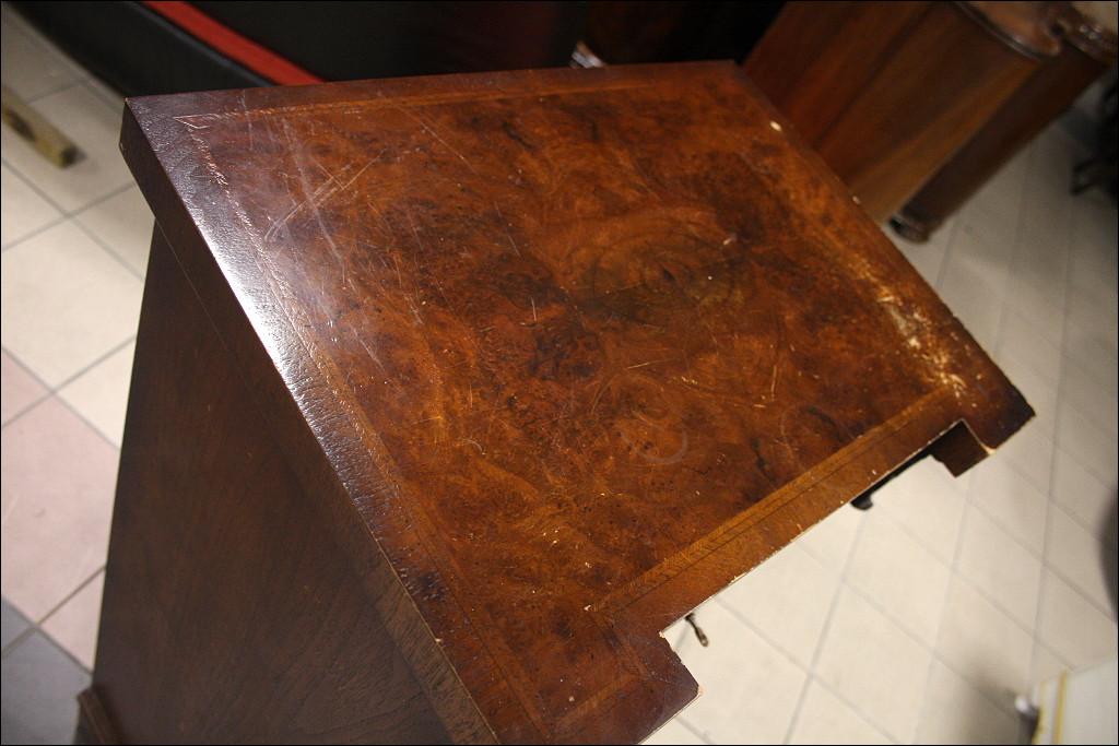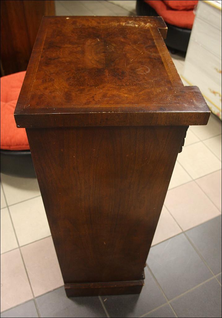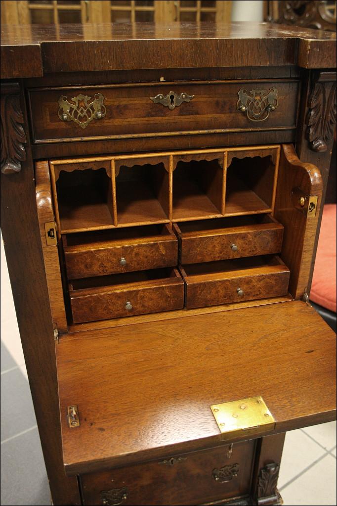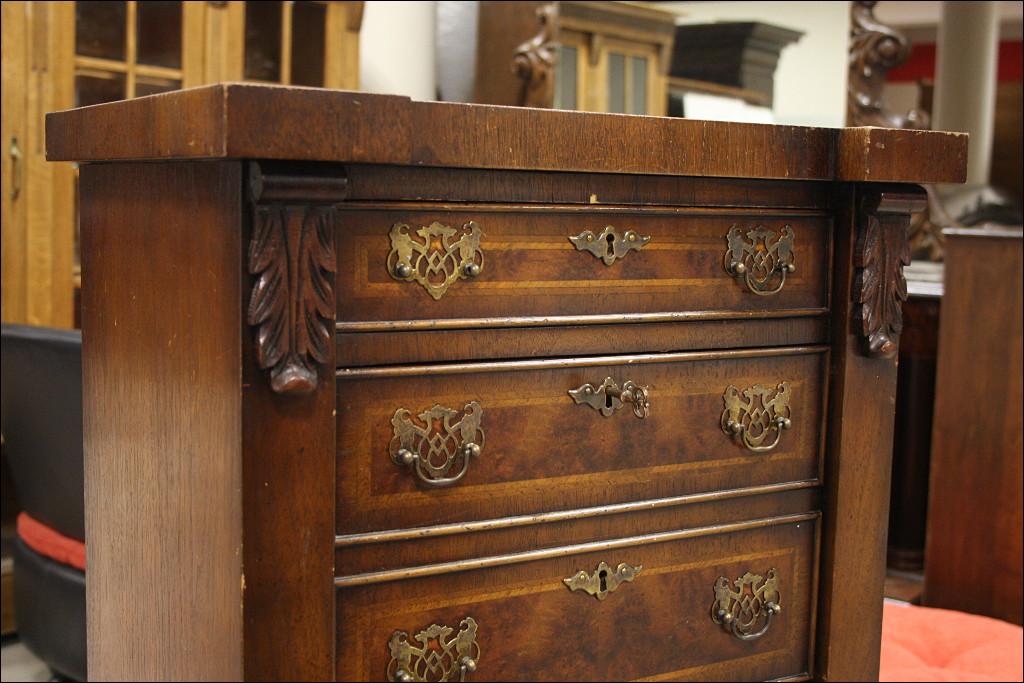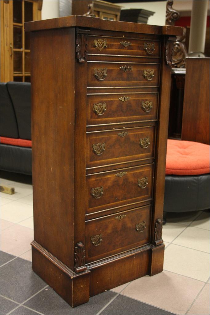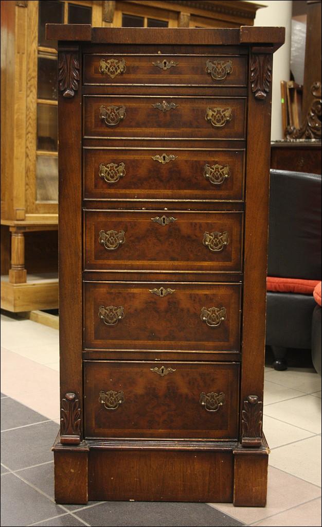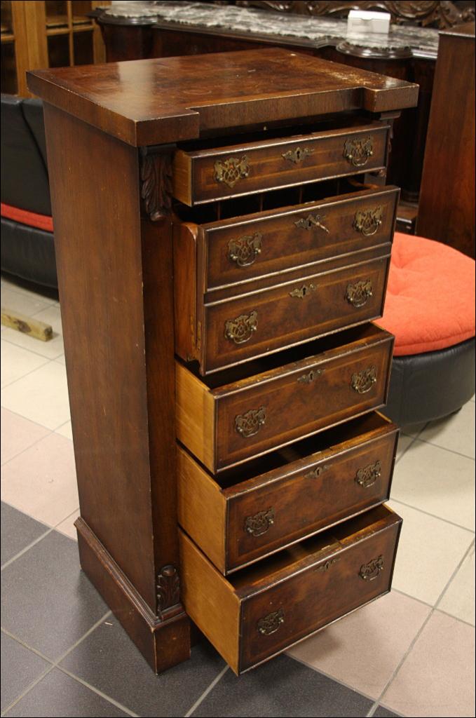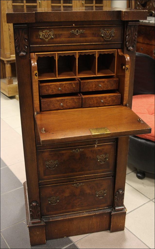 Szyfoniera w kształcie masywnej kolumny o secesyjnych rysach. Drugi i trzeci od góry front szuflady kryją za sobą sekretarzyk z czterema przegródkami i czterema szufladkami. Górna szuflada mniejsza niż trzy najniższe, wszystkie zamykane na klucz - serkretarzyk również. Fornir orzechowy. Mebel bardzo 'cenny' ze względu na to jak wiele może zaoferować przy swoich niewielkich rozmiarach.