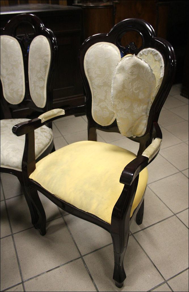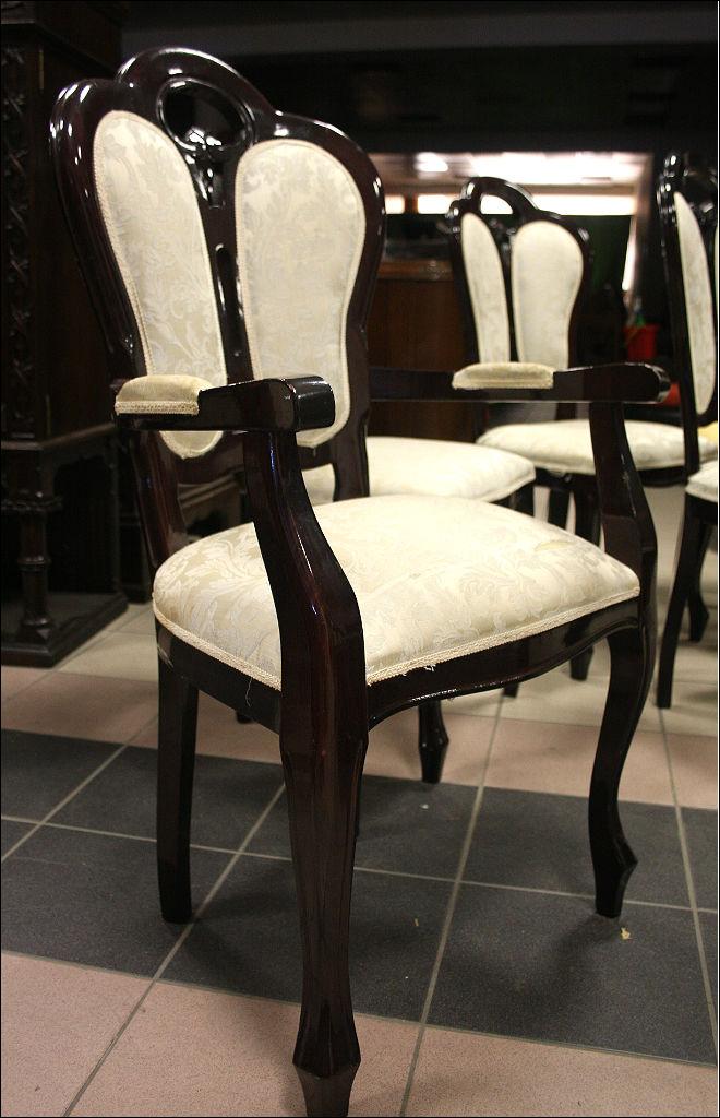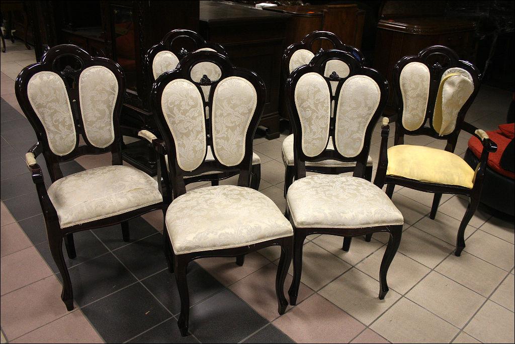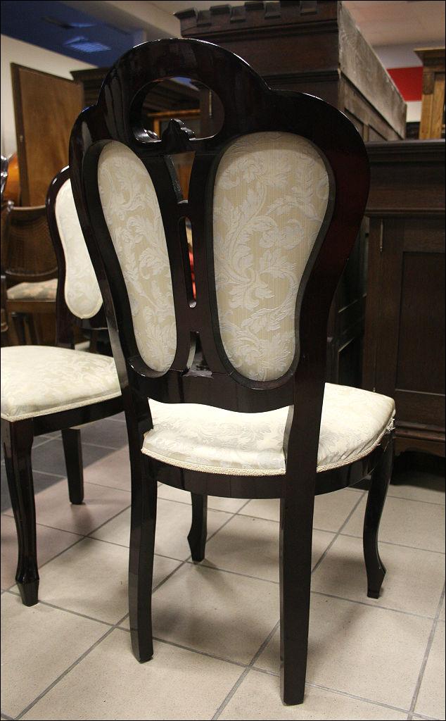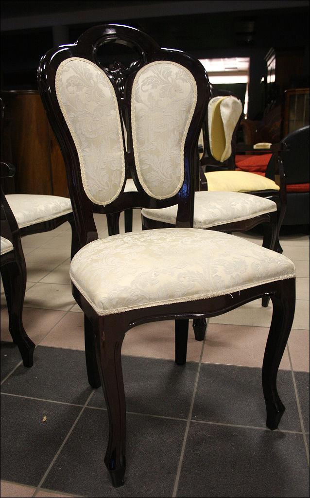 Komplet sześciu krzeseł z tapicerką w kolorze ecru (tapicerka do wymiany). Stelaż z drewna liściastego, barwiony na ciemny mahoń.