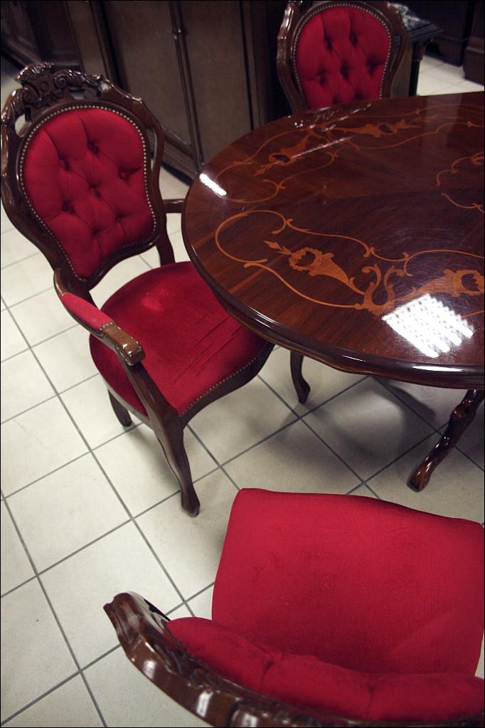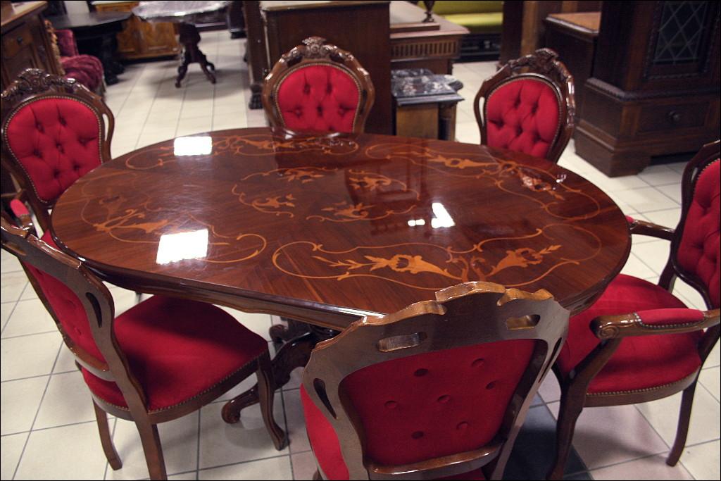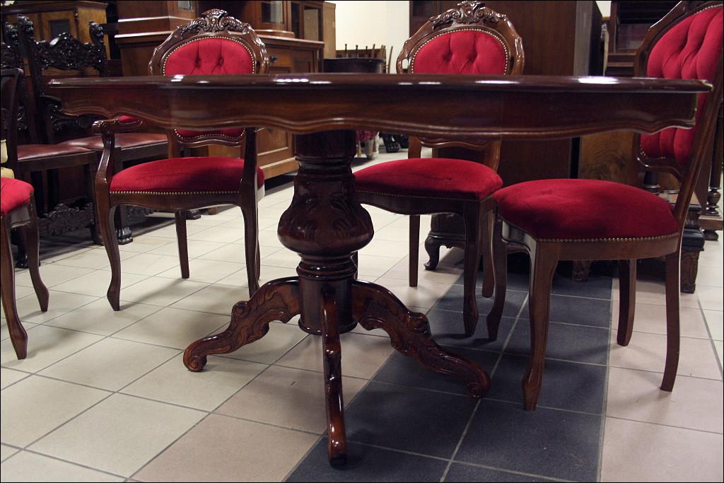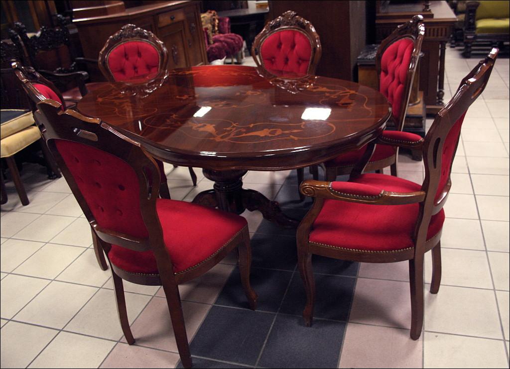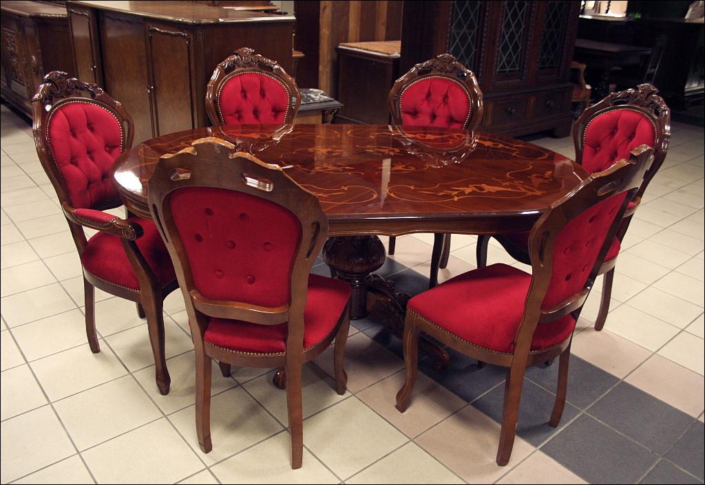 Komplet składający się ze stołu oraz sześciu krzeseł. Blat zdobiony intarsjami, z wysokim połyskiem. Noga pojedyncza, masywna, bogato zdobiona. Przednie nogi krzeseł gięte, zwieńczenia oparć z rzeźbieniami, siedziska oraz oparcia tapicerowane: