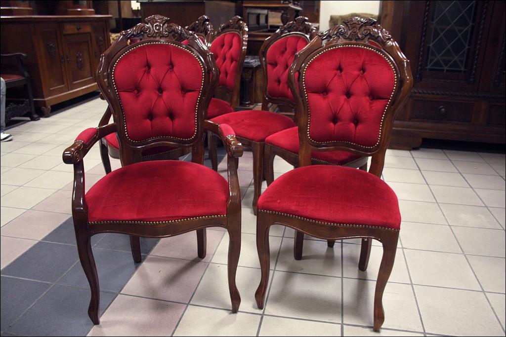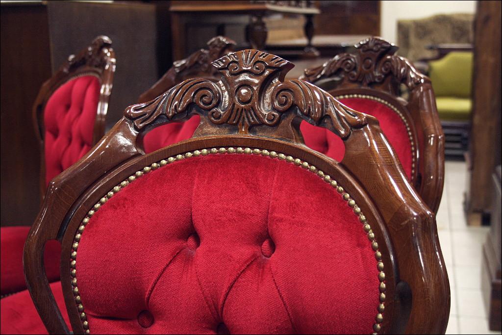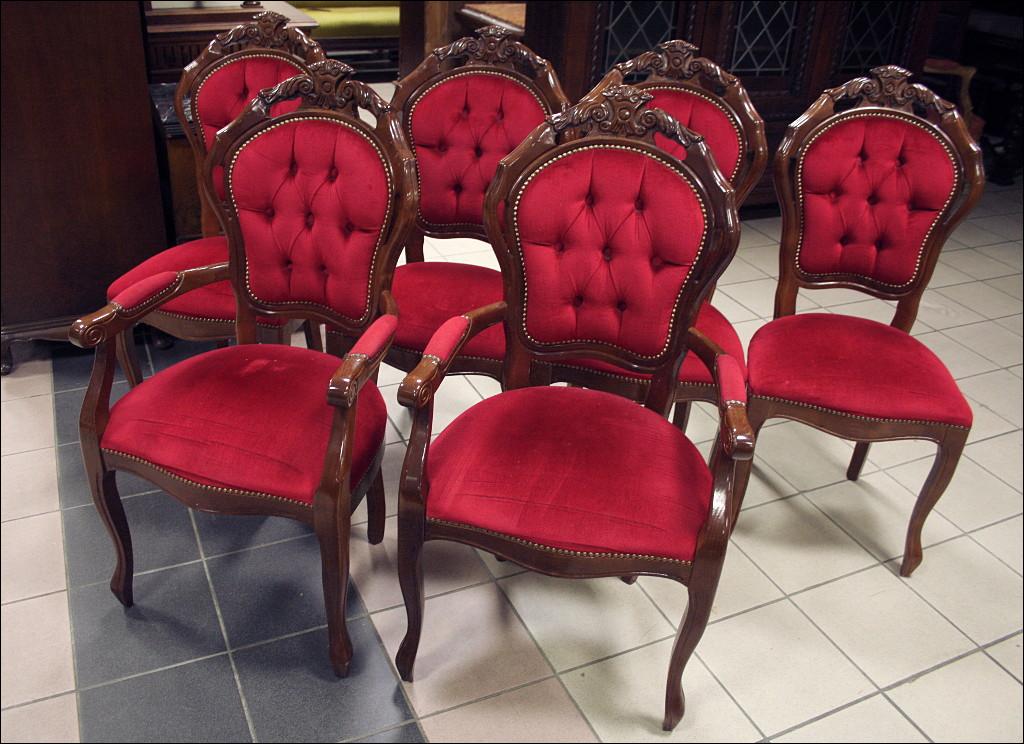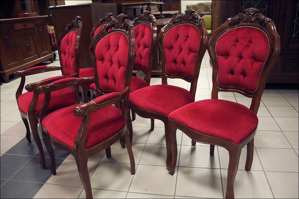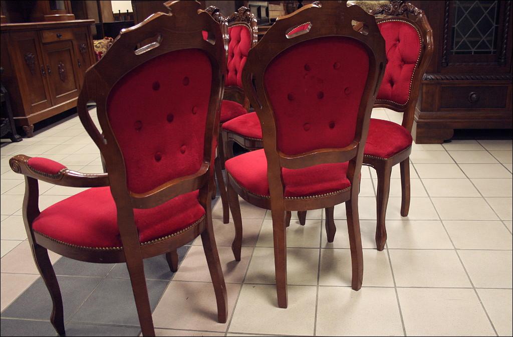 Komplet składający się ze stołu oraz sześciu krzeseł. Blat zdobiony intarsjami, z wysokim połyskiem. Noga pojedyncza, masywna, bogato zdobiona. Przednie nogi krzeseł gięte, zwieńczenia oparć z rzeźbieniami, siedziska oraz oparcia tapicerowane: