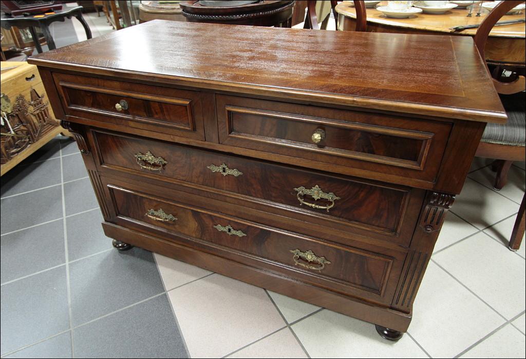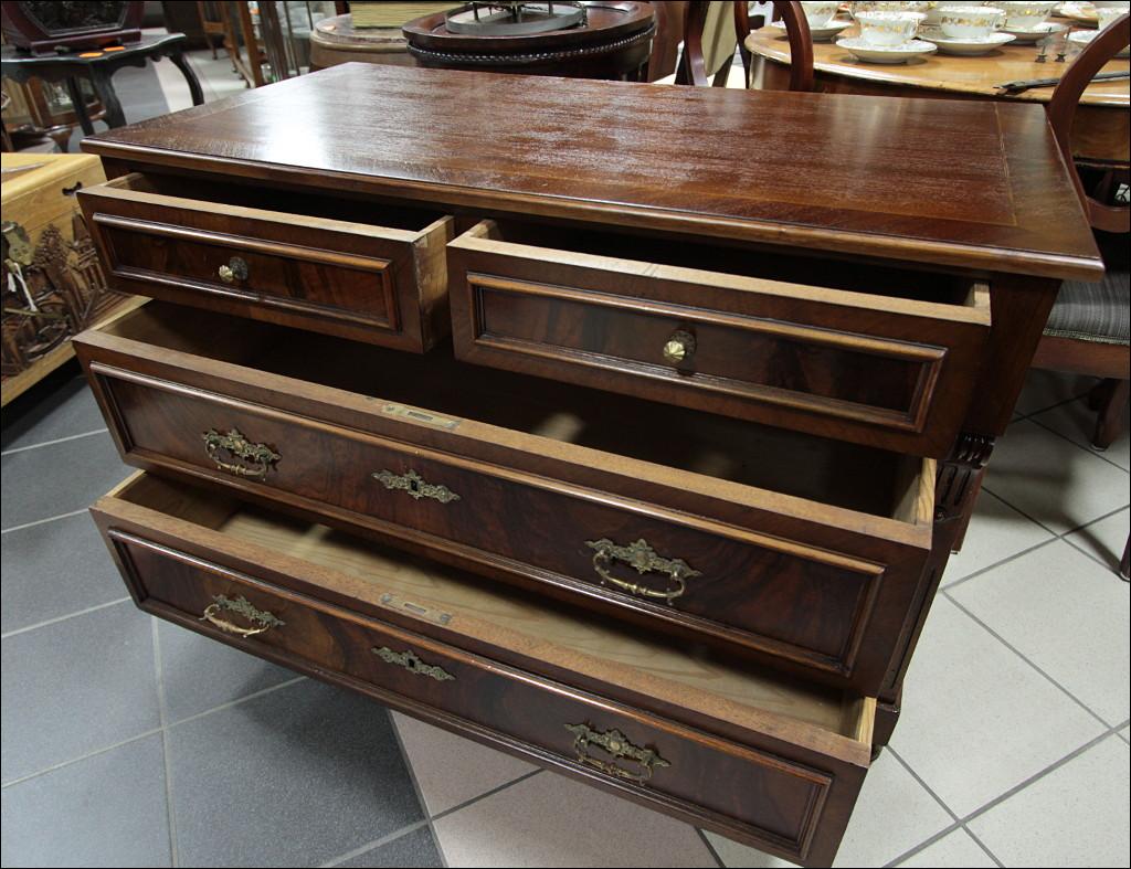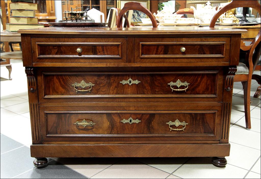 Eklektyczna komoda z końca XIX wieku. Mebel orzechowy, płyciny szuflad zdobione pięknymi czeczotami orzechowymi. Okucia oryginalne z epoki, nogi toczone.