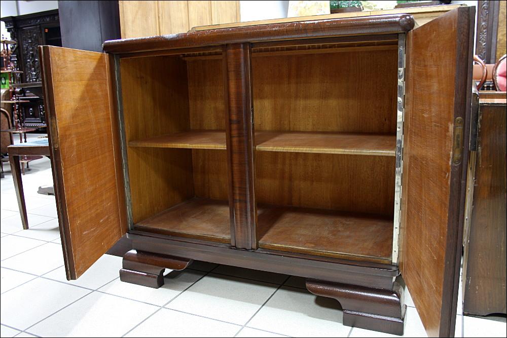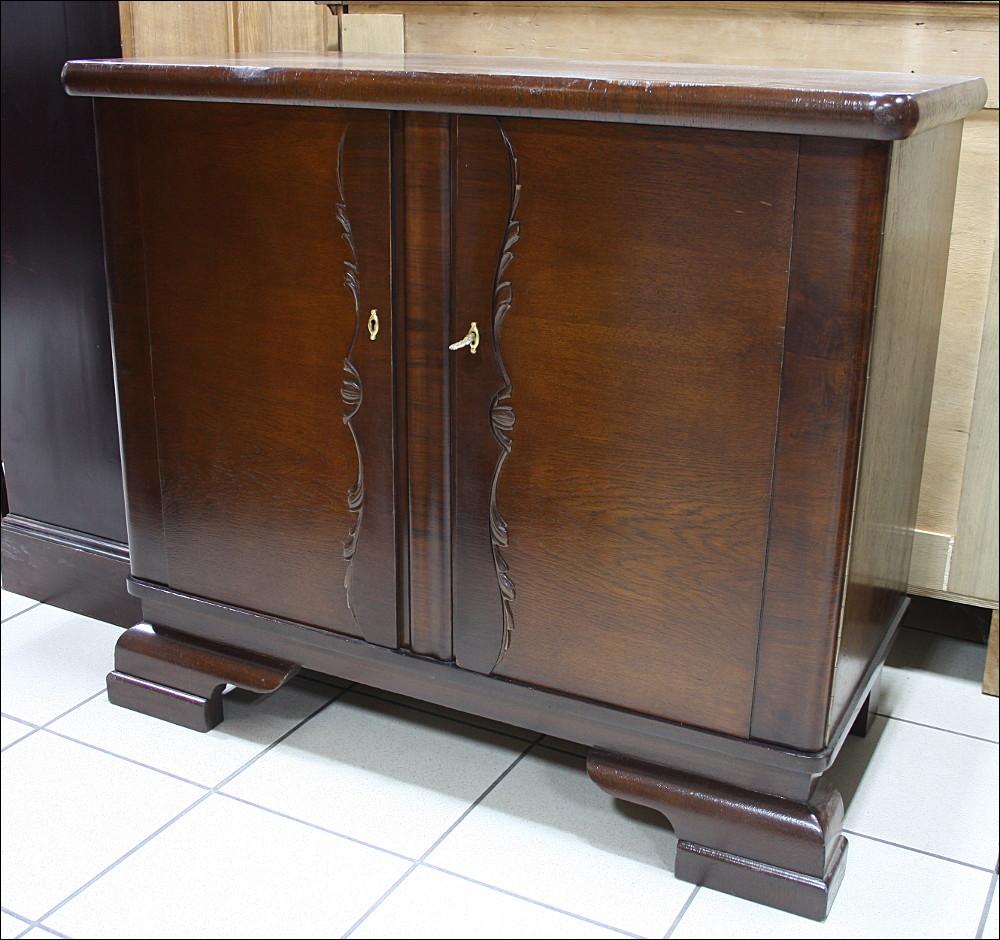 Niewielka, dębowa komoda z okresu międzywojennego. Mebel skromny z wstawką orzecha i bardzo delikatnymi zdobieniami.