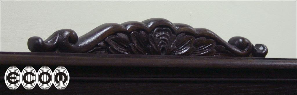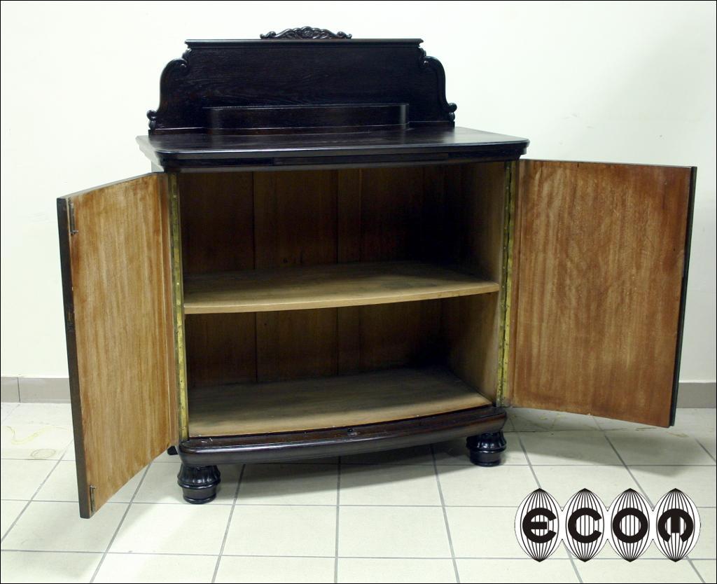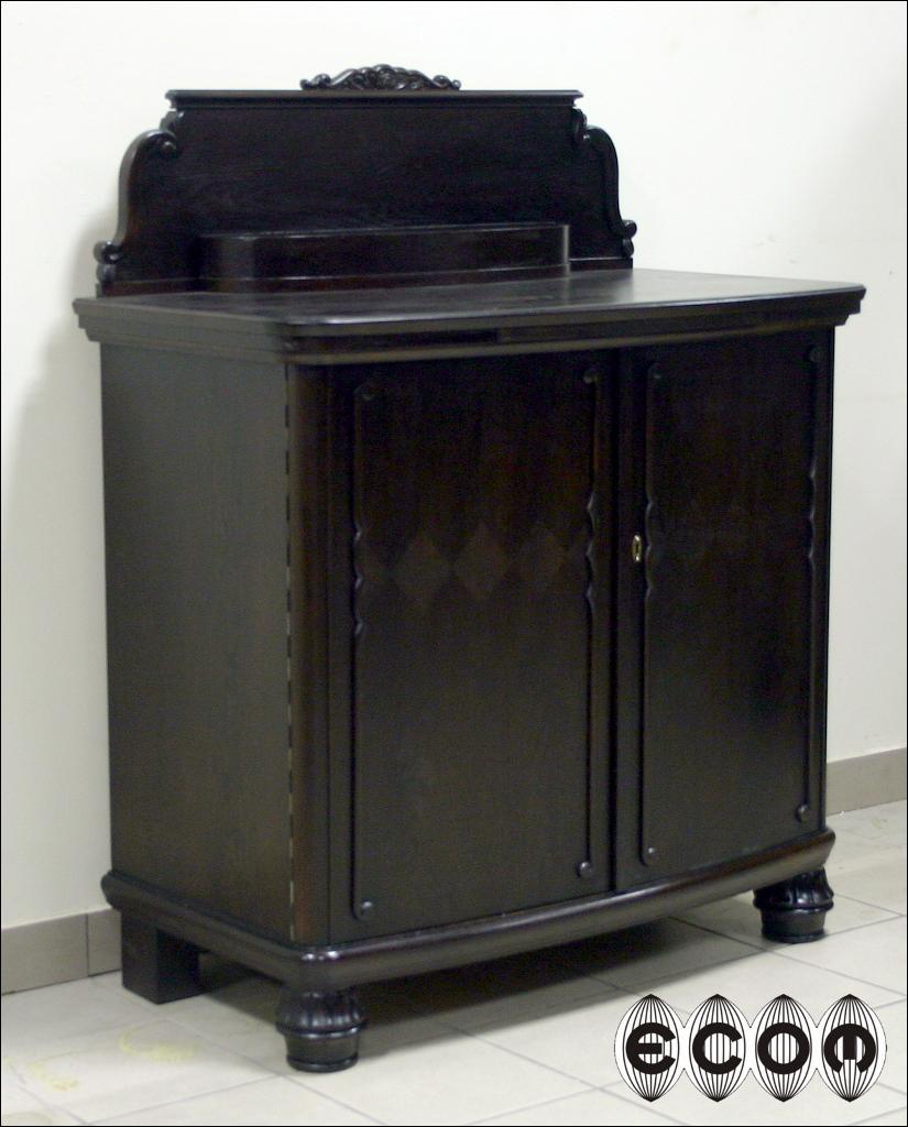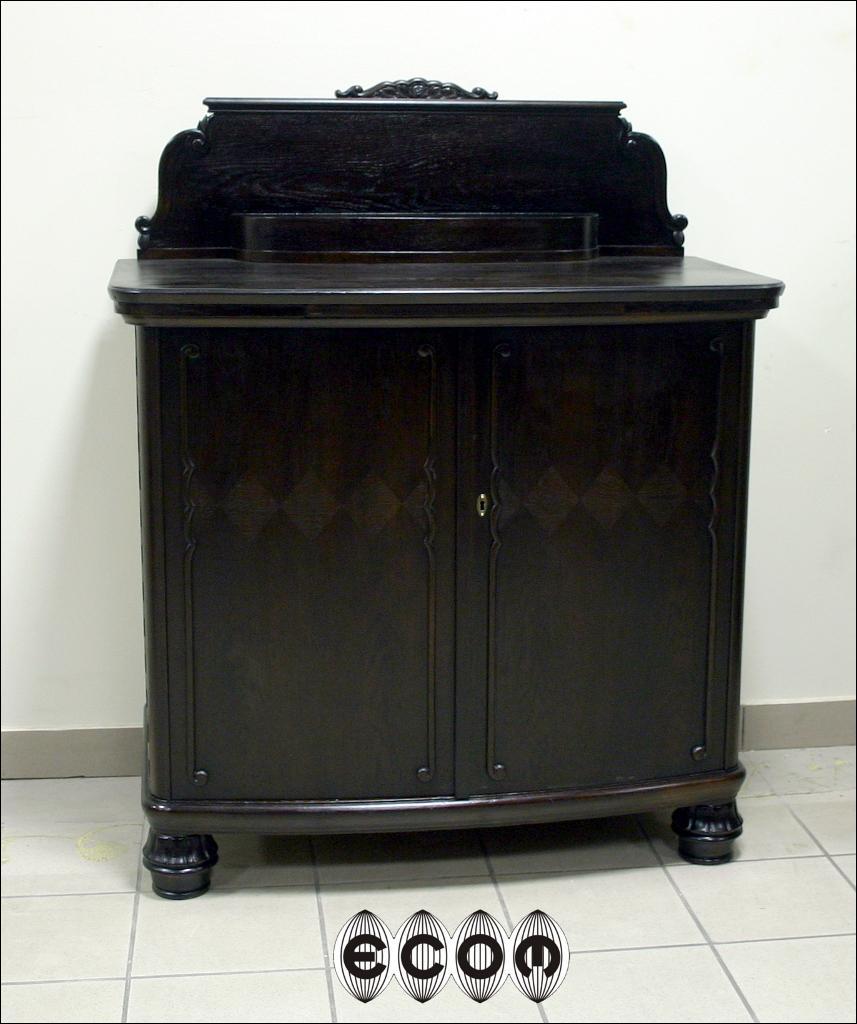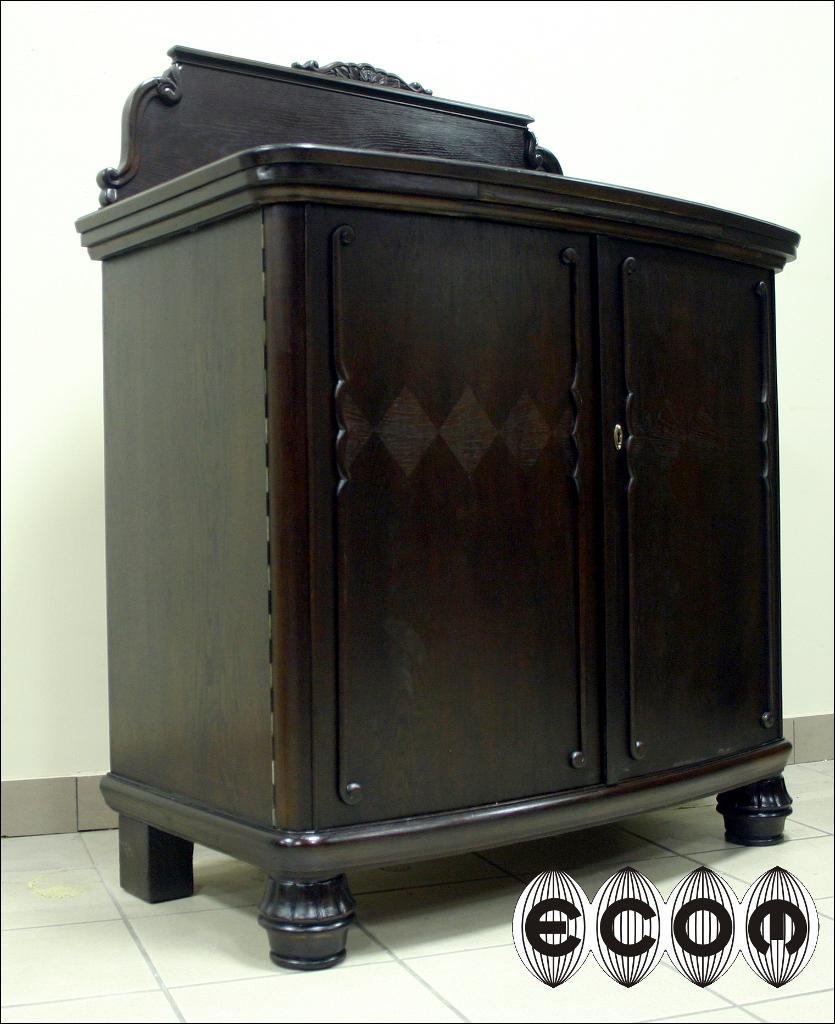 Komoda z okresu międzywojennego. Mebel fornirowany dębem z wstawkami z orzecha z trójką drzwi. Środkowe z wstawką z orzecha oraz ozdobione snycerką. Wewnątrz dwie komory, w prawej jedna półka, w lewej cztery szuflady. Mebel na kulistych ryflowanych nogach.