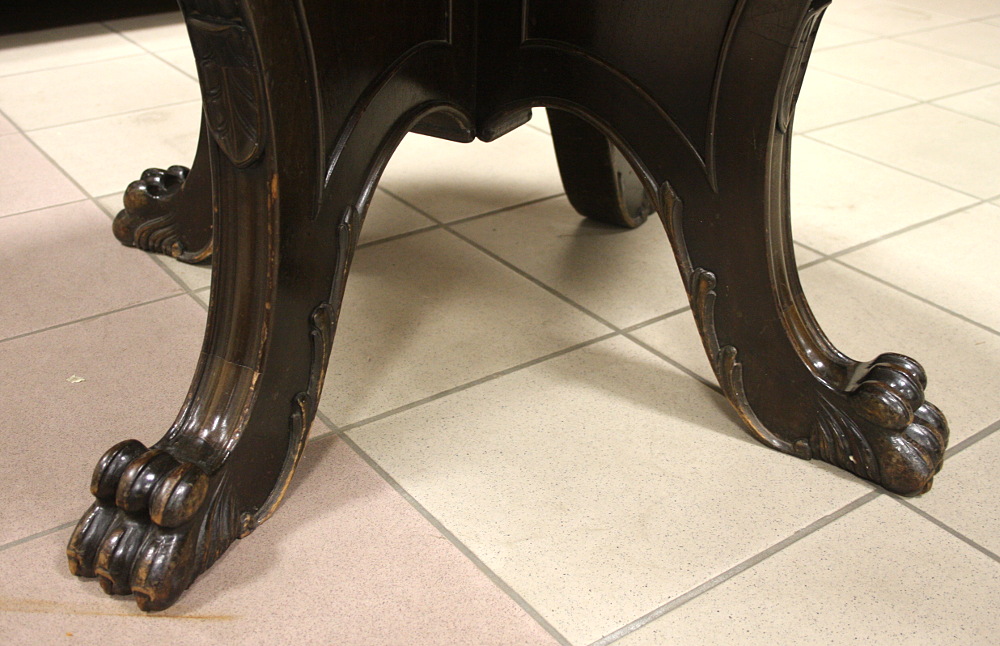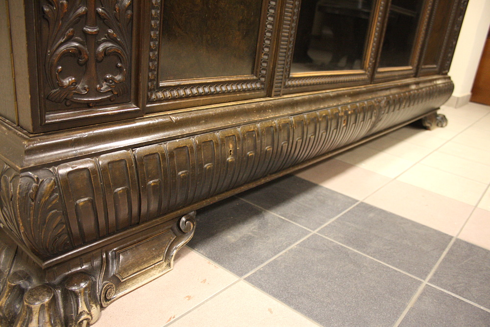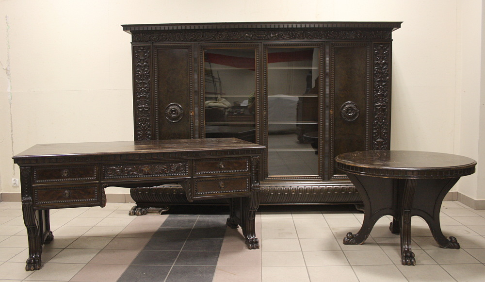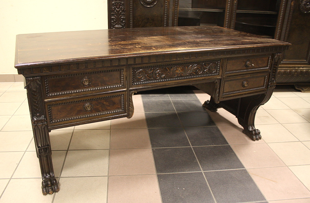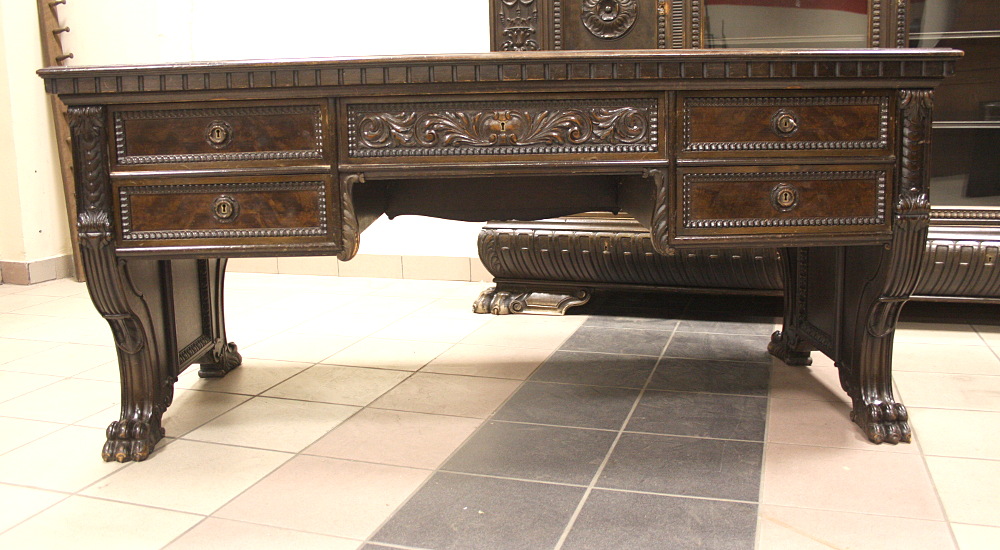 Gabinet orzechowy na lwich łąpach. W skłąd zestawu wchodzi duża biblioteka, piękne, nietypowe biurko i stół. Wszystkie elementy gabinetu z bogatą snycerką. Biblioteka zaskakuje ukrytymi w dolnej części czterema szufladami, które dają większe możliwości wykorzystania mebla. Uzupełnieniem zestawu jest stół z identycznymi motywami snycerskimi. Cały komplet na lwich pazurach. W razie potrzeby do kompletu jesteśmy w stanie dopasować fotel do biurka.