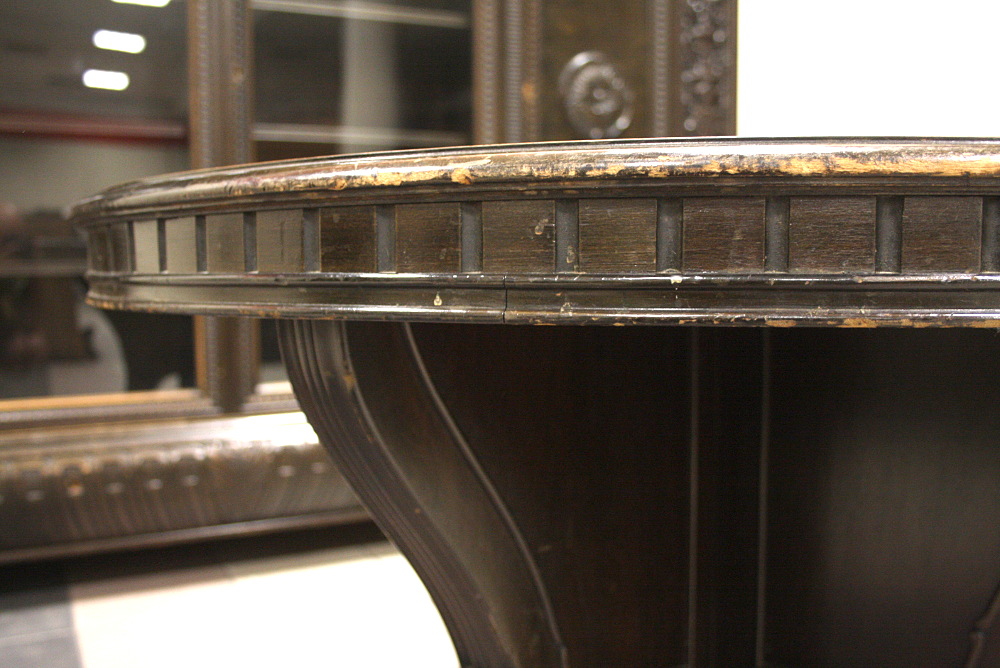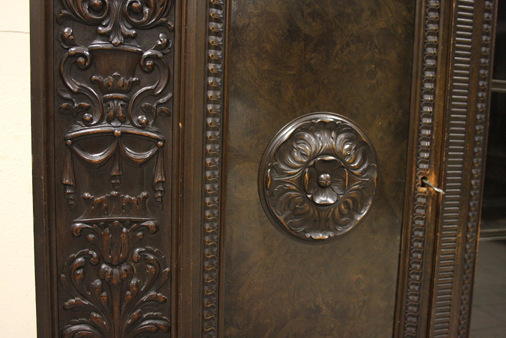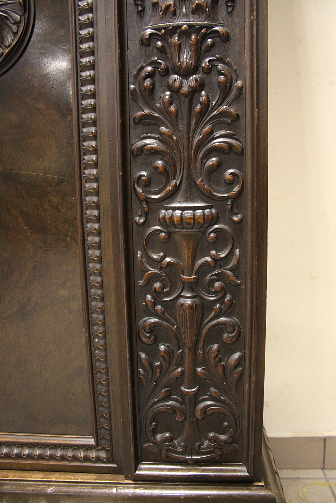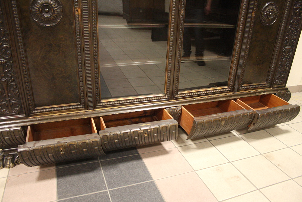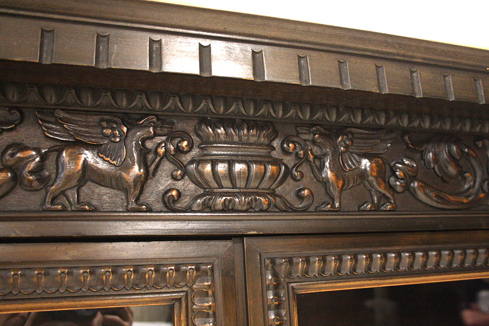 Gabinet orzechowy na lwich łąpach. W skłąd zestawu wchodzi duża biblioteka, piękne, nietypowe biurko i stół. Wszystkie elementy gabinetu z bogatą snycerką. Biblioteka zaskakuje ukrytymi w dolnej części czterema szufladami, które dają większe możliwości wykorzystania mebla. Uzupełnieniem zestawu jest stół z identycznymi motywami snycerskimi. Cały komplet na lwich pazurach. W razie potrzeby do kompletu jesteśmy w stanie dopasować fotel do biurka.