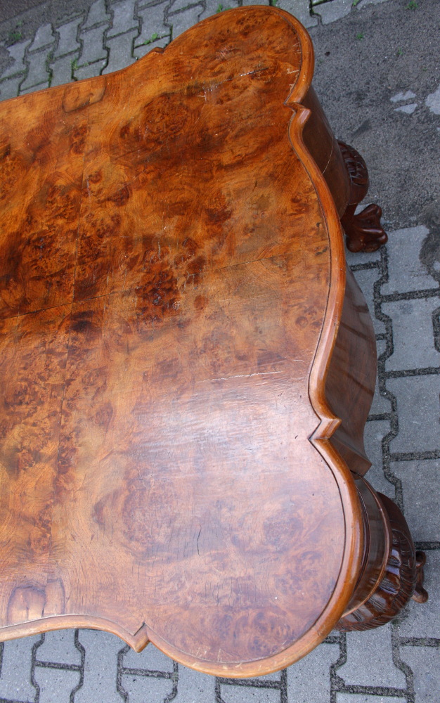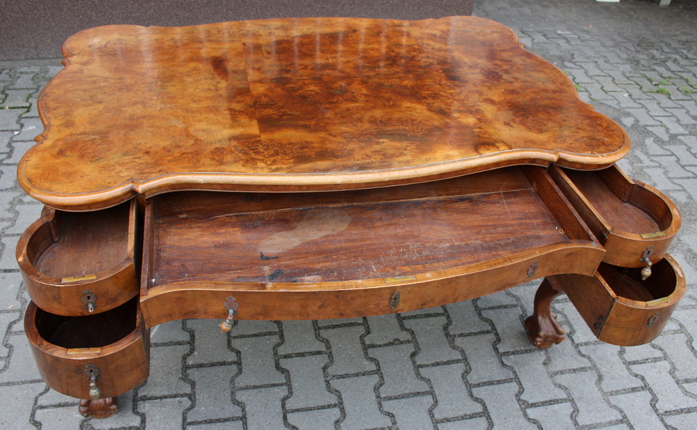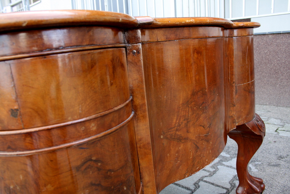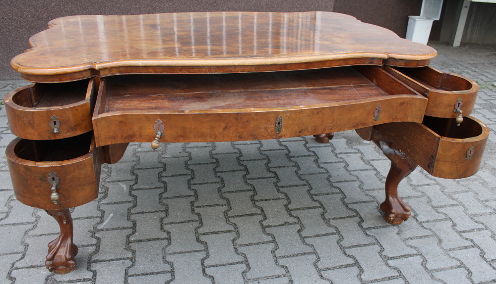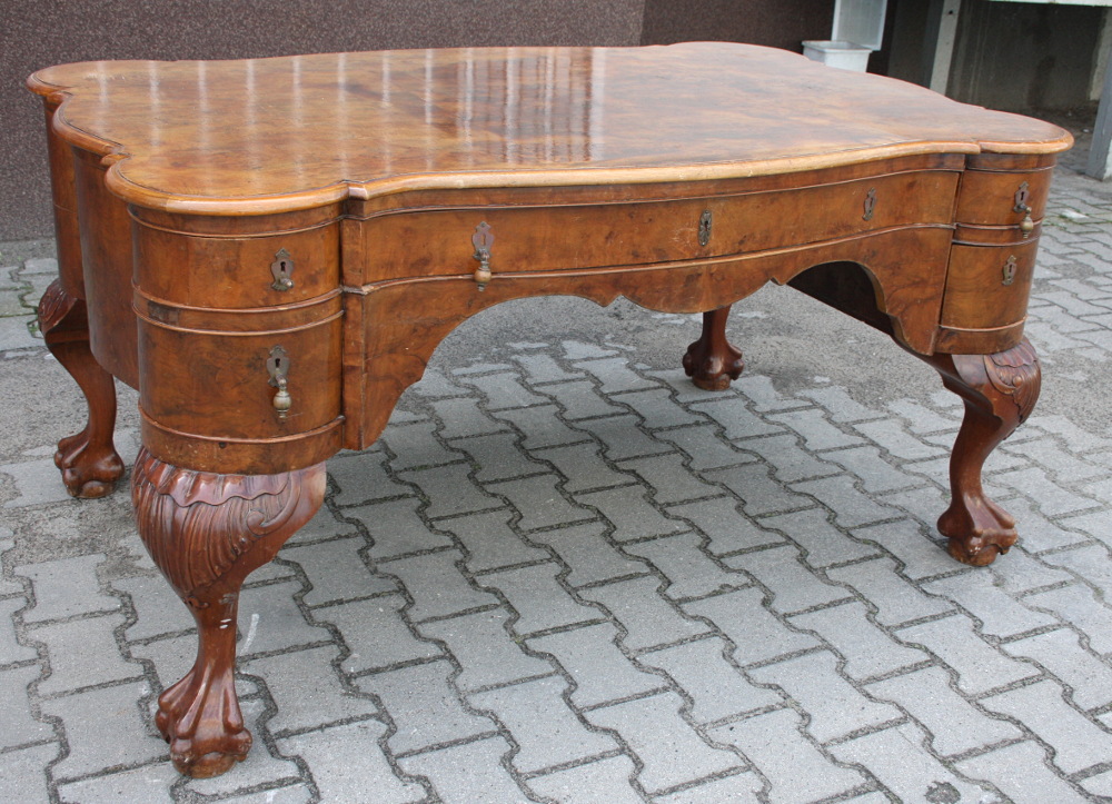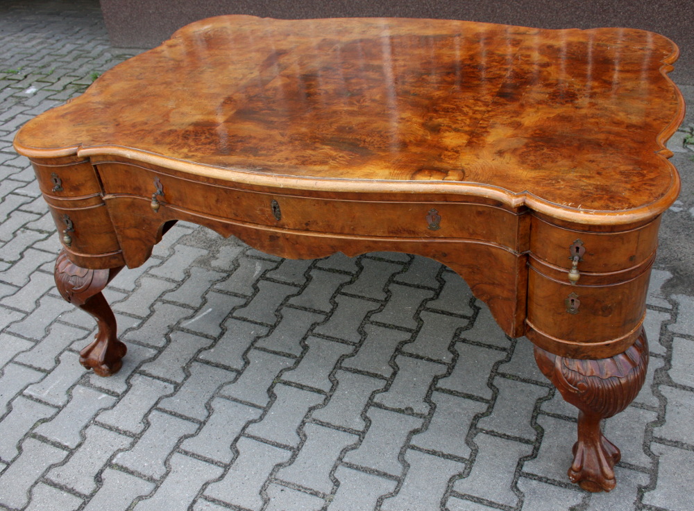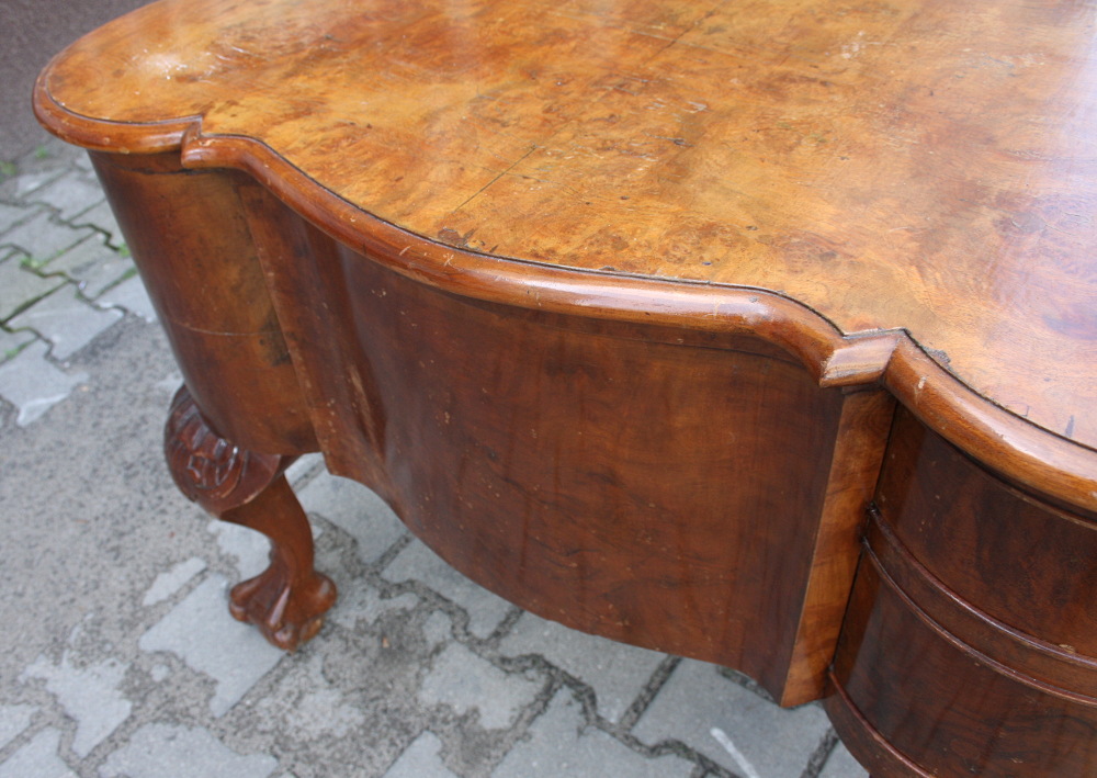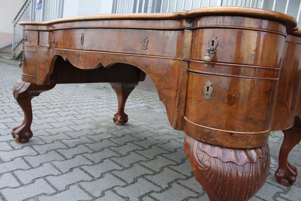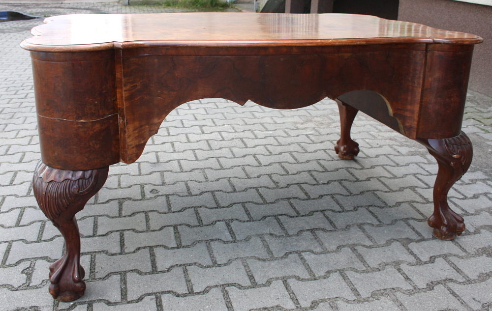 Przepiękne orzechowe biurko neobarokowe. Mebel z pewnością oprócz funkcji użytkowej może pełnić również dekoracyjną - oczywiście najlepiej jak będzie spełniać obydwie jednocześnie ale śmiało może być tylko i wyłącznie ozdobą pomieszczenia. Wszystkie strony mebla pokryte czeczotą orzechową, uwagę przykuwają z pewnością 'bufiaste' nogi, które kończą się lwimi łapami. Łagodne, faliste linie jednoznacznie potwierdzają należność do stylu. Biurko mieści w sobie pięć głębokich szuflad w tym jedną, centralną bardzo szeroką.