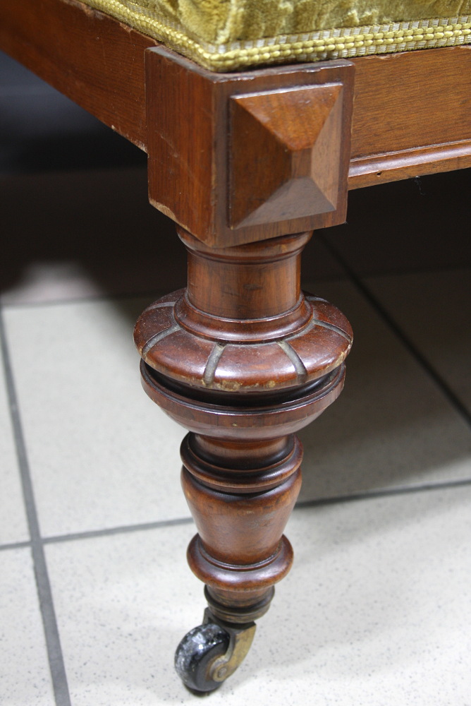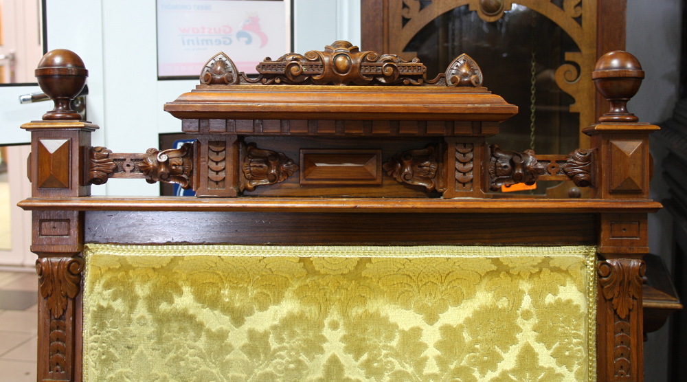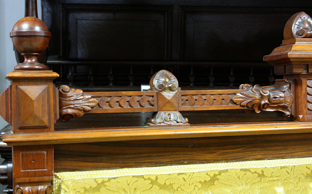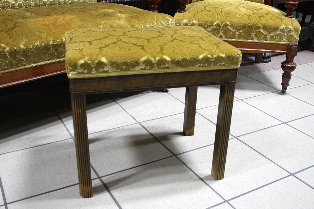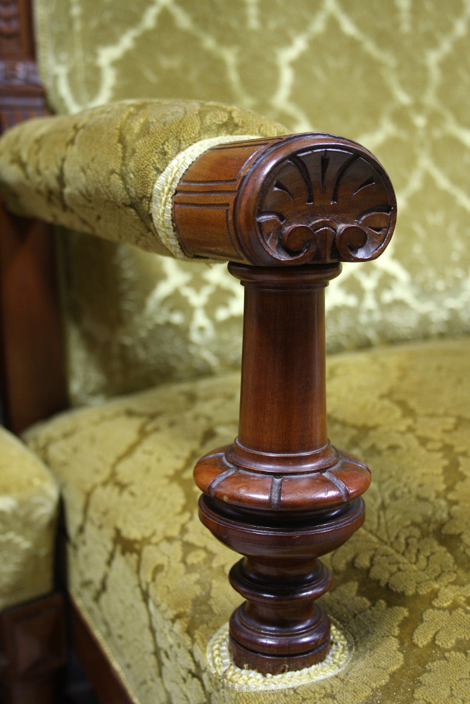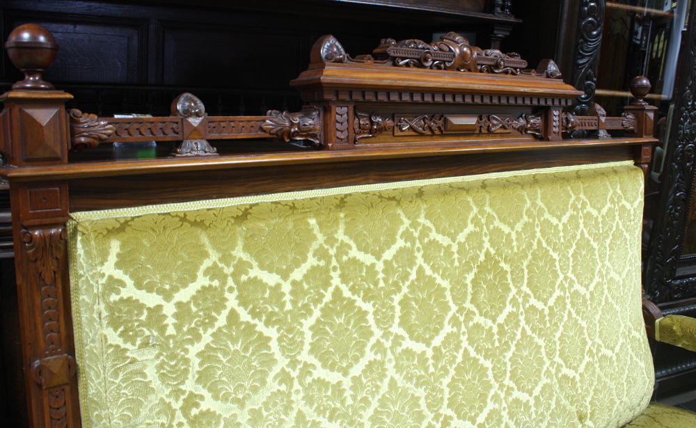 XIX-wieczny komplet eklektyczny składający się z sofy, dwóch foteli oraz podnóżka. Stelaż orzechowy, bogato zdobiony - charakterystycznie dla stylu. Nogi mebli wyposażone w kółka ułatwiające ich przemieszczanie. Tapicerka w kolorze miodowym.