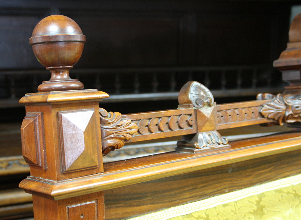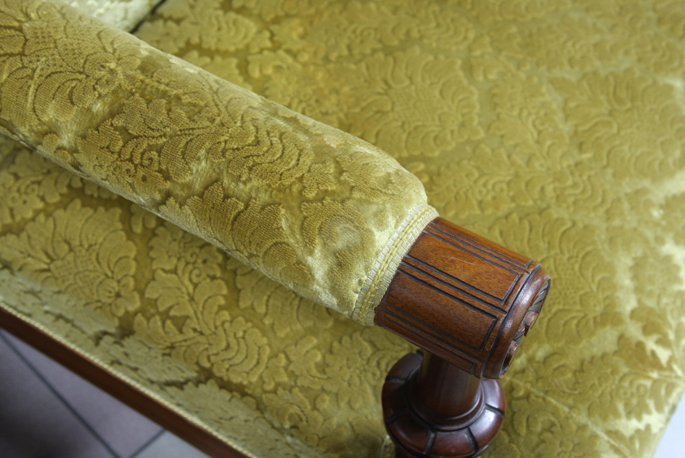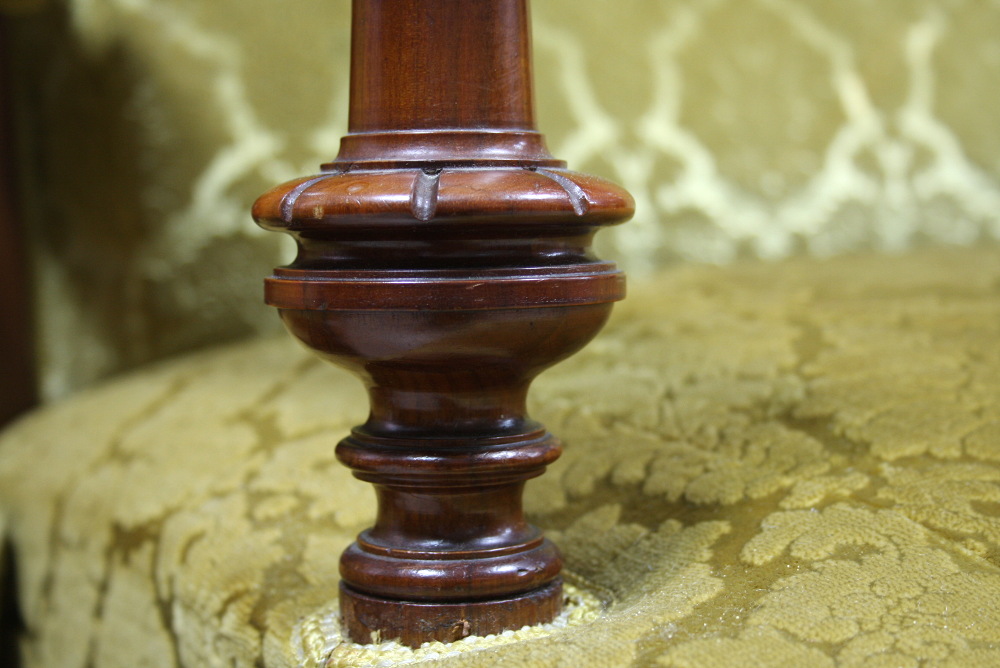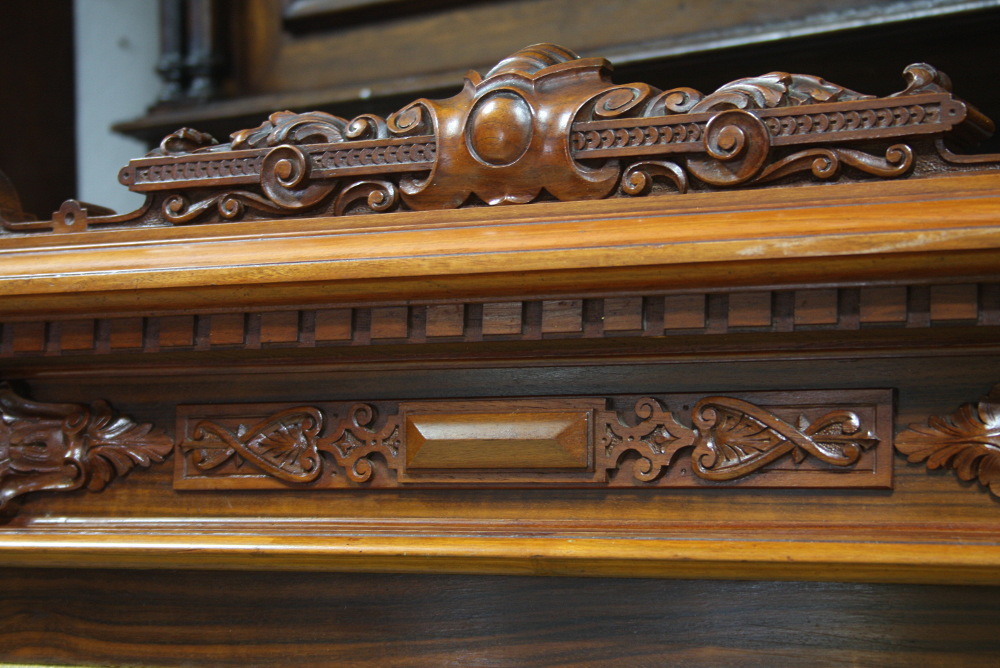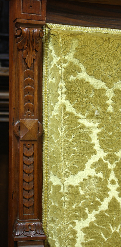 XIX-wieczny komplet eklektyczny składający się z sofy, dwóch foteli oraz podnóżka. Stelaż orzechowy, bogato zdobiony - charakterystycznie dla stylu. Nogi mebli wyposażone w kółka ułatwiające ich przemieszczanie. Tapicerka w kolorze miodowym.
