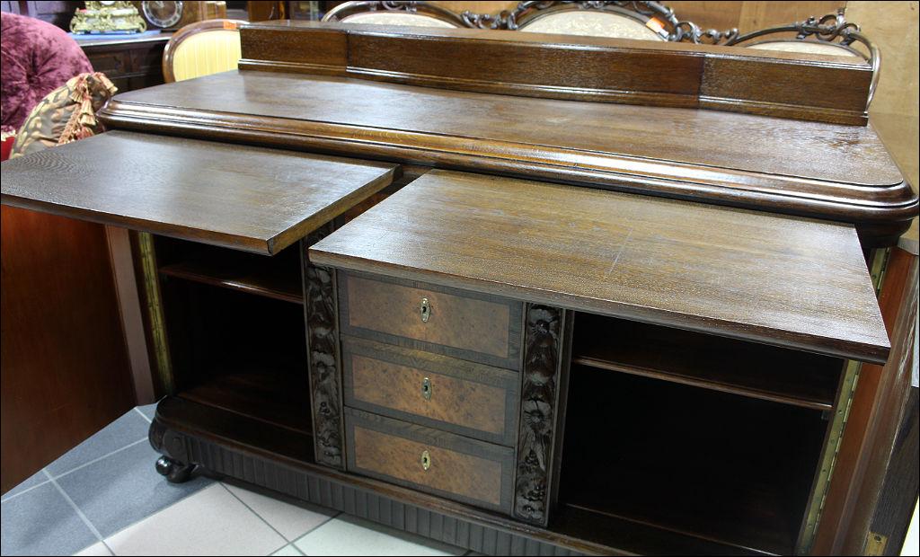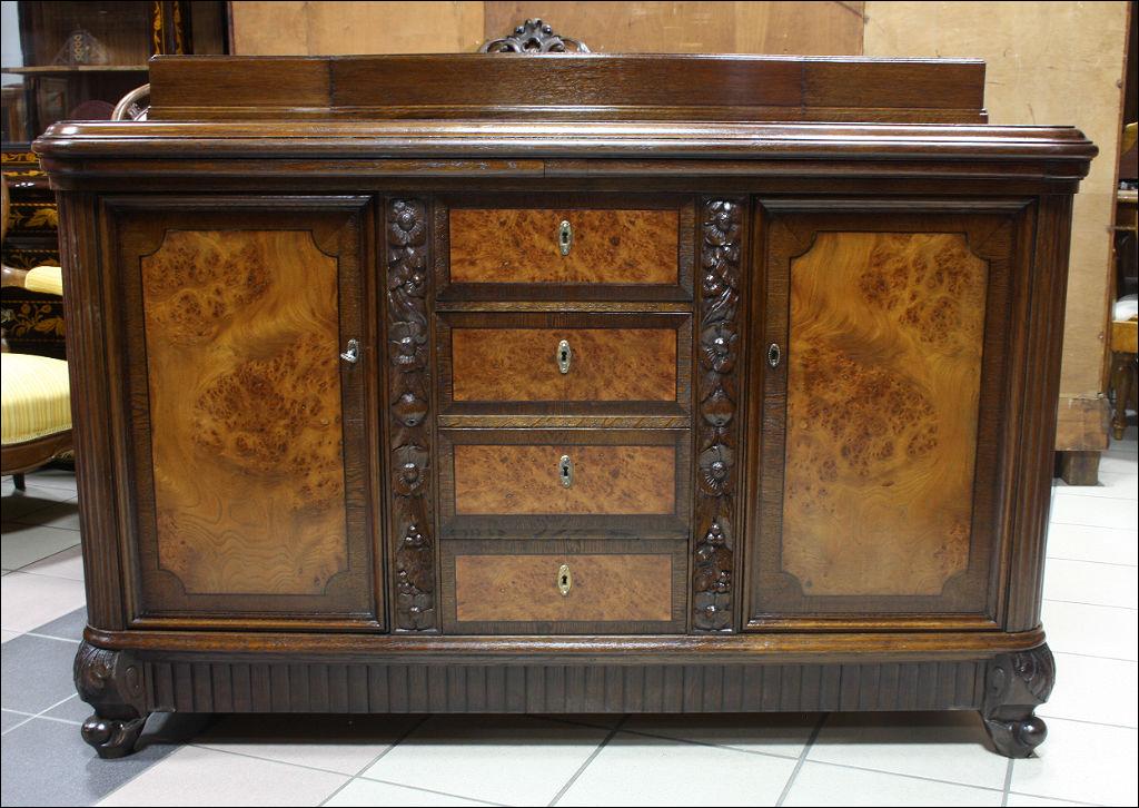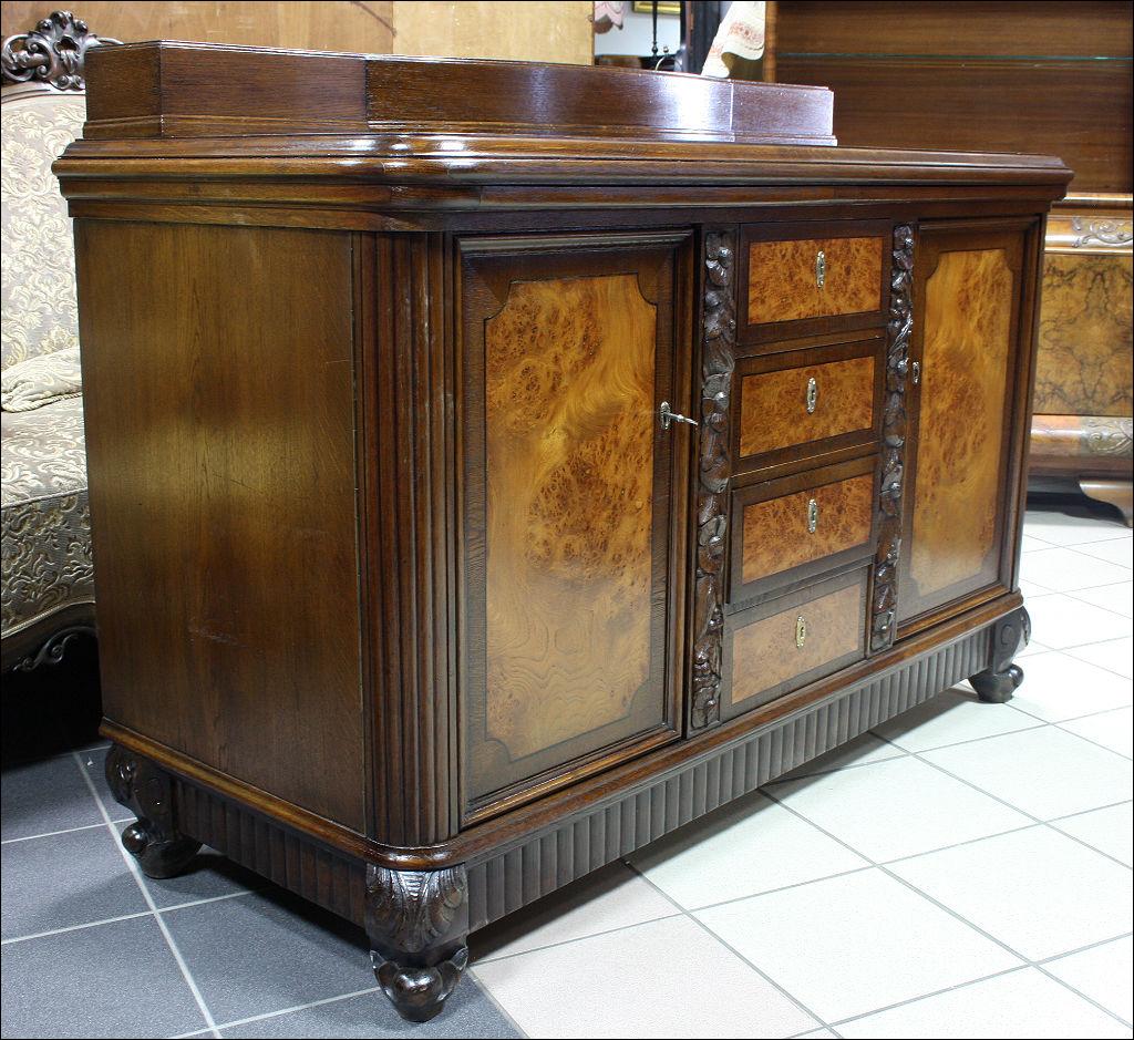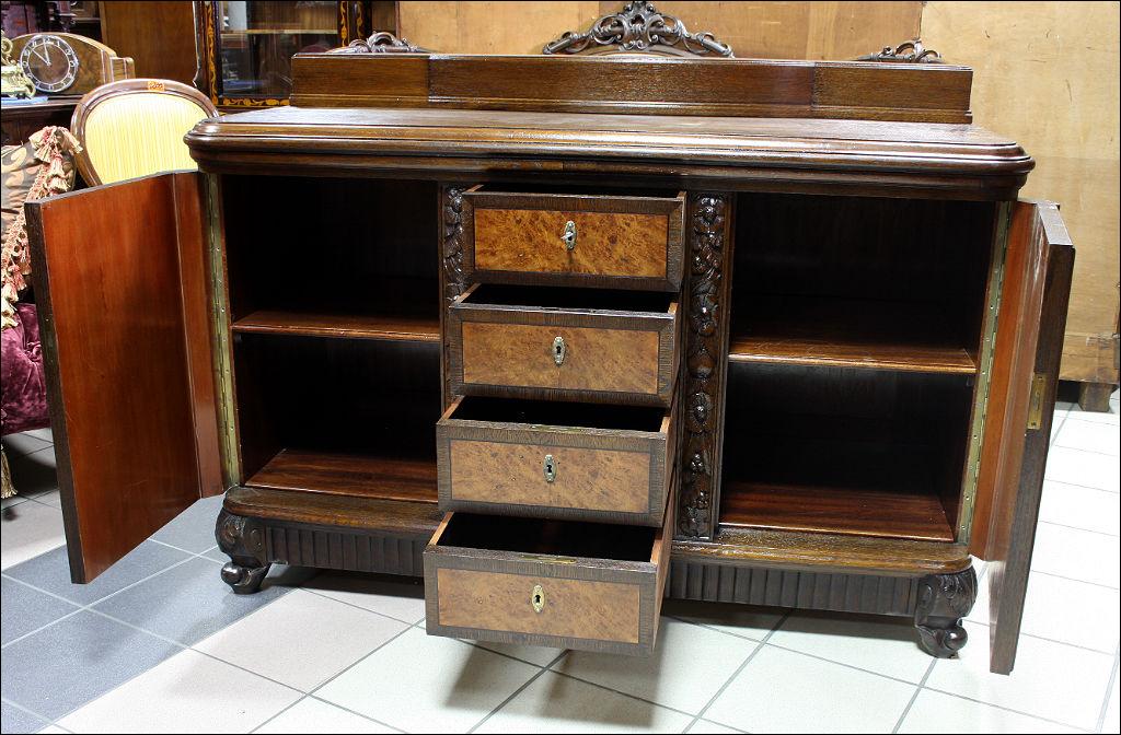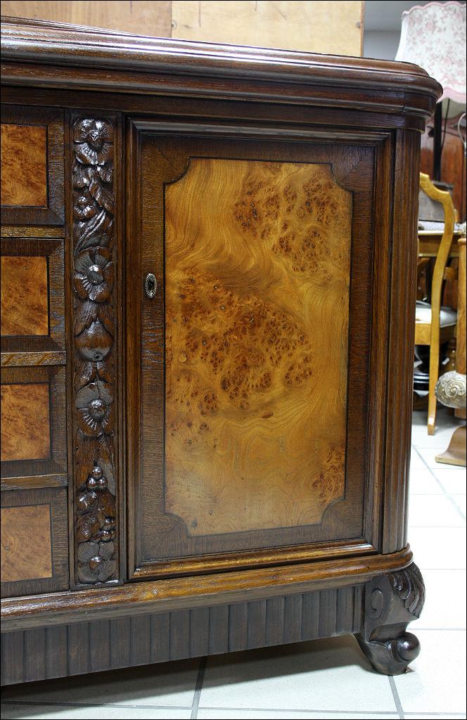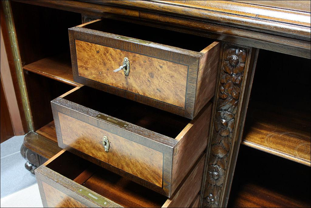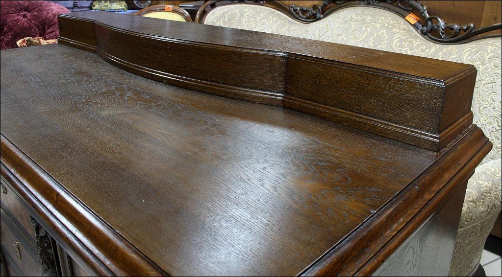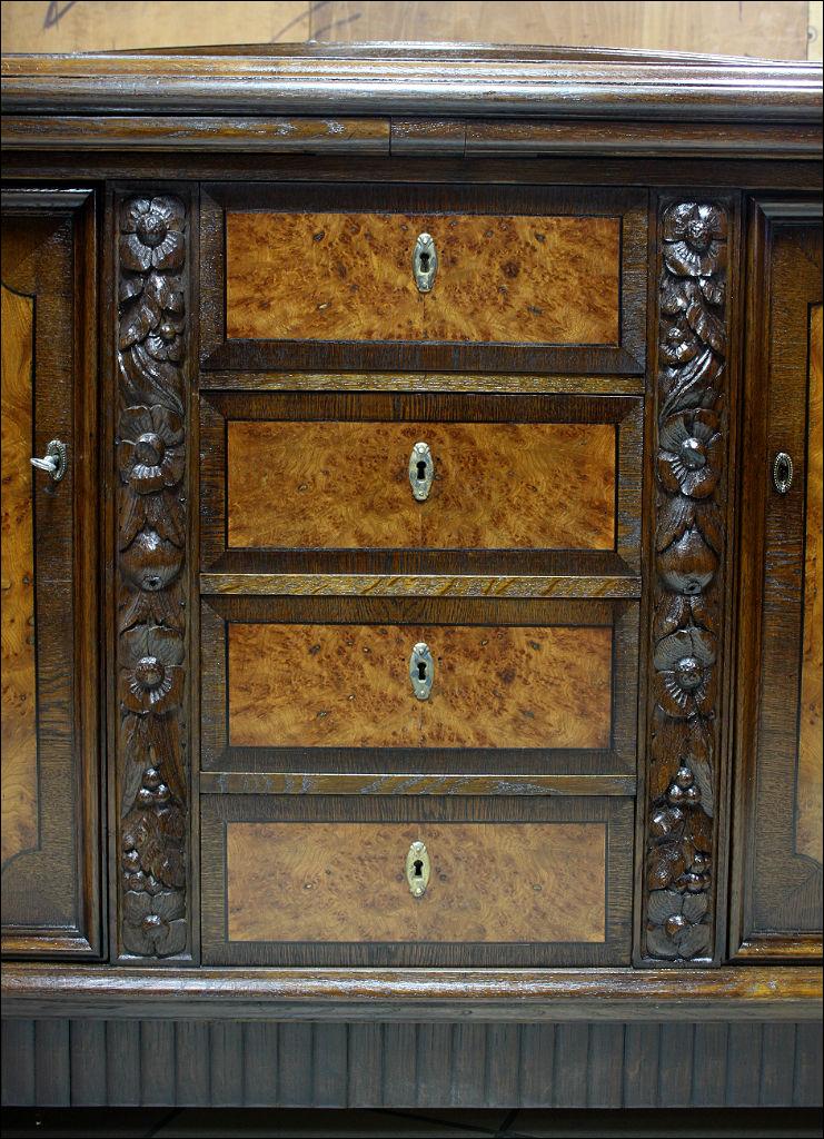 Piękna dębowa komoda-pomocnik pochodząca z kompletu mebli stanowiącego niegdyś wyposażenie jadalni. Wszystkie meble pochodzące z tego kompletu mamy w ofercie sprzedaży - w najbliższym czasie, po powrocie z pracowni renowacyjnej, pojawią się na stronie internetowej. Przedmiotem , jak w tytule, jest komoda-pomocnik. Mebel dębowy, zdobiony czeczotami orzechowymi w płycinach drzwiczek oraz szuflad. Nogi profilowane i rzeźbione.