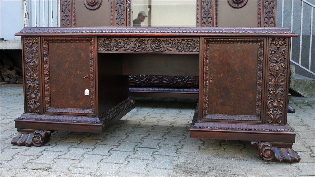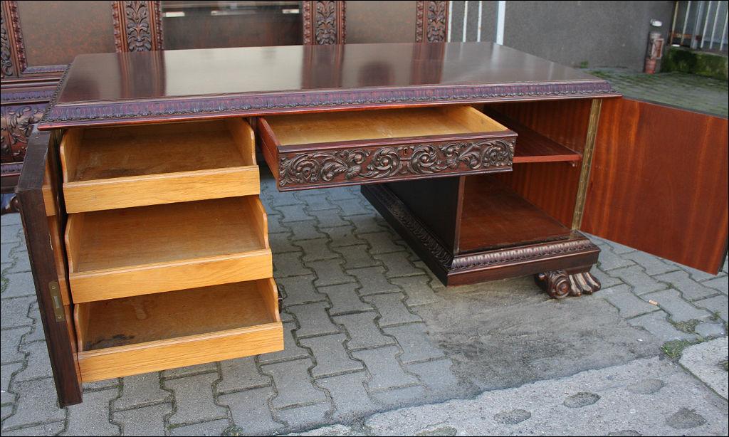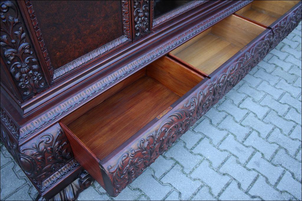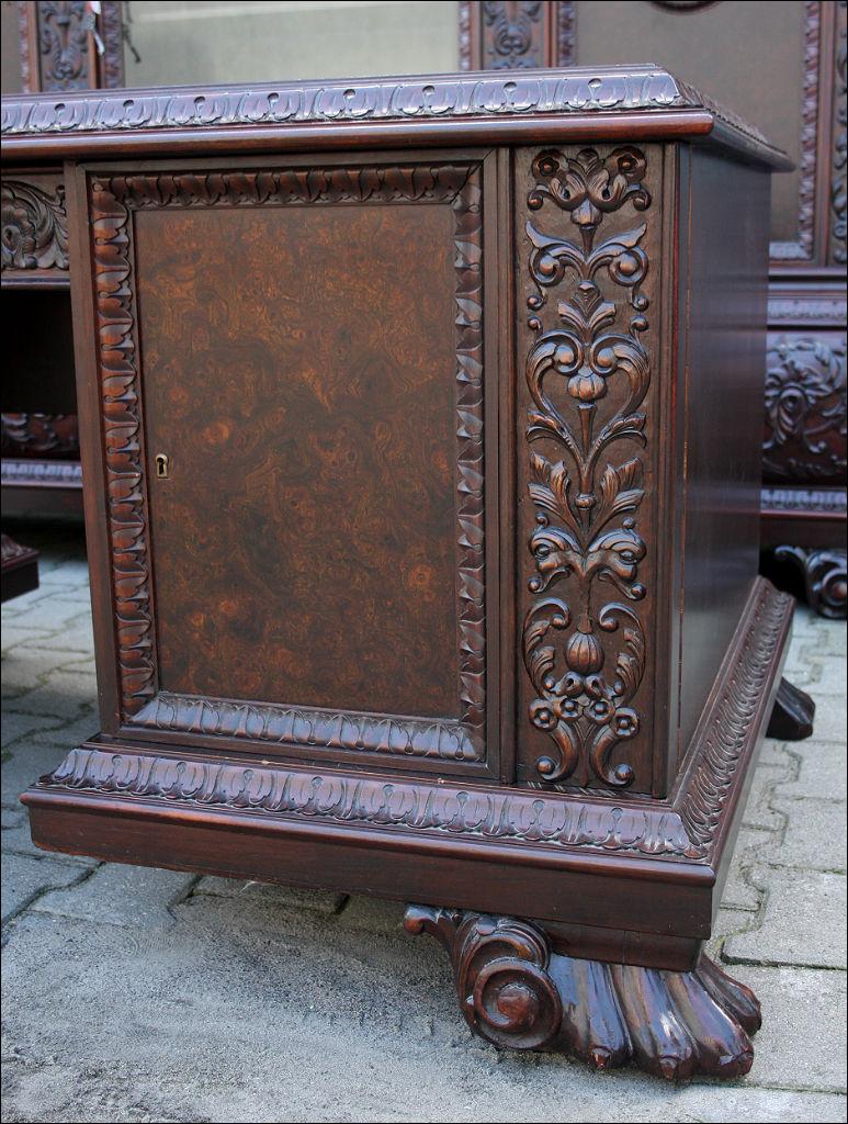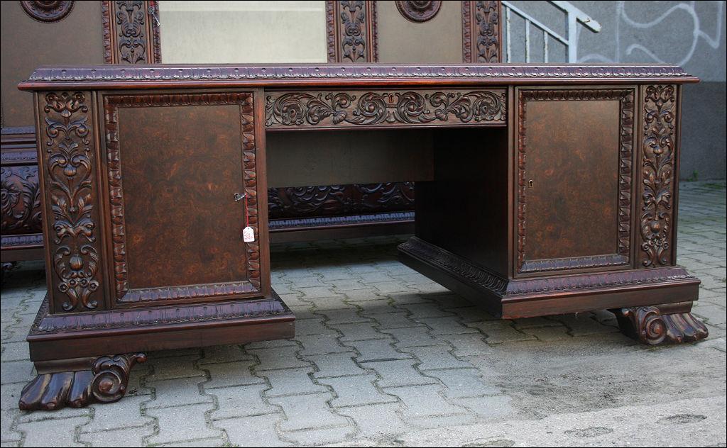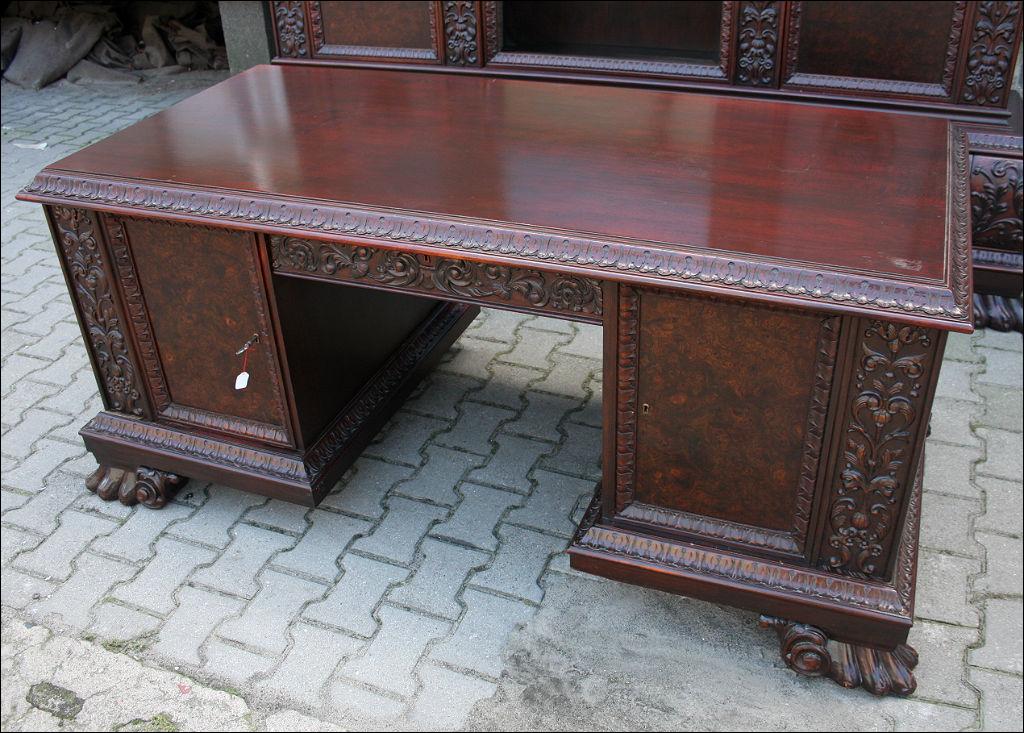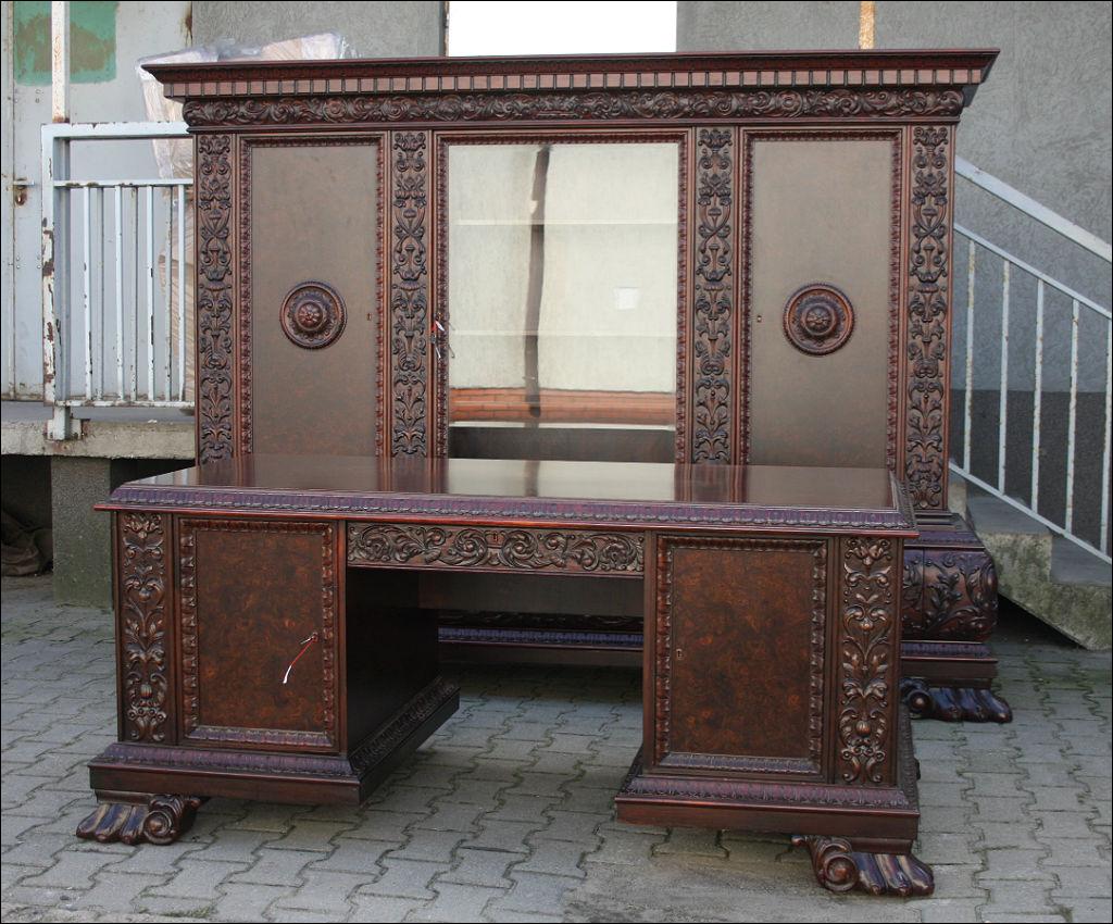 Piękny, orzechowy komplet mebli gabinetowych w skład którego wchodzą biblioteka i biurko. Doskonały przykład mebli, gdzie bogactwo zdobień idzie w parze z estetyką i wytwornością. Zharmonizowany układ snycerskich dekoracji w układzie pionowym - głównie na krawędziach mebli. Wyjątek stanową fronty szuflady - zarówno w biurku jak i bibliotece. Całość osadzona na na lwich łapach.