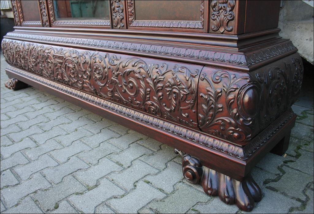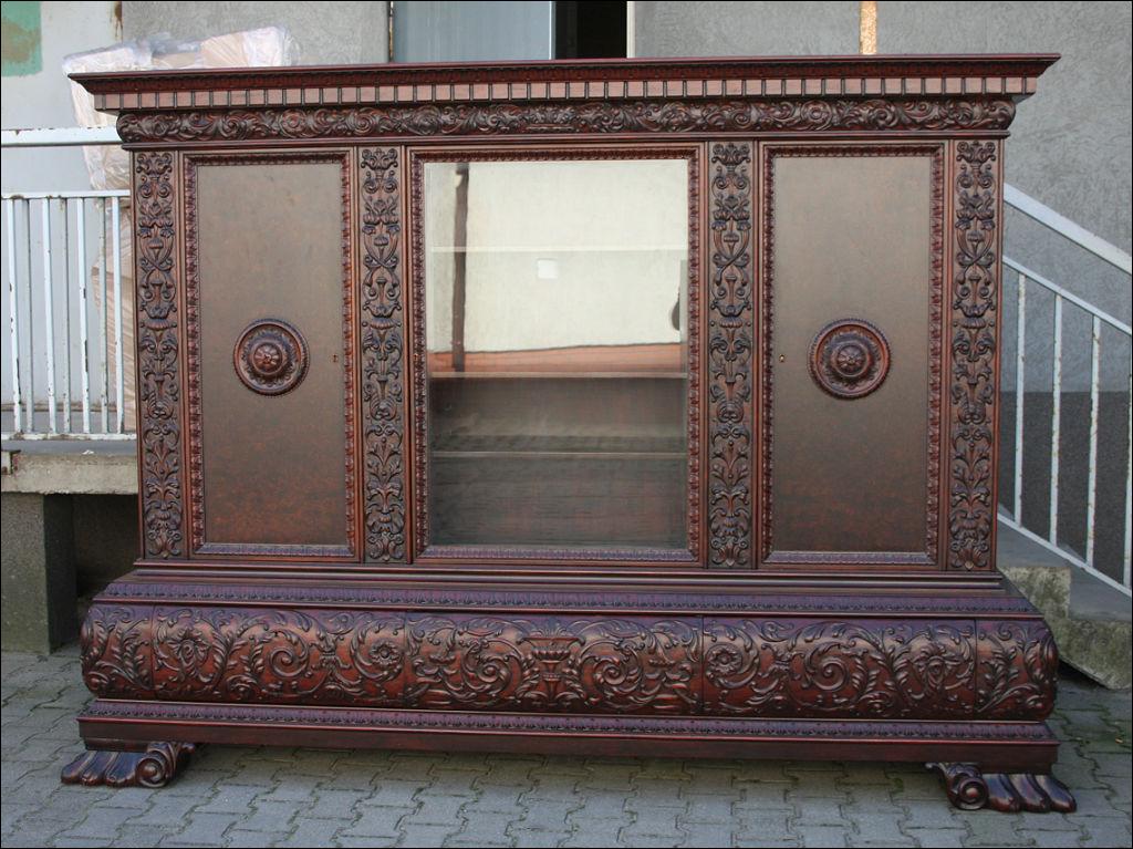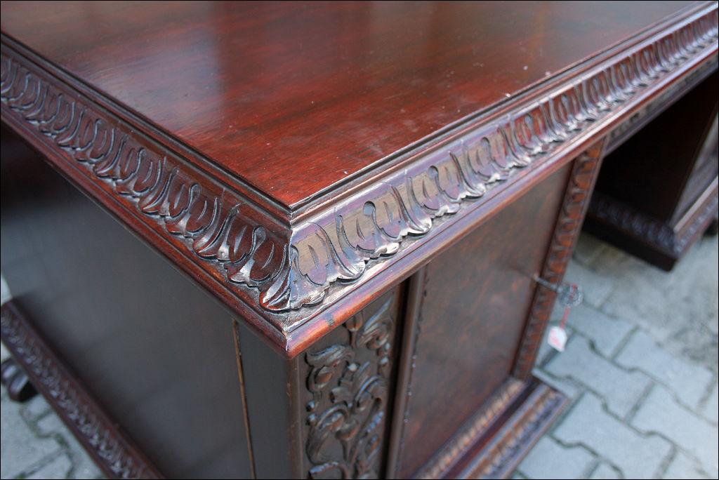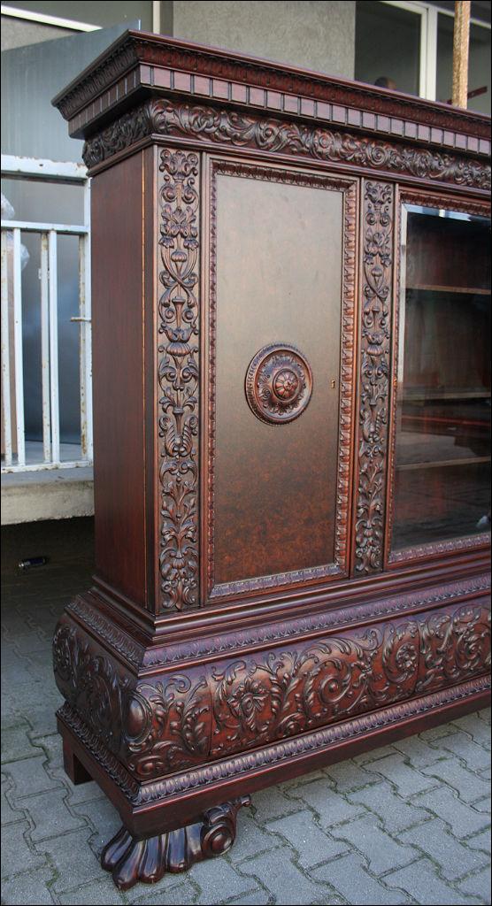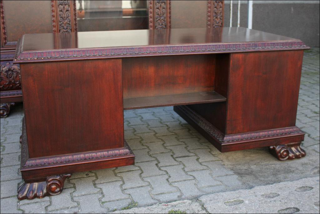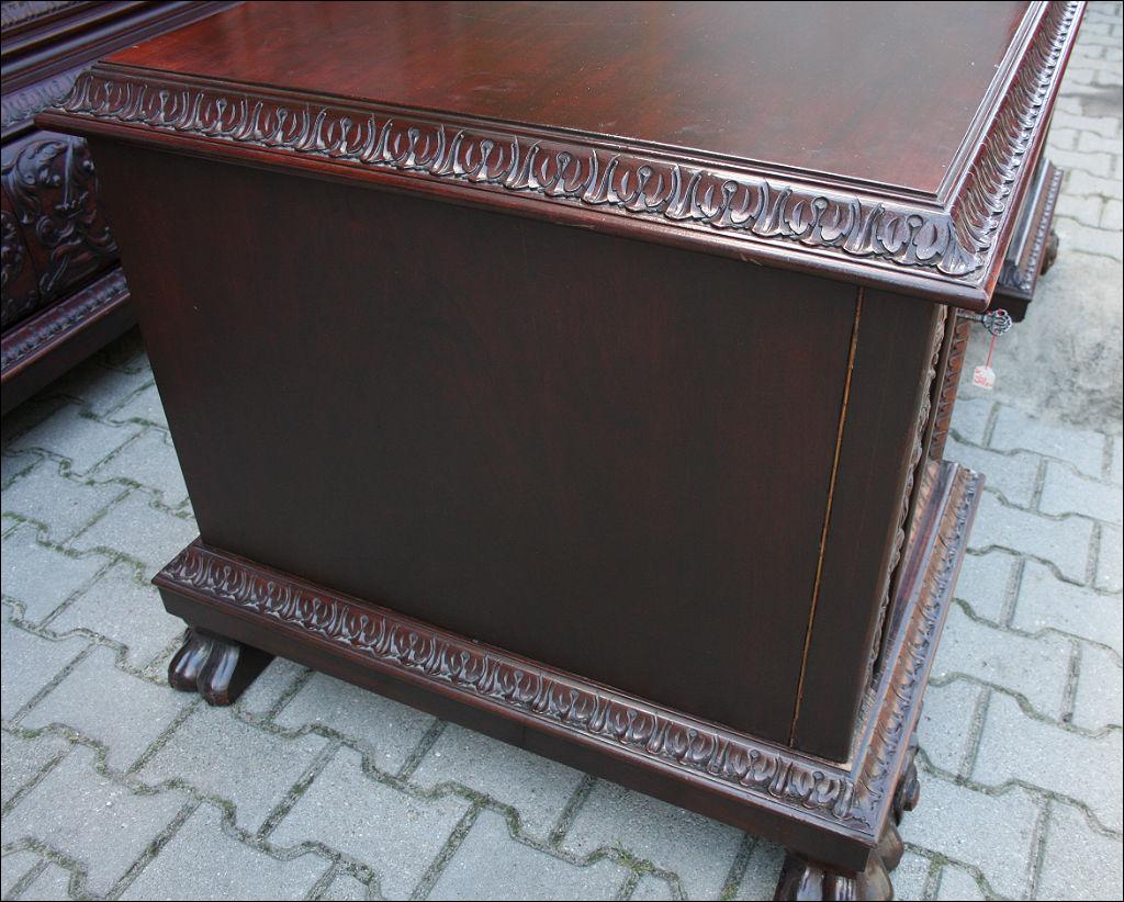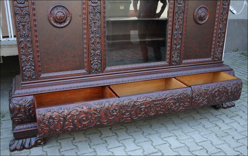 Piękny, orzechowy komplet mebli gabinetowych w skład którego wchodzą biblioteka i biurko. Doskonały przykład mebli, gdzie bogactwo zdobień idzie w parze z estetyką i wytwornością. Zharmonizowany układ snycerskich dekoracji w układzie pionowym - głównie na krawędziach mebli. Wyjątek stanową fronty szuflady - zarówno w biurku jak i bibliotece. Całość osadzona na na lwich łapach.
