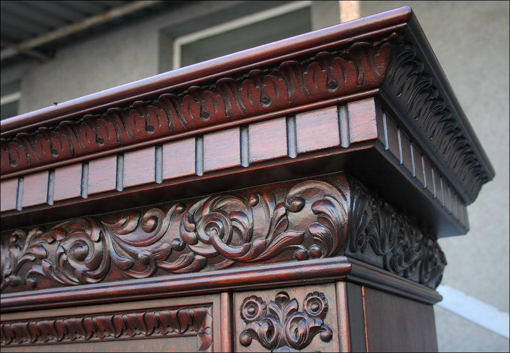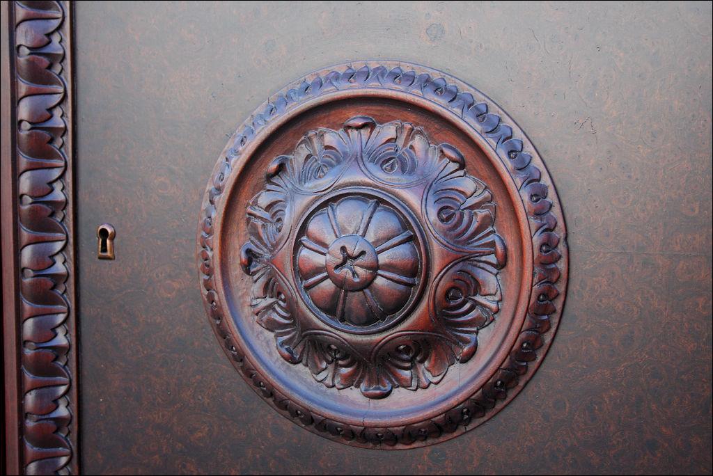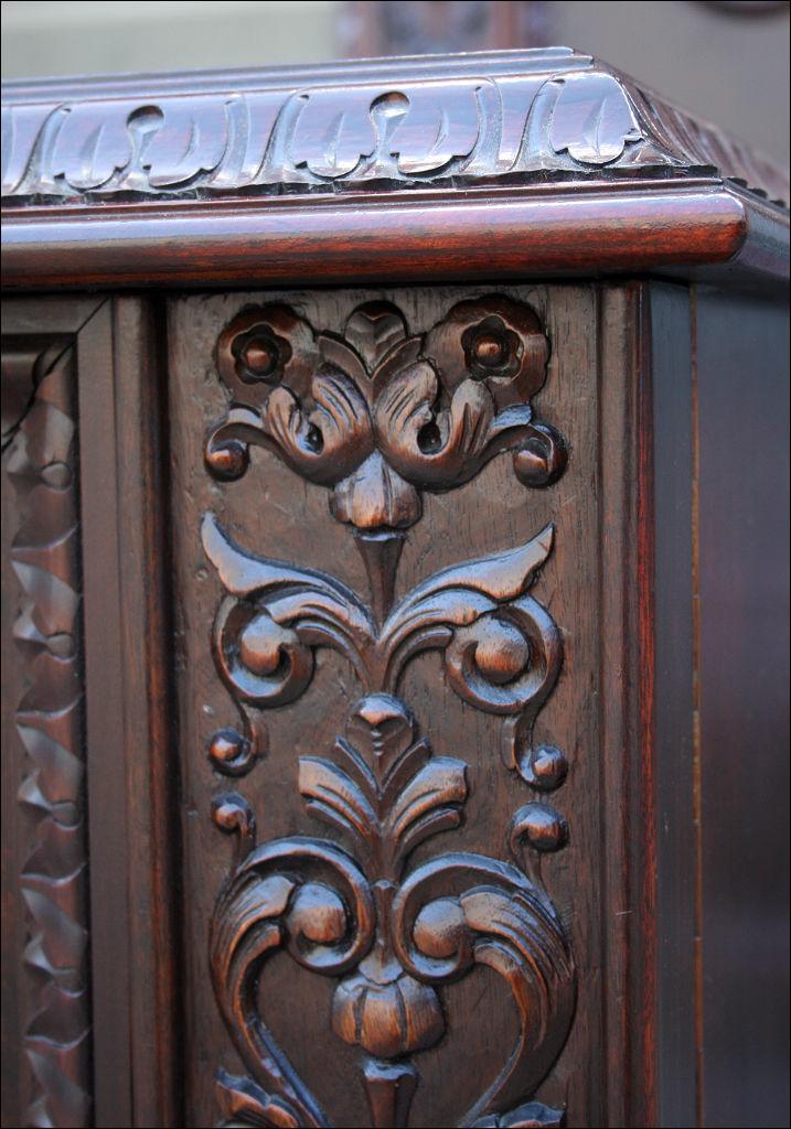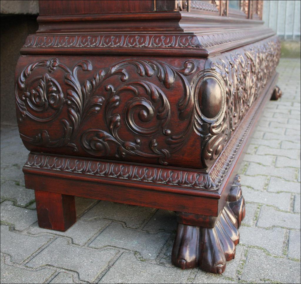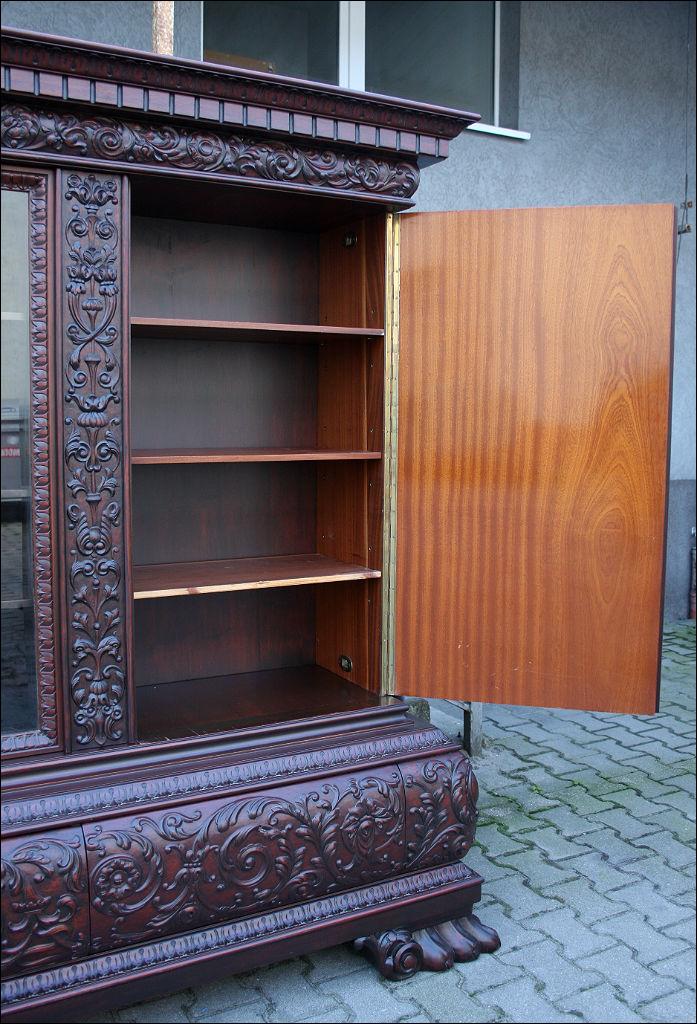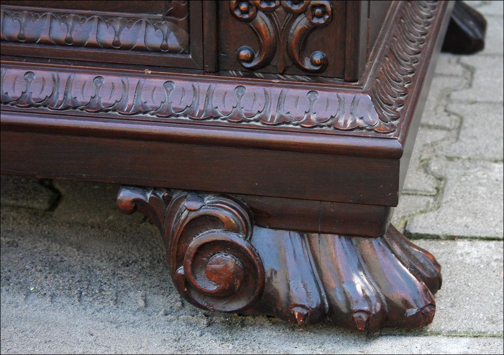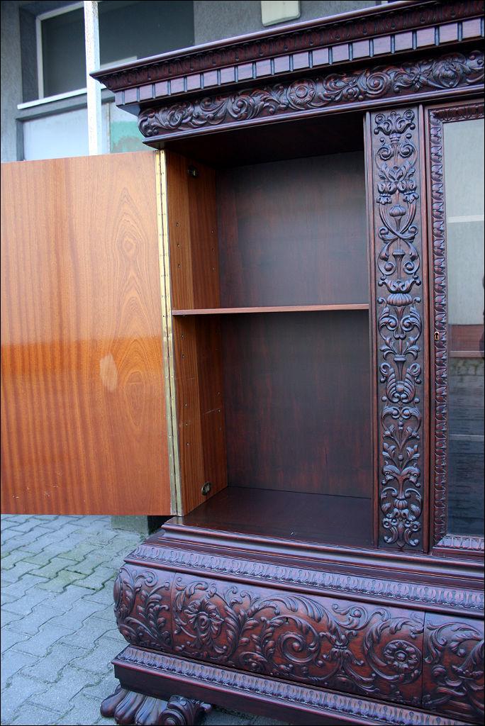 Piękny, orzechowy komplet mebli gabinetowych w skład którego wchodzą biblioteka i biurko. Doskonały przykład mebli, gdzie bogactwo zdobień idzie w parze z estetyką i wytwornością. Zharmonizowany układ snycerskich dekoracji w układzie pionowym - głównie na krawędziach mebli. Wyjątek stanową fronty szuflady - zarówno w biurku jak i bibliotece. Całość osadzona na na lwich łapach.