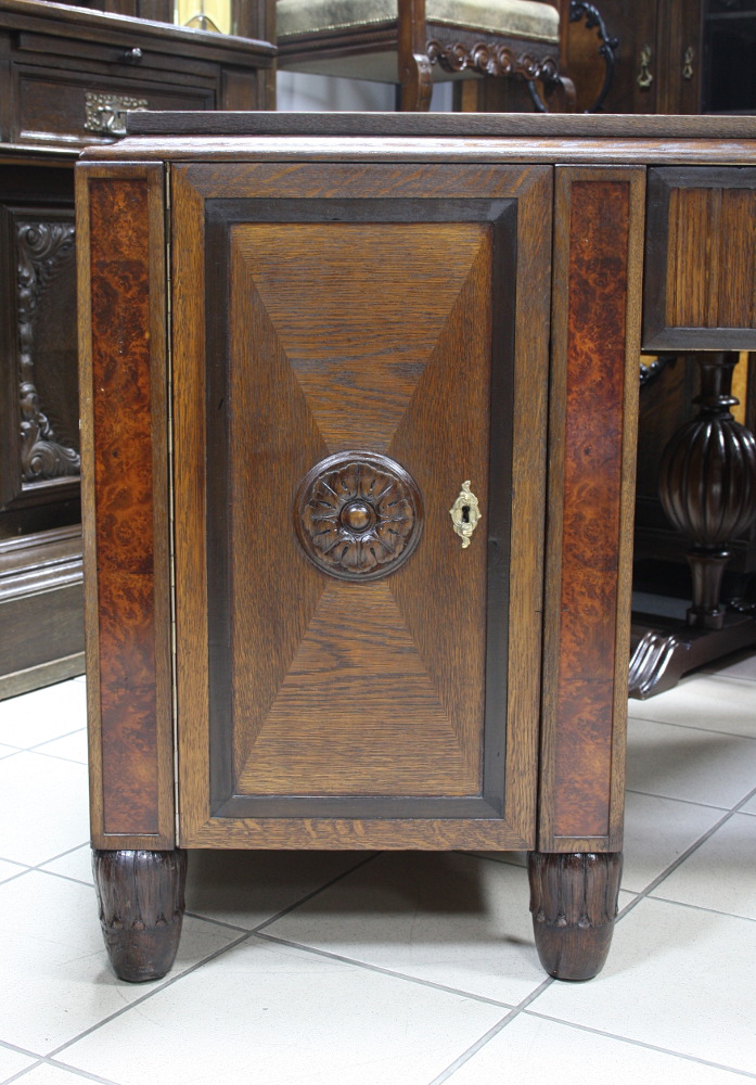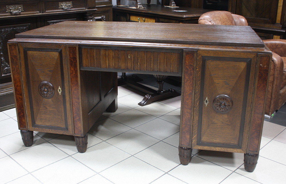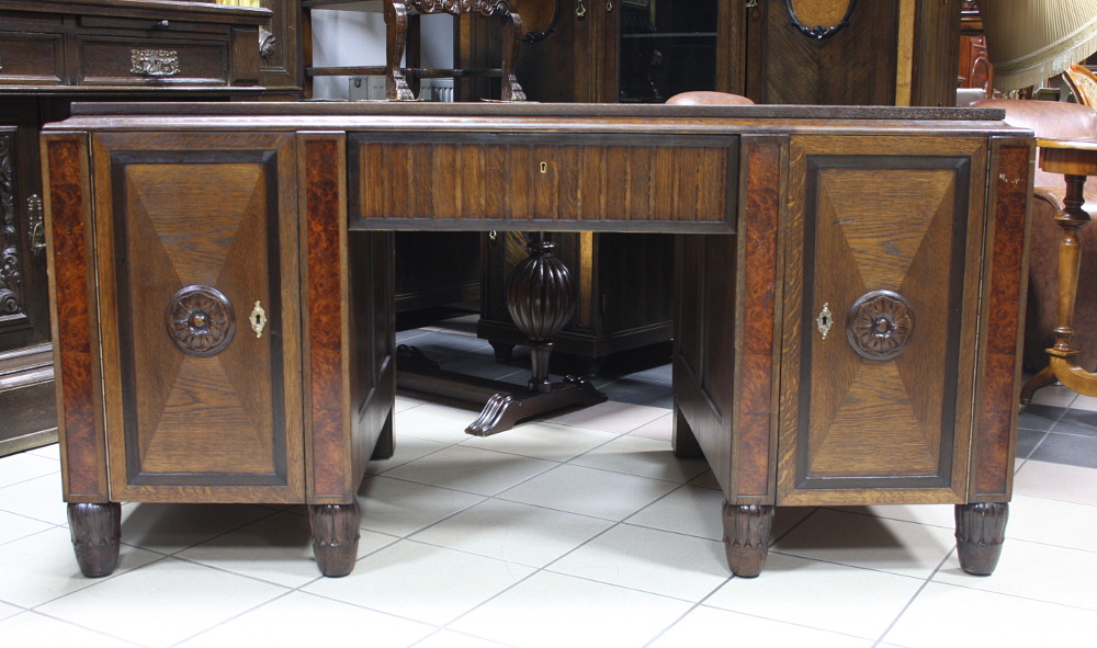 Ciekawe, dębowe biurko z okresu międzywojennego. Poszczególne fragmenty frontu mebla tworzą wyraźne wzory geometryczne - płyciny drzwiczek wykładane fornirem w kształcie piramid-trójkątów, otoczone barwionymi na ciemny kolor listwami dębowymi. Po obydwu stronach drzwiczek znajdują się szerokie, pionowe listwy z czeczotą orzechową. Nogi biurka toczone oraz rzeźbione.