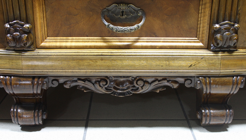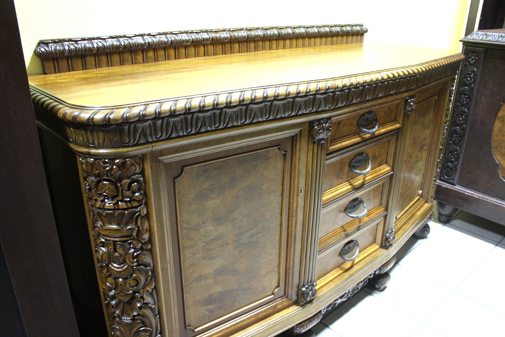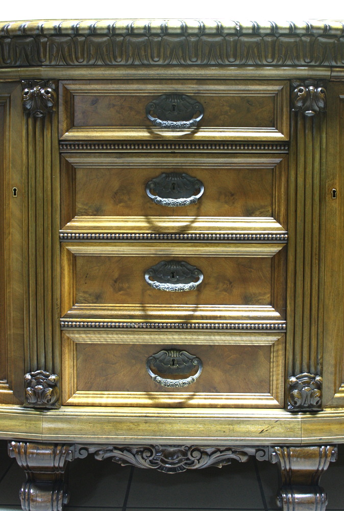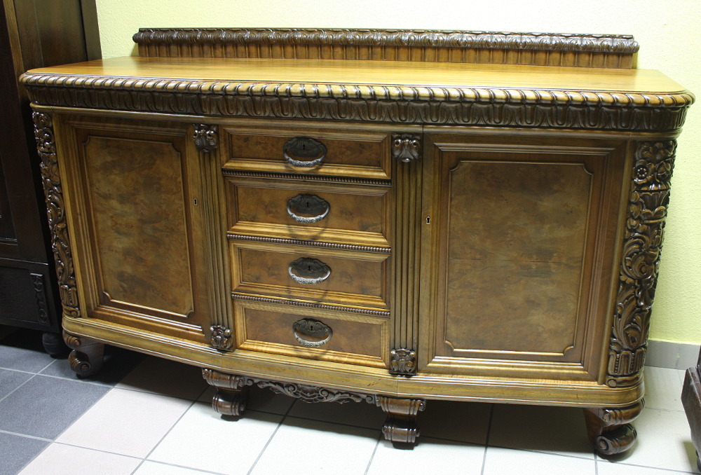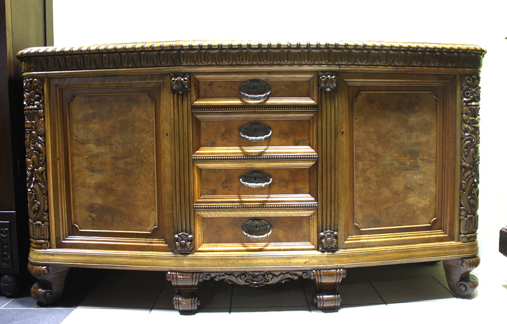 Piękny, orzechowy bufet z okresu międzywojennego. Krawędzie meble z bogatymi, snycerskimi zdobieniami, fronty drzwiczek oraz szuflad wyłożone czeczotą orzechową, nogi profilowane oraz rzeźbione. Dwie szafki oraz cztery szuflady zamykane na klucz plus dwa wysuwane blaty pokryte szybą. Mebel ten jest kolejnym przykładem, że bogactwo zdobień może iść w parze z wytwornością.