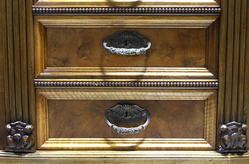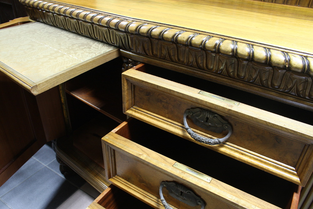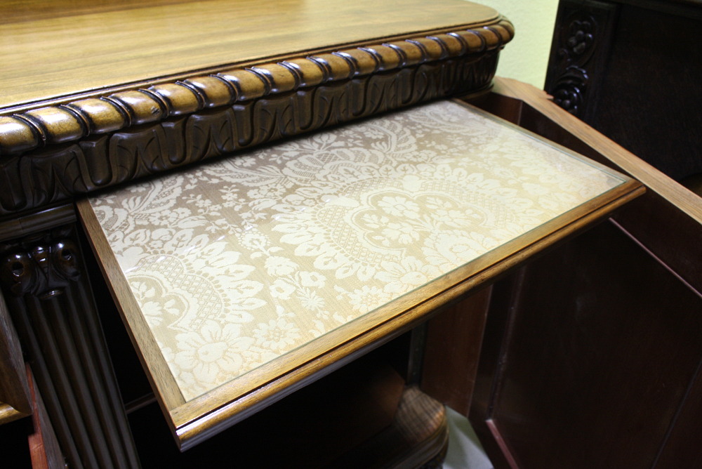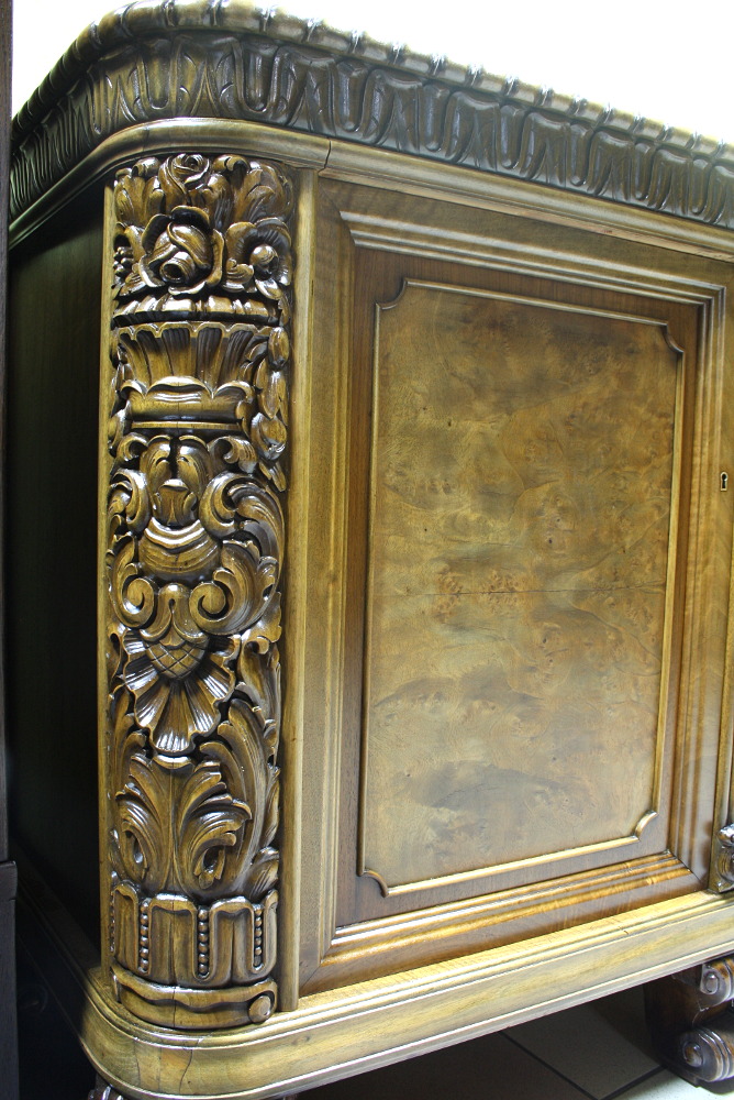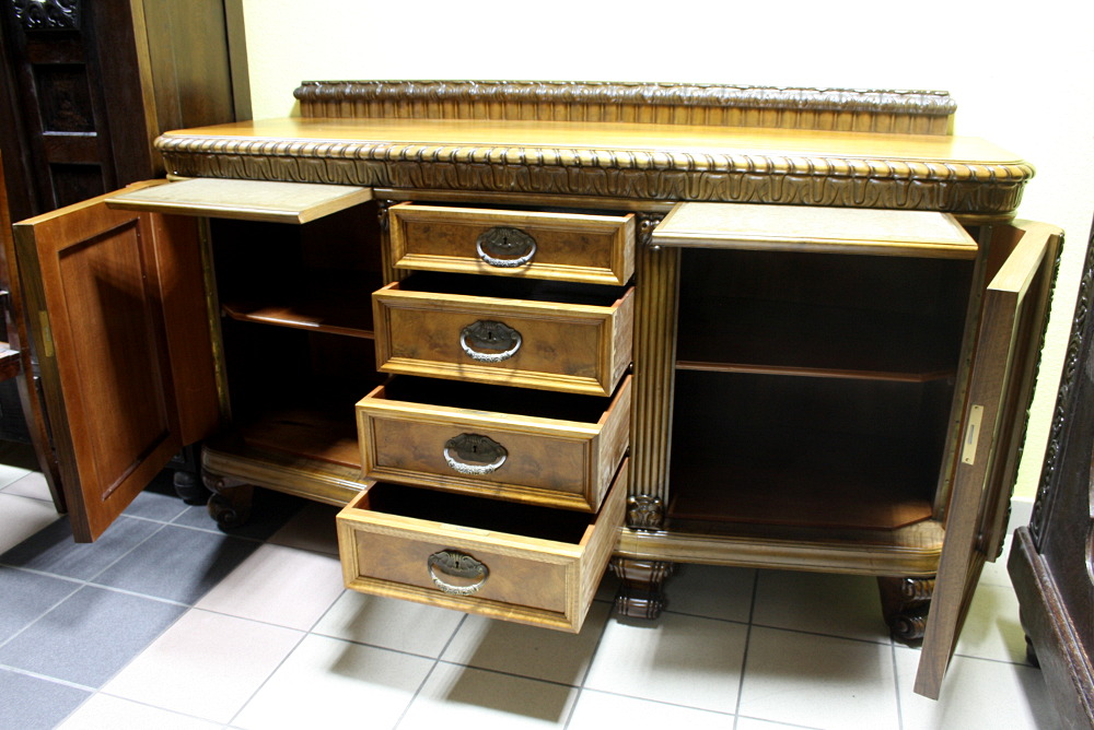 Piękny, orzechowy bufet z okresu międzywojennego. Krawędzie meble z bogatymi, snycerskimi zdobieniami, fronty drzwiczek oraz szuflad wyłożone czeczotą orzechową, nogi profilowane oraz rzeźbione. Dwie szafki oraz cztery szuflady zamykane na klucz plus dwa wysuwane blaty pokryte szybą. Mebel ten jest kolejnym przykładem, że bogactwo zdobień może iść w parze z wytwornością.